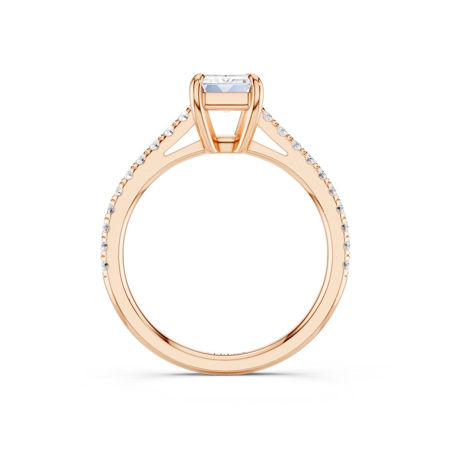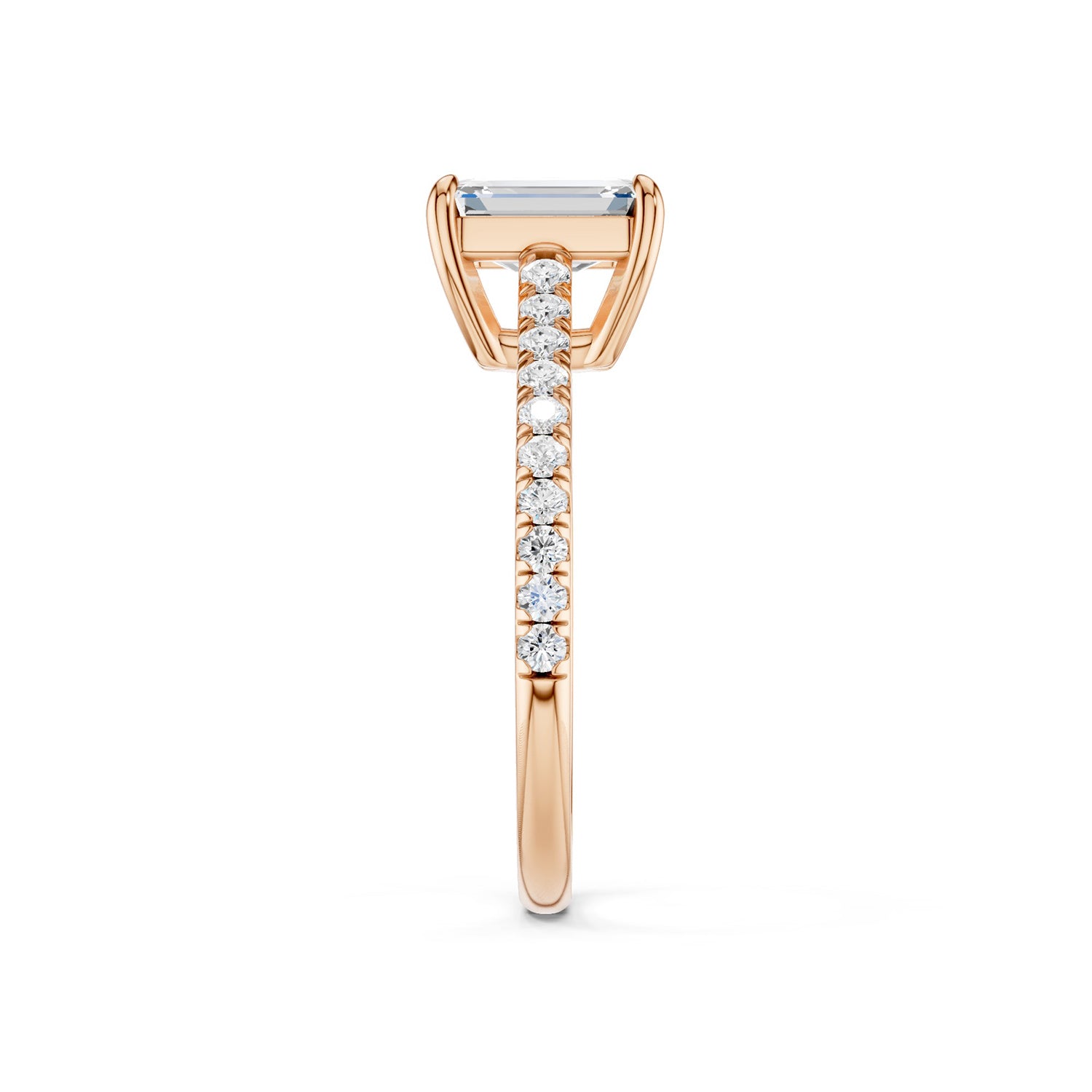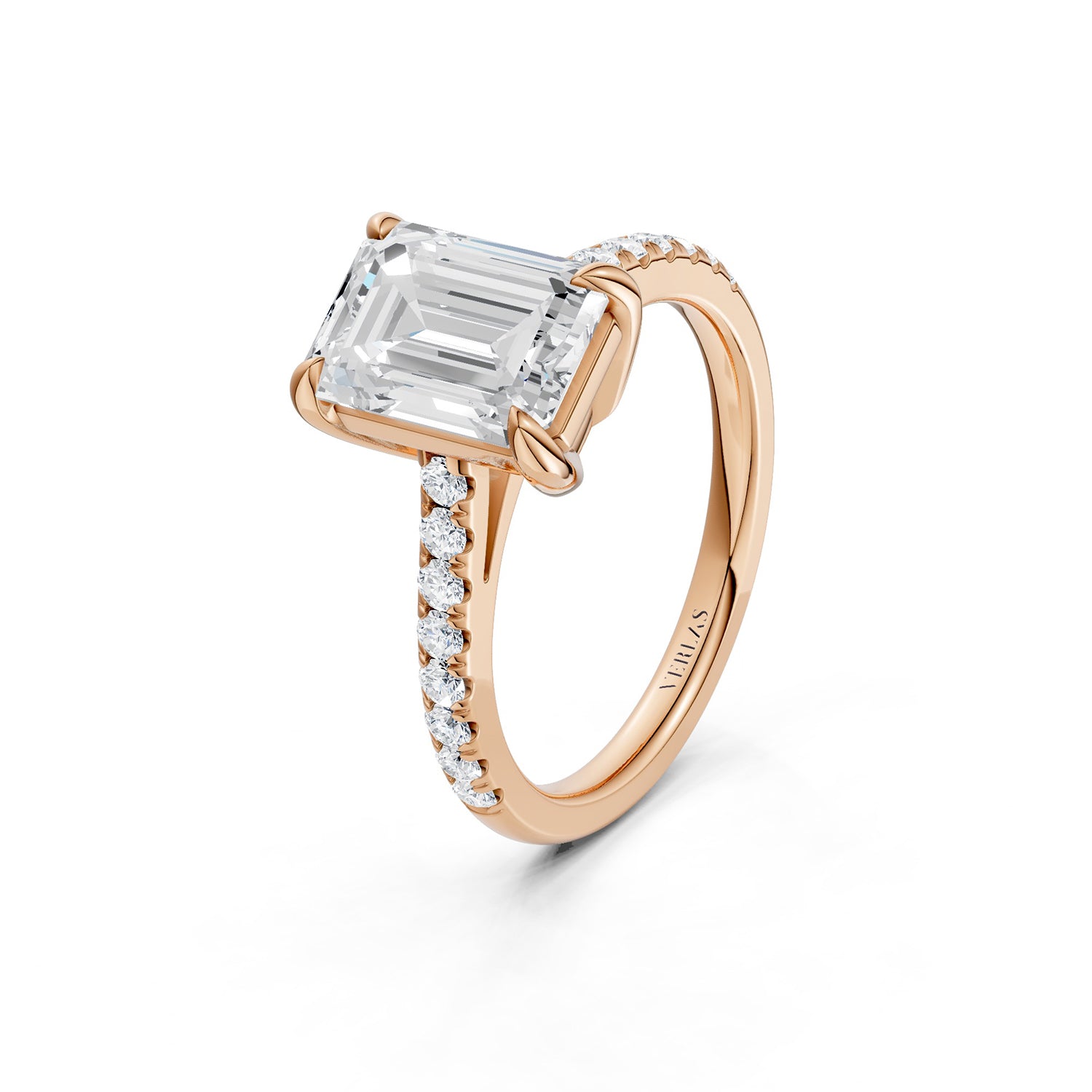 The emerald-cut lab-grown engagement ring is cut for brilliance with four prongs, giving it a feminine spirit. A lustrous band of micro-pavé-set diamonds lends these brilliantly-designed Atmos ring a modern edge.