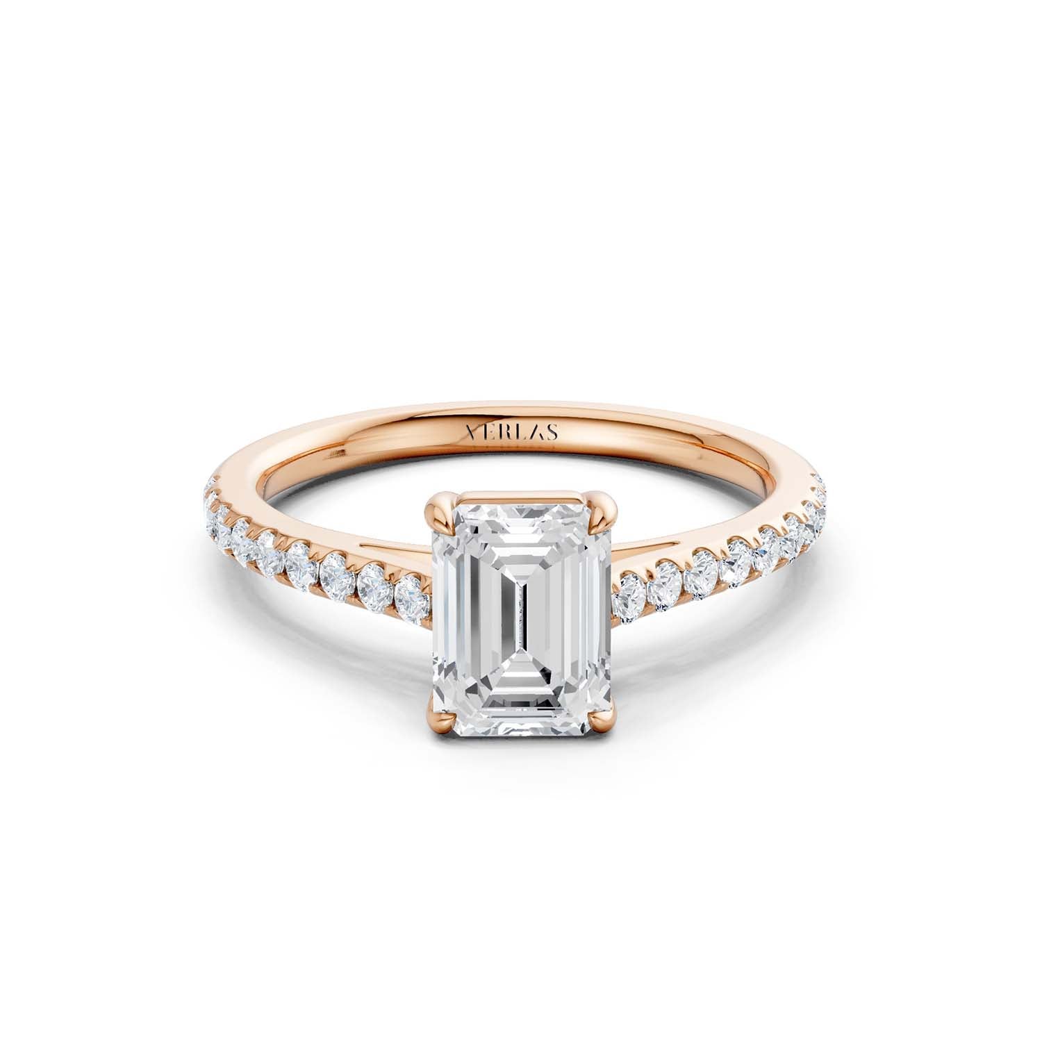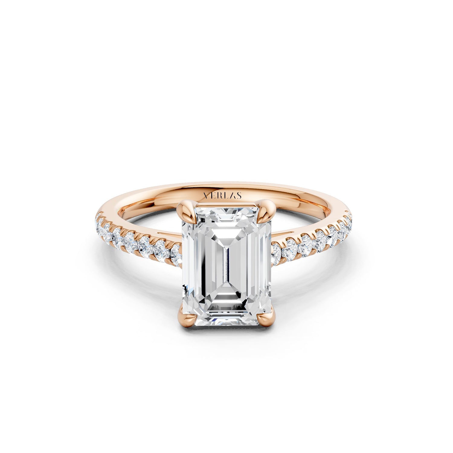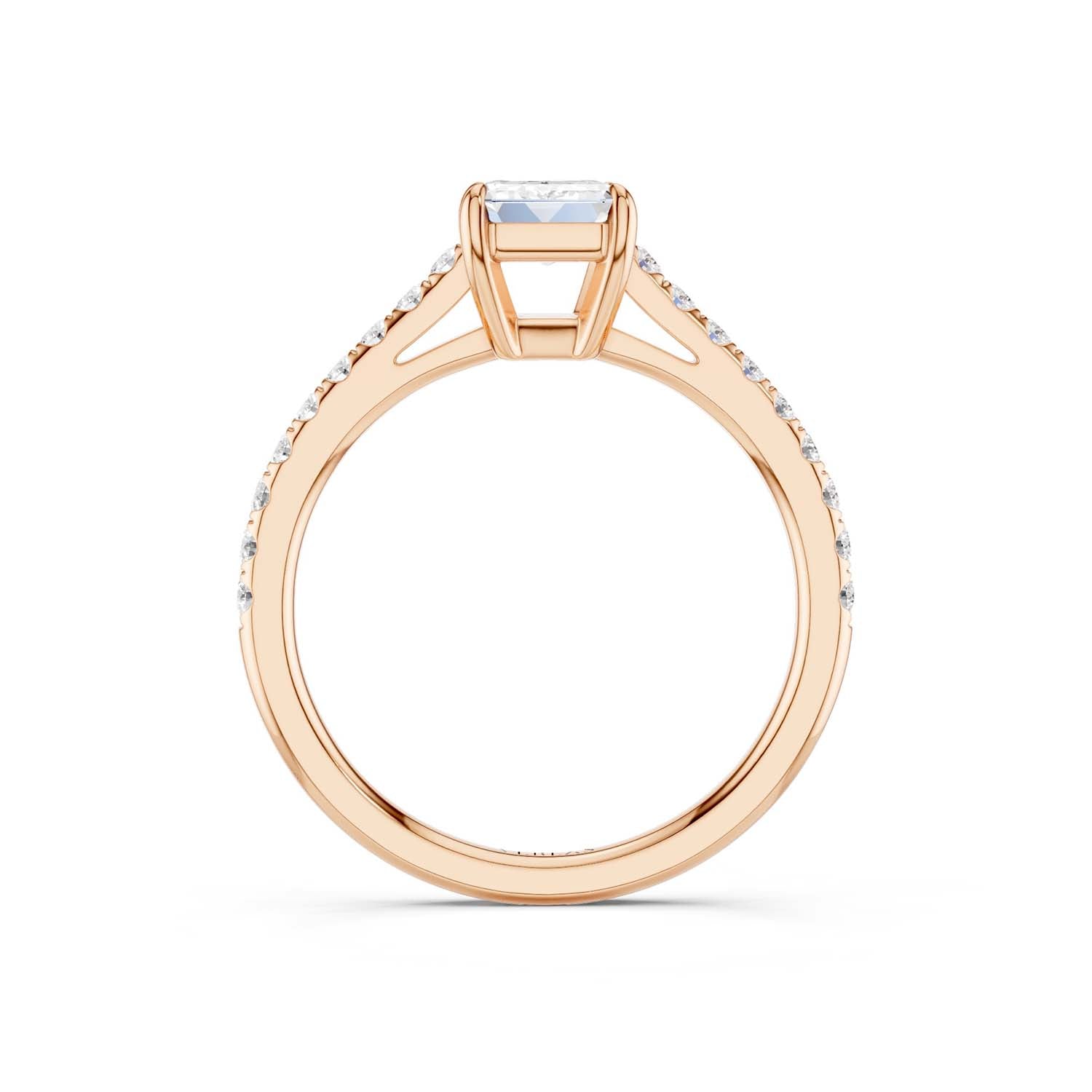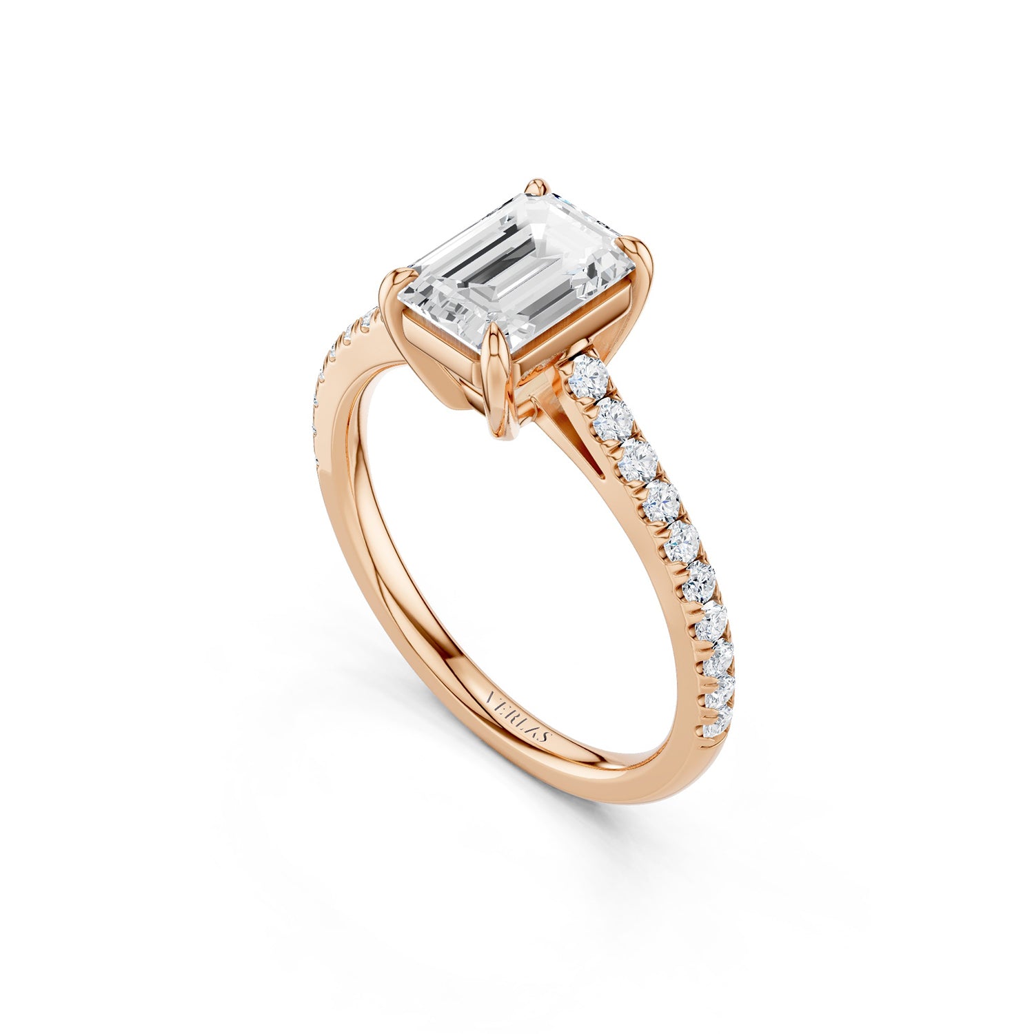 The emerald-cut lab-grown engagement ring is cut for brilliance with four prongs, giving it a feminine spirit. A lustrous band of micro-pavé-set diamonds lends these brilliantly-designed Atmos ring a modern edge.