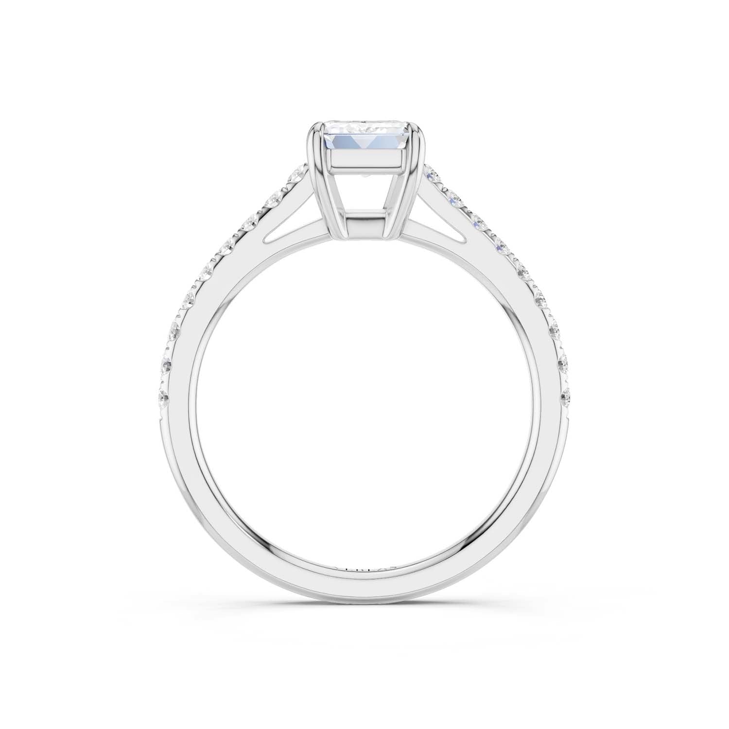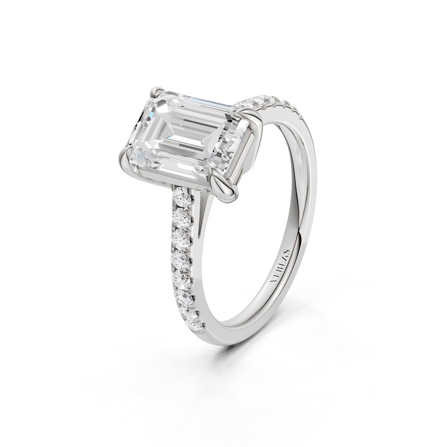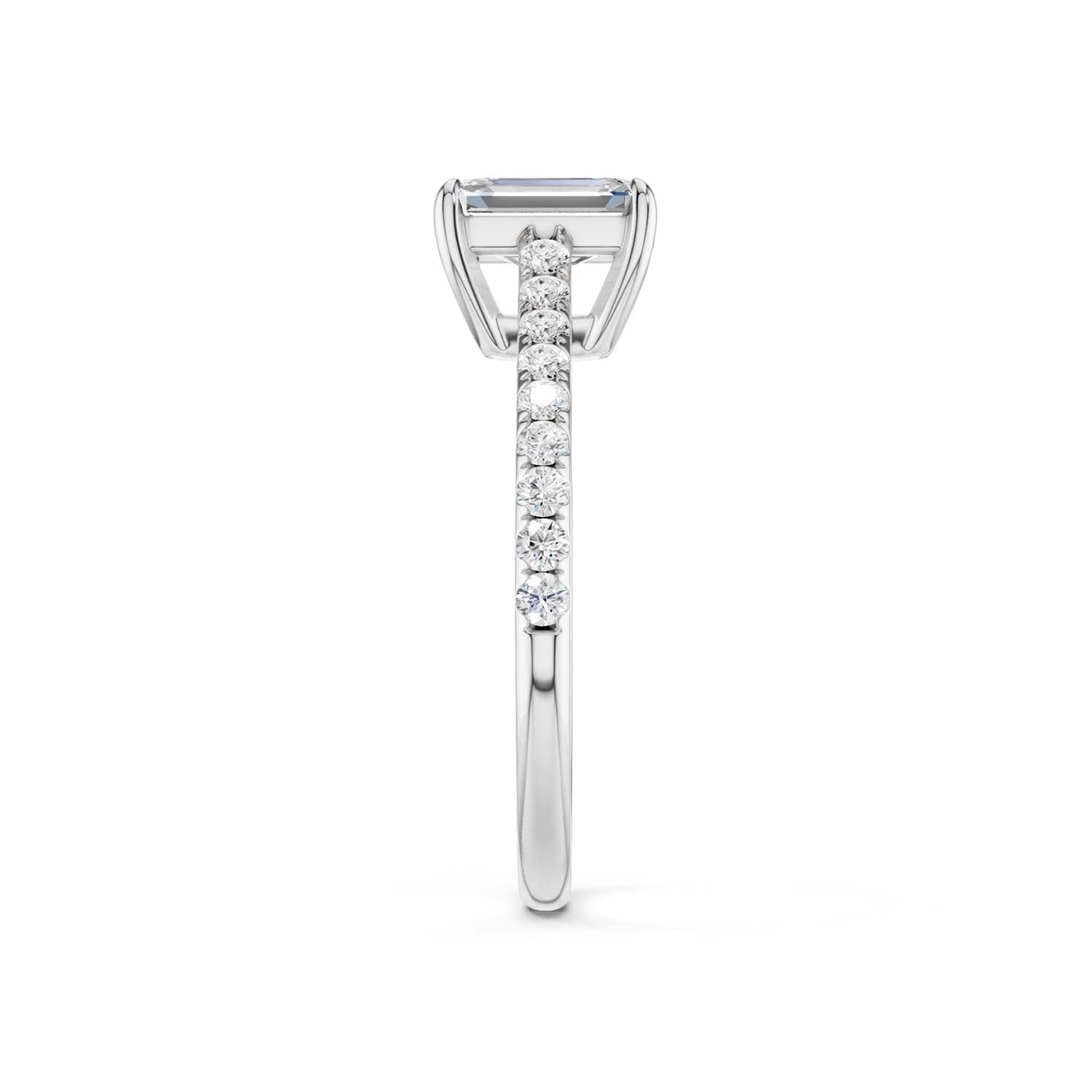 The emerald-cut lab-grown engagement ring is cut for brilliance with four prongs, giving it a feminine spirit. A lustrous band of micro-pavé-set diamonds lends these brilliantly-designed Atmos ring a modern edge.