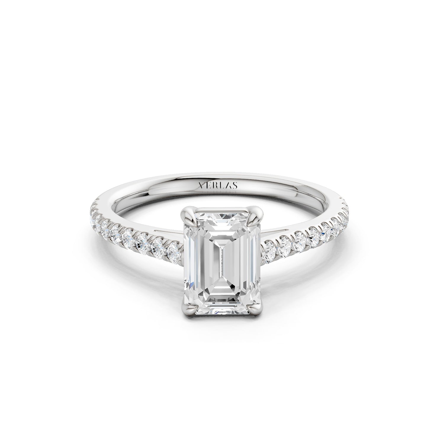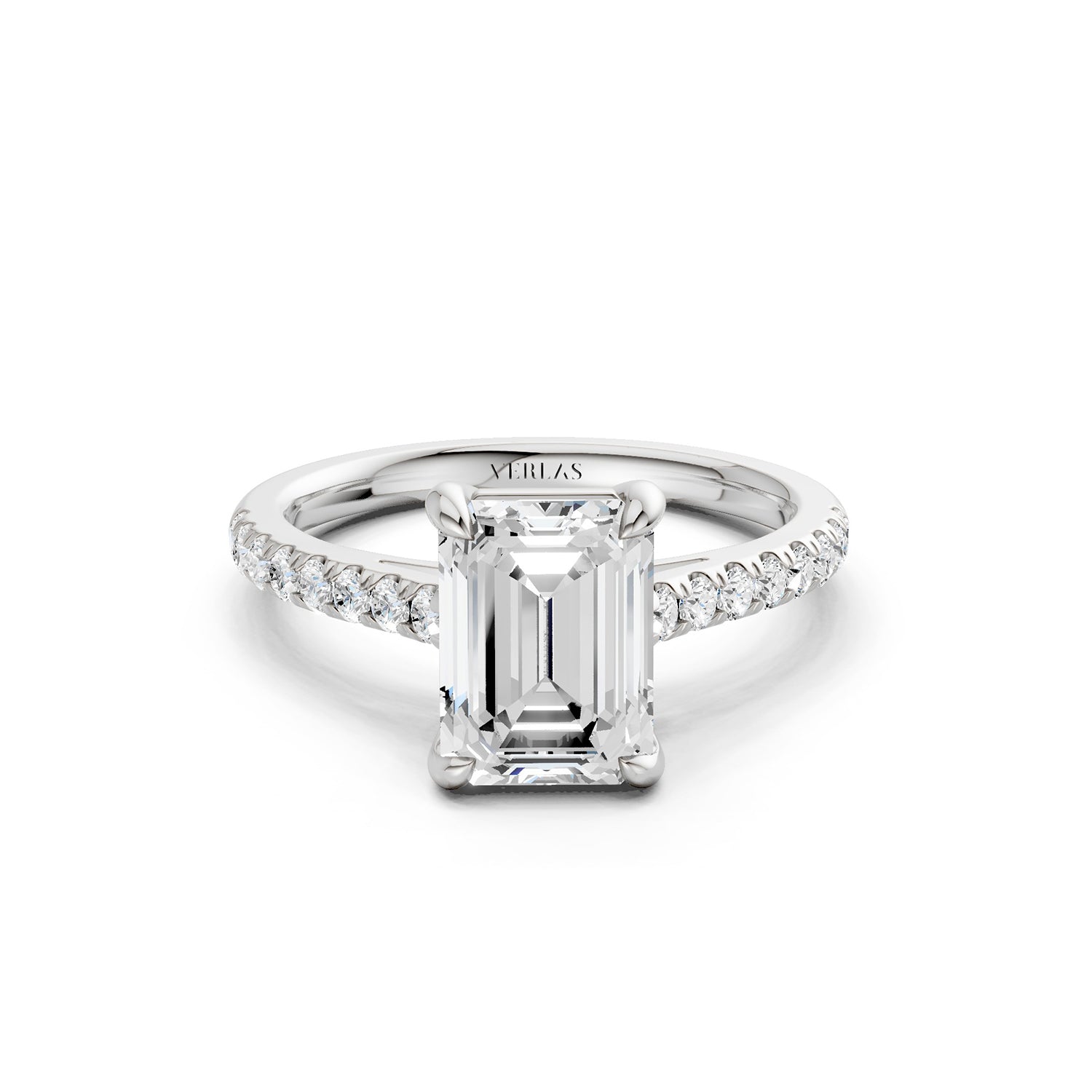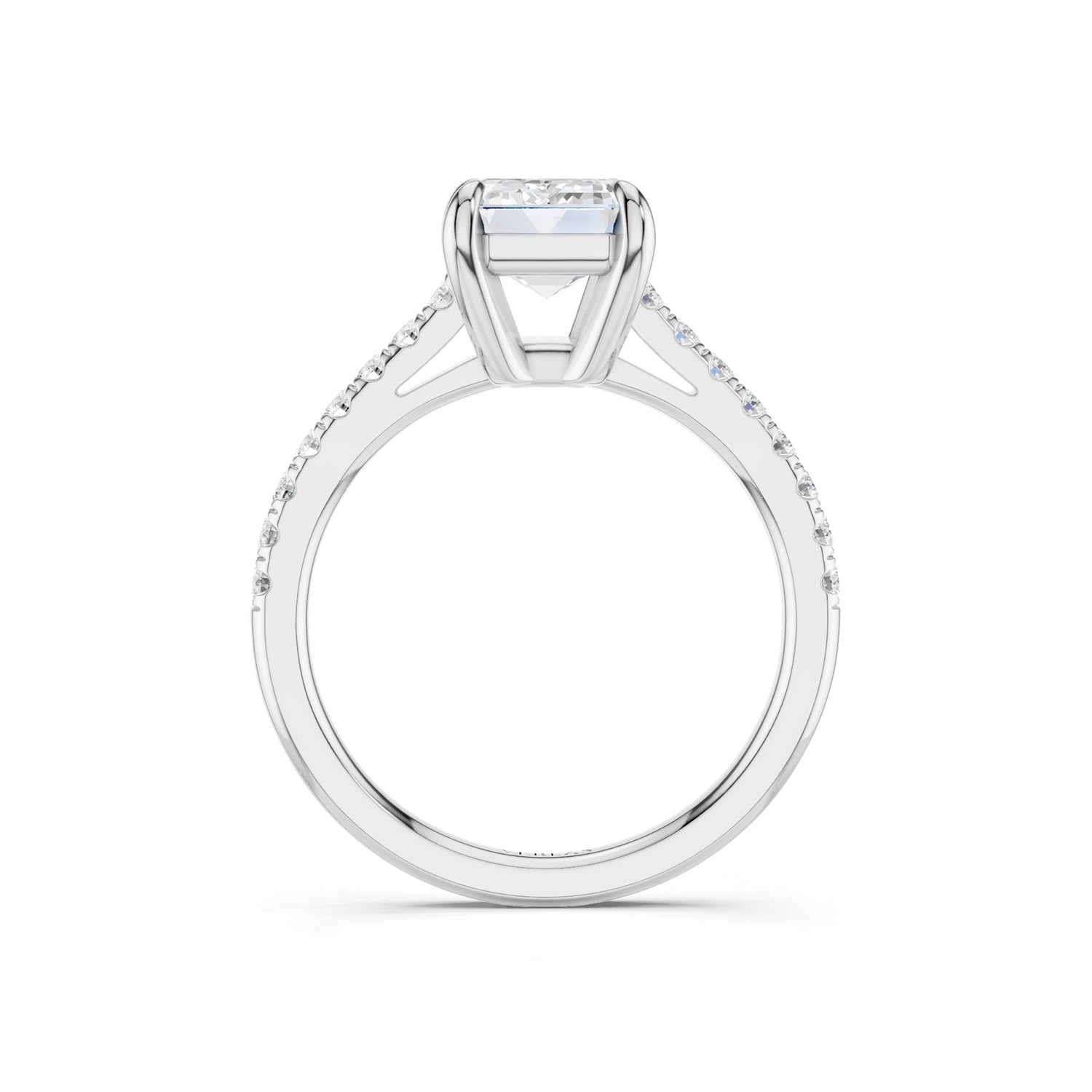 The emerald-cut lab-grown engagement ring is cut for brilliance with four prongs, giving it a feminine spirit. A lustrous band of micro-pavé-set diamonds lends these brilliantly-designed Atmos ring a modern edge.
