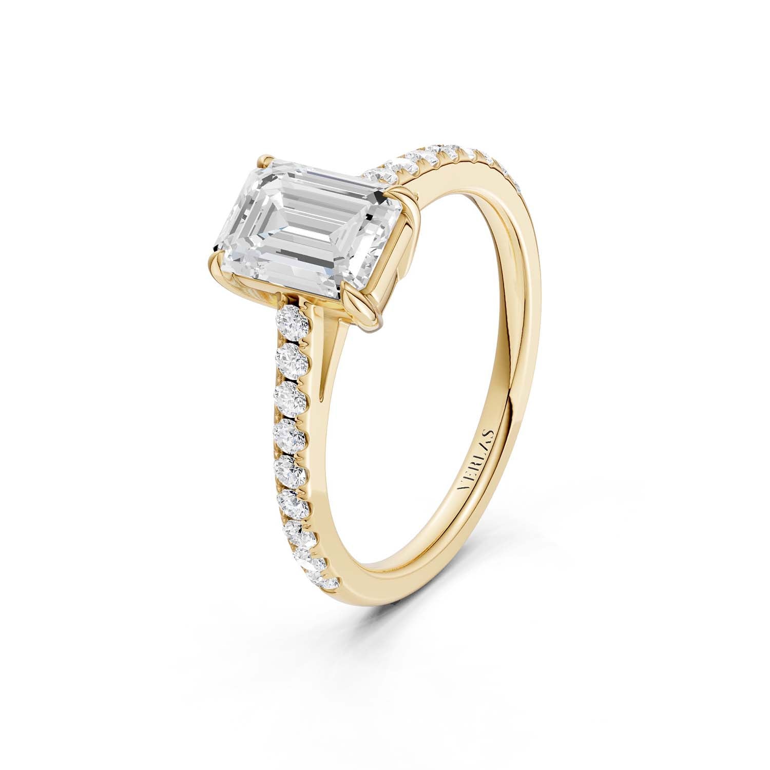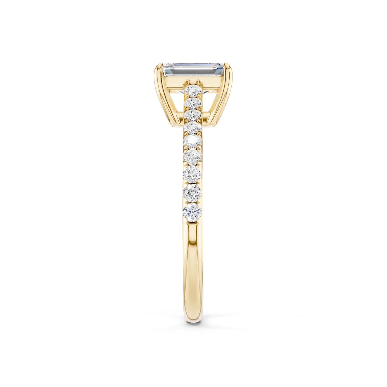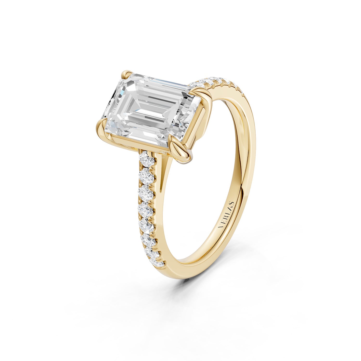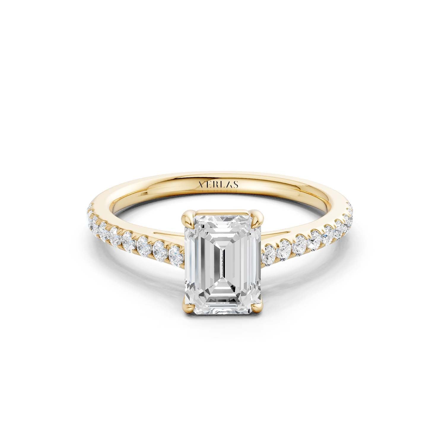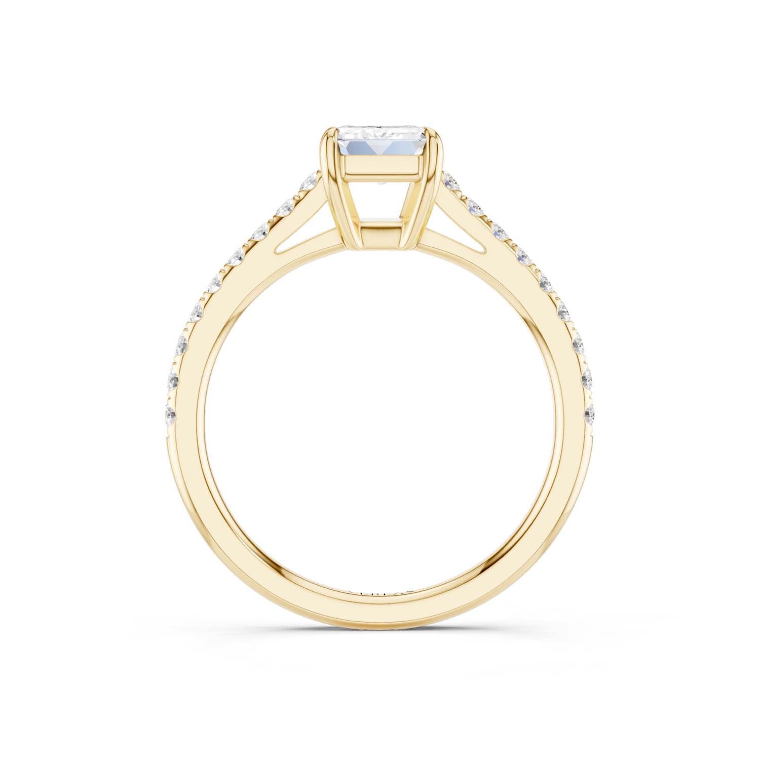 The emerald-cut lab-grown engagement ring is cut for brilliance with four prongs, giving it a feminine spirit. A lustrous band of micro-pavé-set diamonds lends these brilliantly-designed Atmos ring a modern edge.