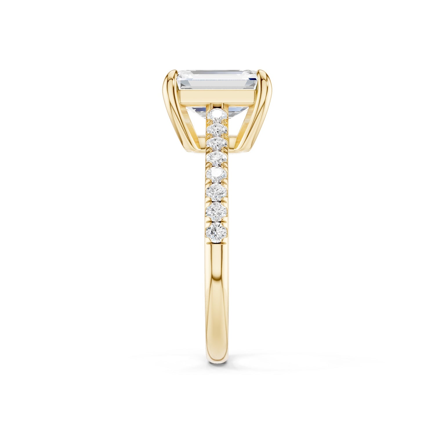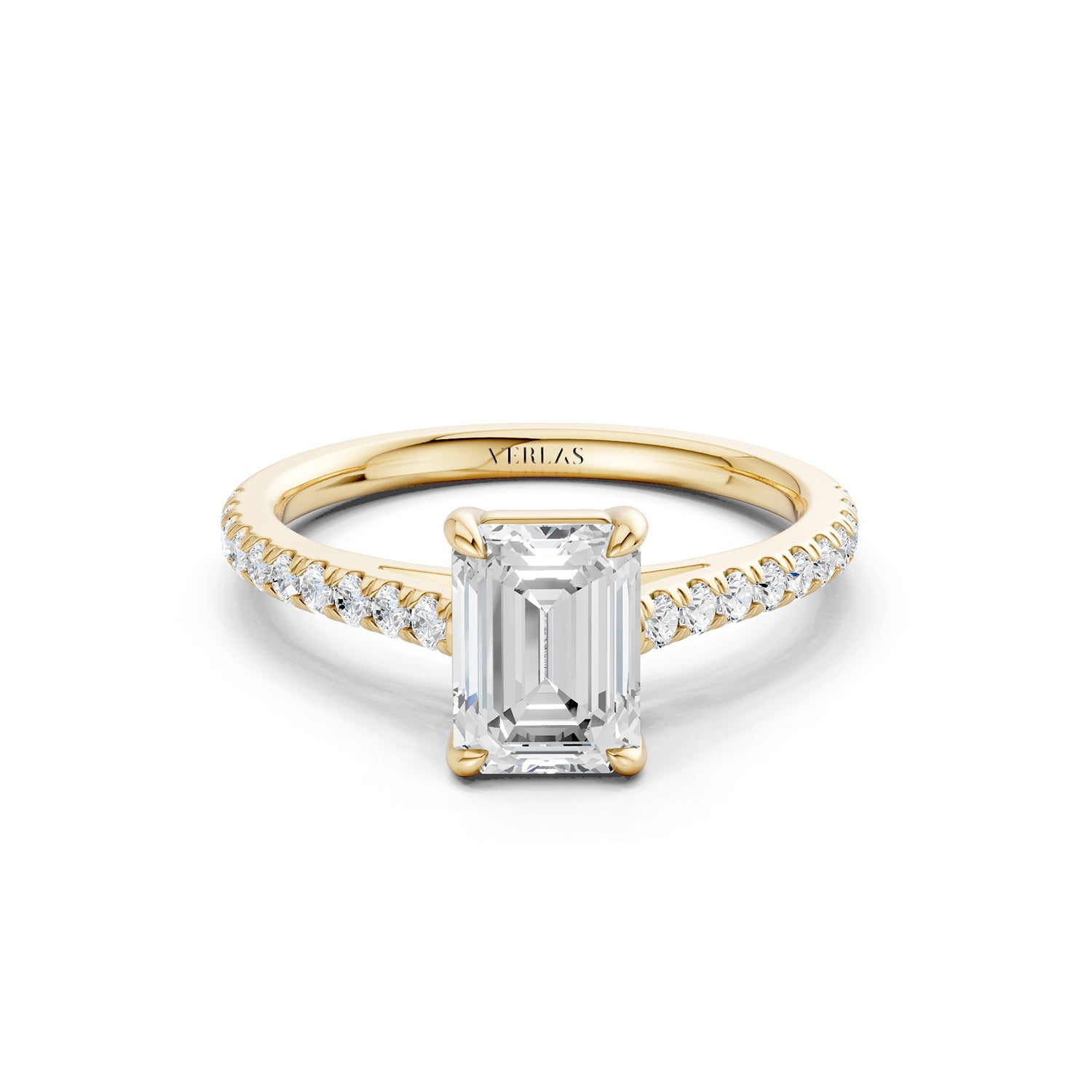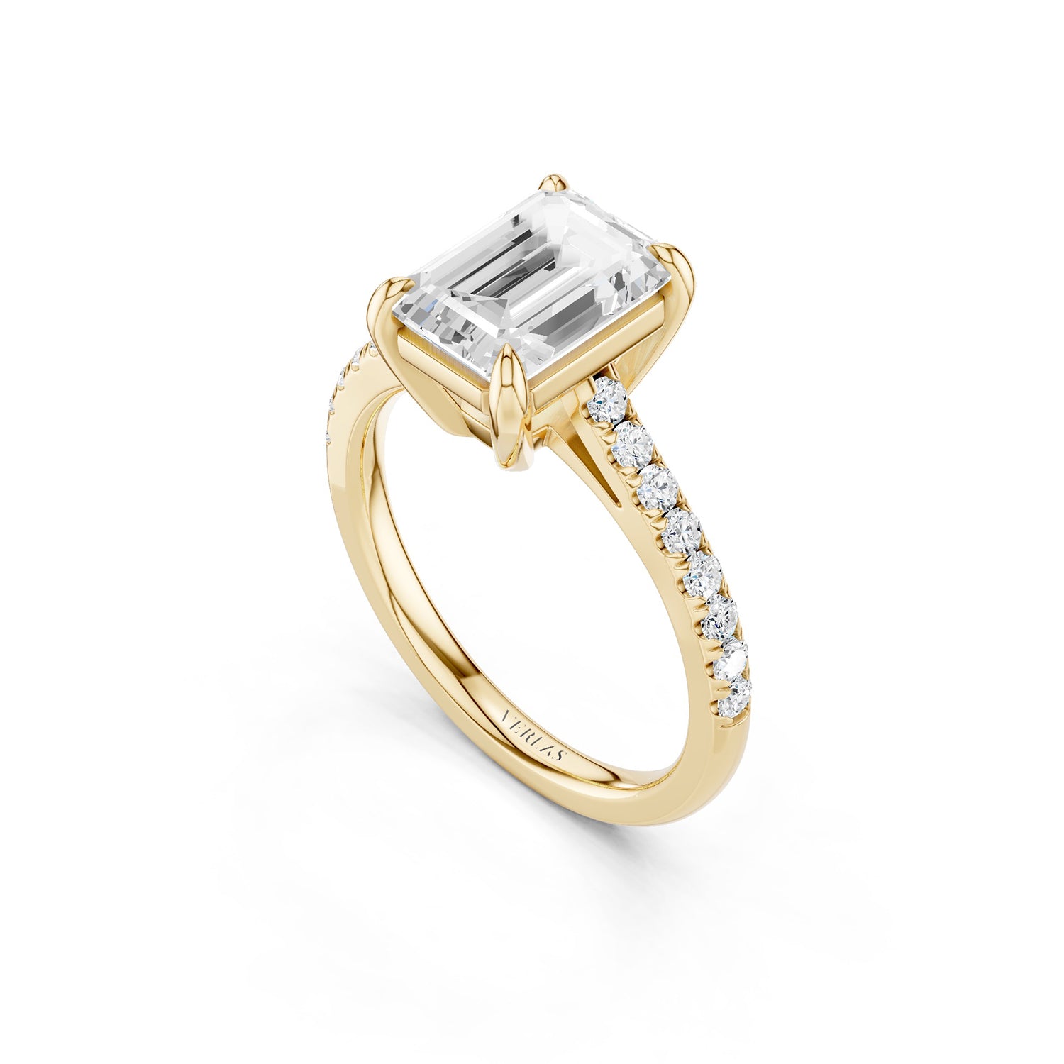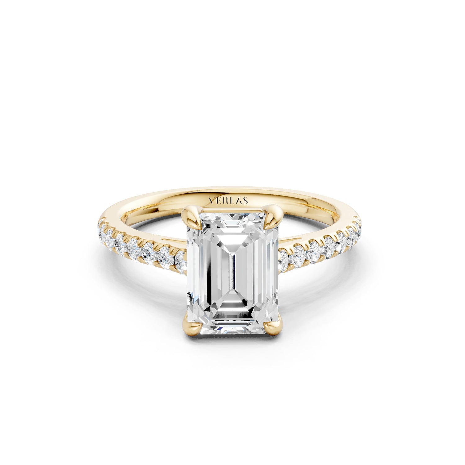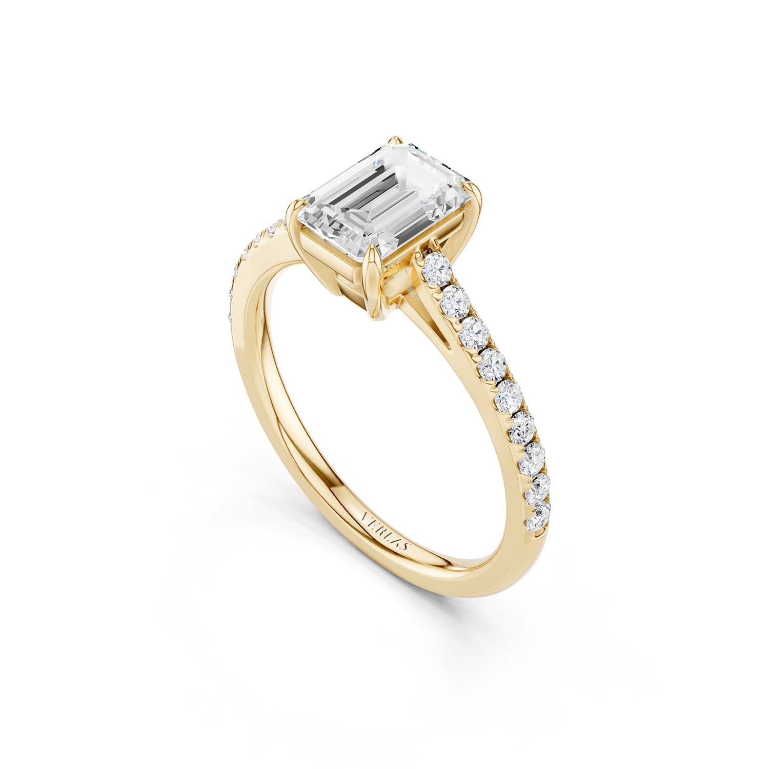 The emerald-cut lab-grown engagement ring is cut for brilliance with four prongs, giving it a feminine spirit. A lustrous band of micro-pavé-set diamonds lends these brilliantly-designed Atmos ring a modern edge.