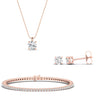 Beautifully crafted in 14K gold, Solitaire & Round Diamonds, this dynamic diamond jewelry set features a round solitaire pendant necklace, round solitaire studs and essential tennis bracelet, making it an excellent choice for gifting.