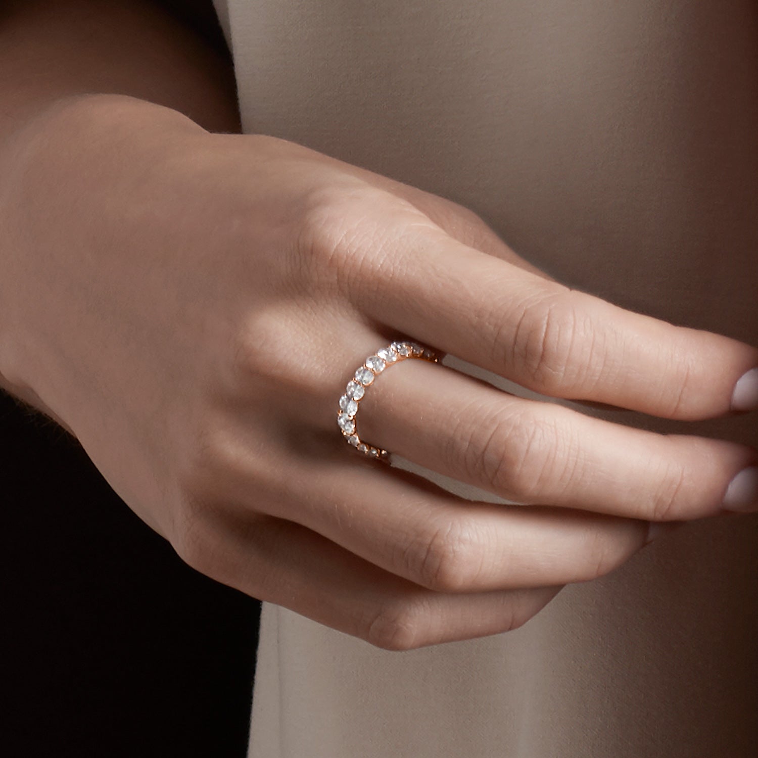 The Eternal Ellipse Band encapsulates the continuum of beauty that shapes our lives. This band is a symphony of 19 oval-shaped brilliant diamonds, each held in a prong setting—an ode to the eternal cycles of life. The design radiates elliptical brilliance from every view. . . Show More