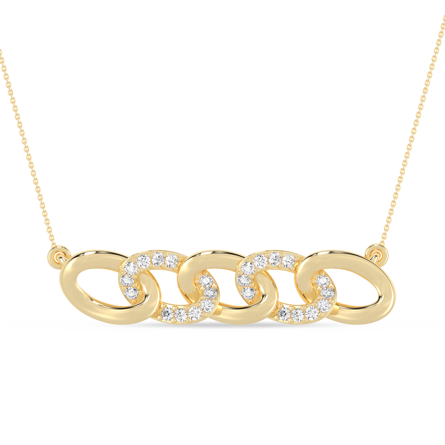 This enthralling necklace features a bar of diamond-studded oval rings interlocked together. The interlinked ovals are an emblem of the everlasting bond, making it a thoughtful gift for your loved one.