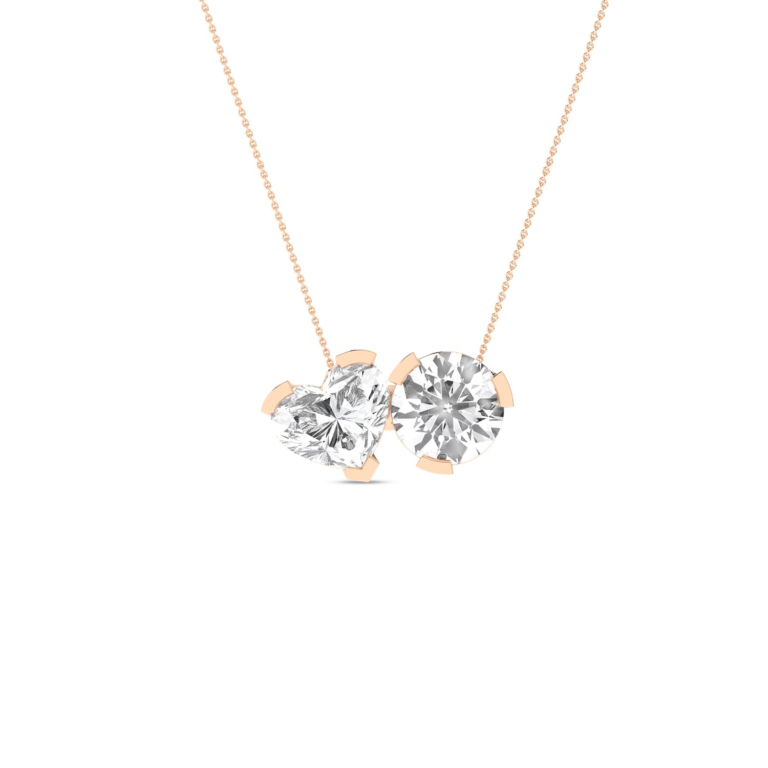 This Toi et Moi necklace features two magnificent diamonds, heart-shaped and round-shaped, carefully selected for their exceptional quality and craftsmanship. The two stones, with their distinct. characteristics, represent the unique qualities that each individual brings to a relationship. They come together in perfect. harmony, like two people in love, to create something extraordinary.