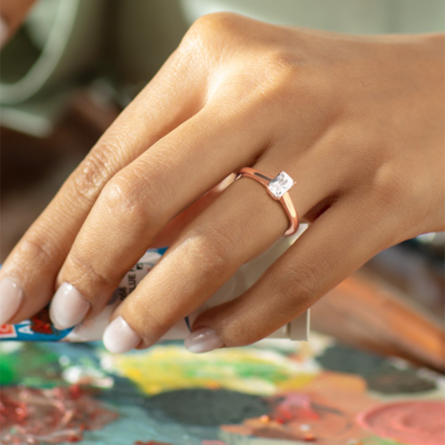 This elegant solitaire lab-grown diamond ring features an open basket with four claw prongs that cradle the center radiant-cut diamond. The lustrous gold band adds to the sleek, classic look of the design.