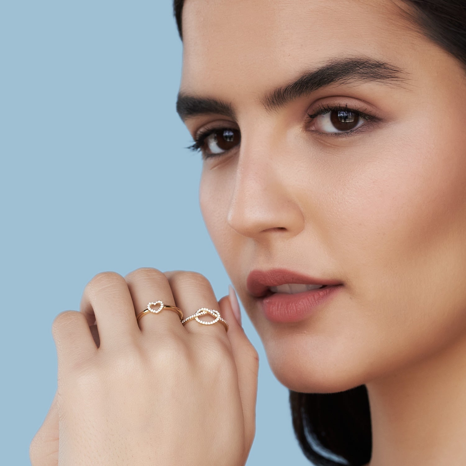 The Infinity Heart Ring is a beautiful symbol of love and eternity. This diamond ring is set in a solid gold band that loops around to form an infinity knot. This unique design adds to its beauty, making it subtle yet striking - a magnificent paradox that is a must-have in your everyday essentials ensemble.