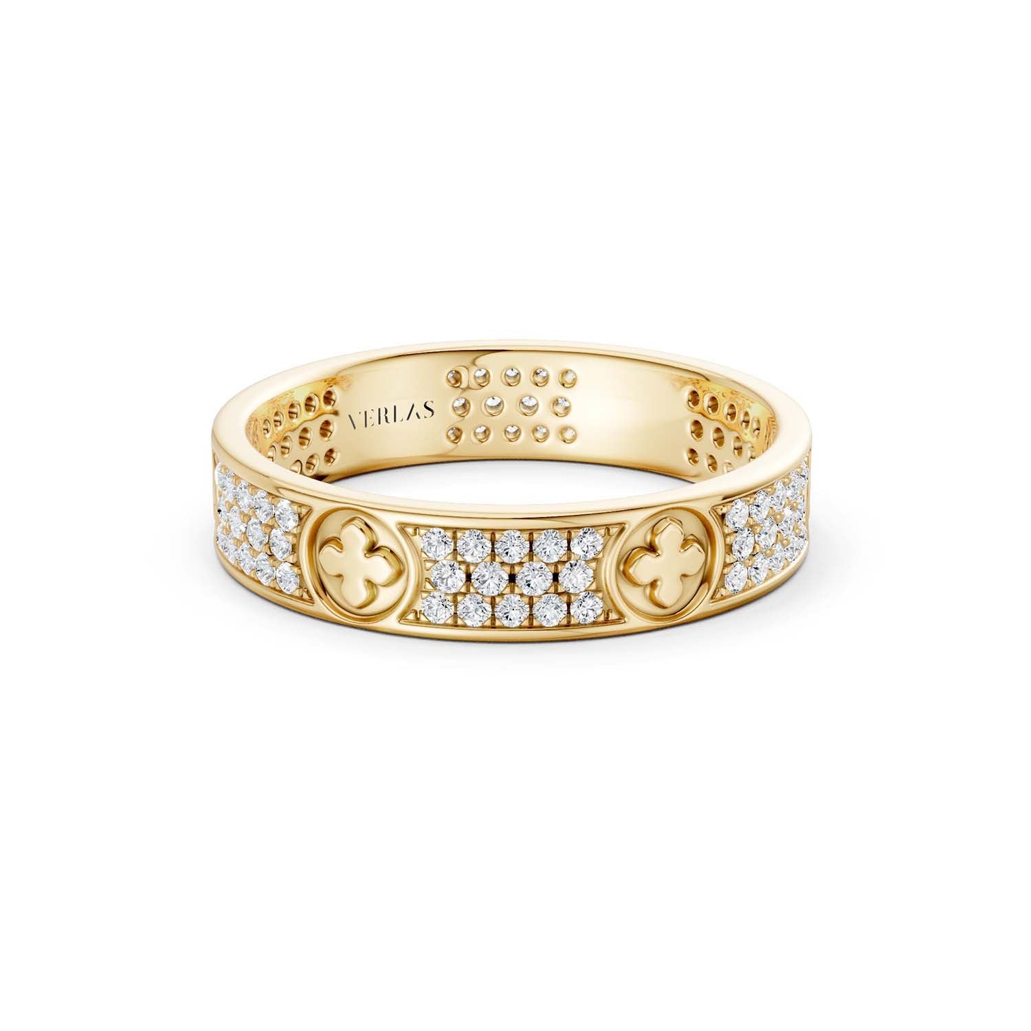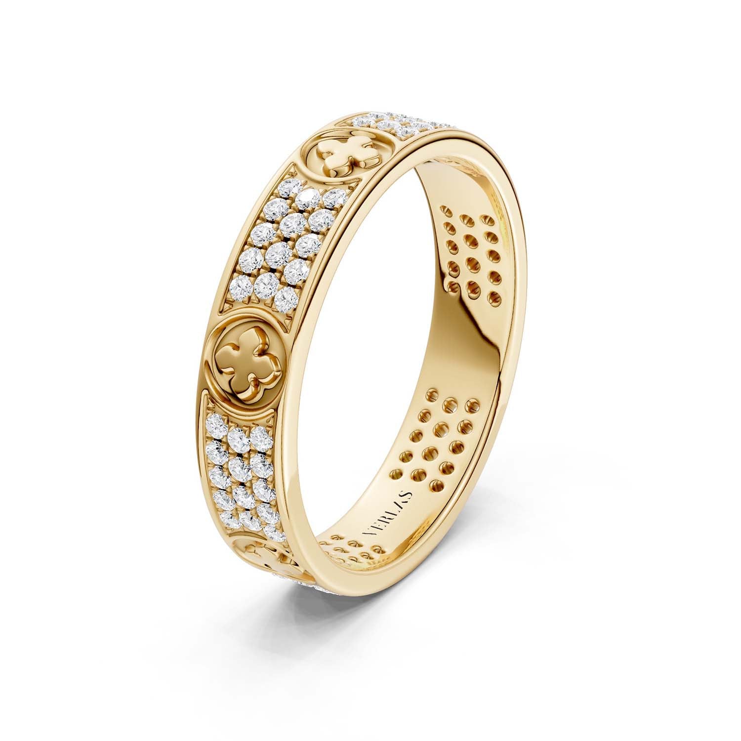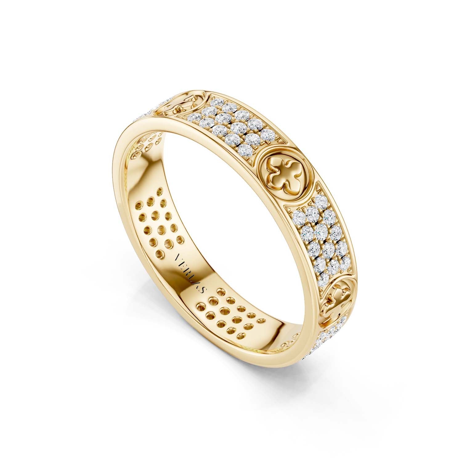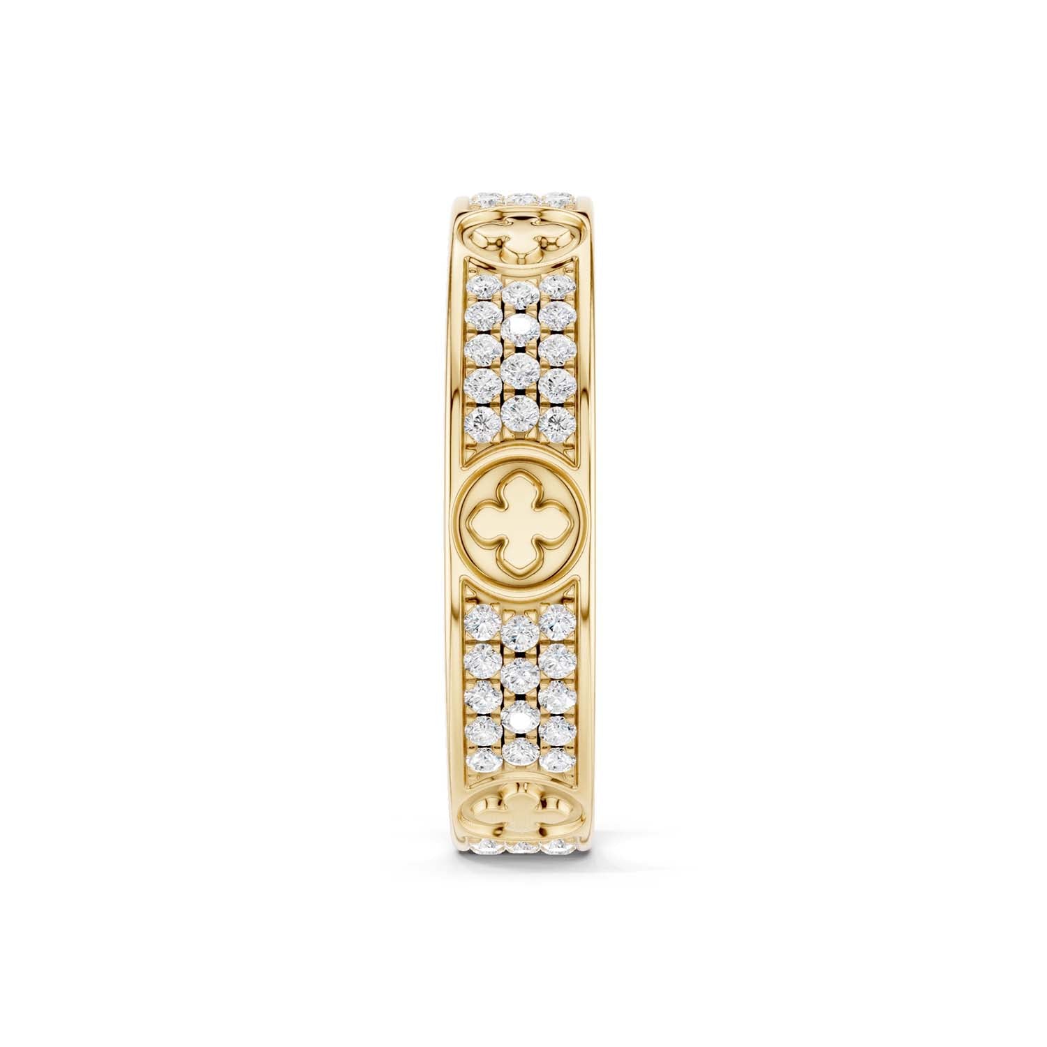 This La Fleur Round Band features four rows of dazzling diamonds, set in an alternating pattern to create a mesmerizing floral effect. This meticulous placement ensures that every angle of this band shines with an ethereal radiance. This captivating diamond wedding band is more than just a symbol of eternal love; it's a true work of art that will adorn your finger with unparalleled beauty.