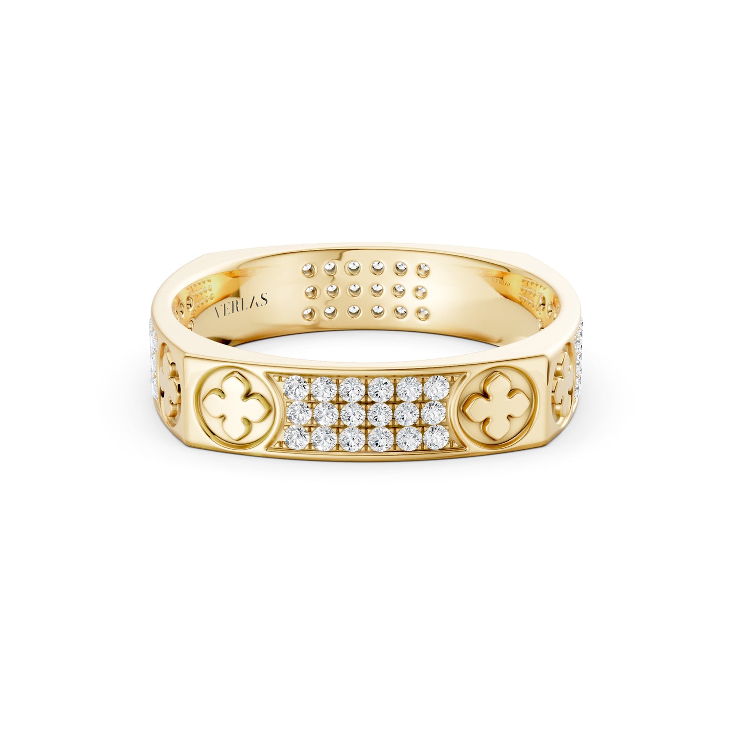 Introducing the La Fleur 4mm 4-Diamond Rows Square Band. This exquisite solid gold band showcases La Fleur's signature floral motif in a stunning design. Versatile and timeless, this band can be worn on its own or stacked with other La Fleur bands for a powerful and personalized look. Elevate your everyday expression with the brilliance of La Fleur.