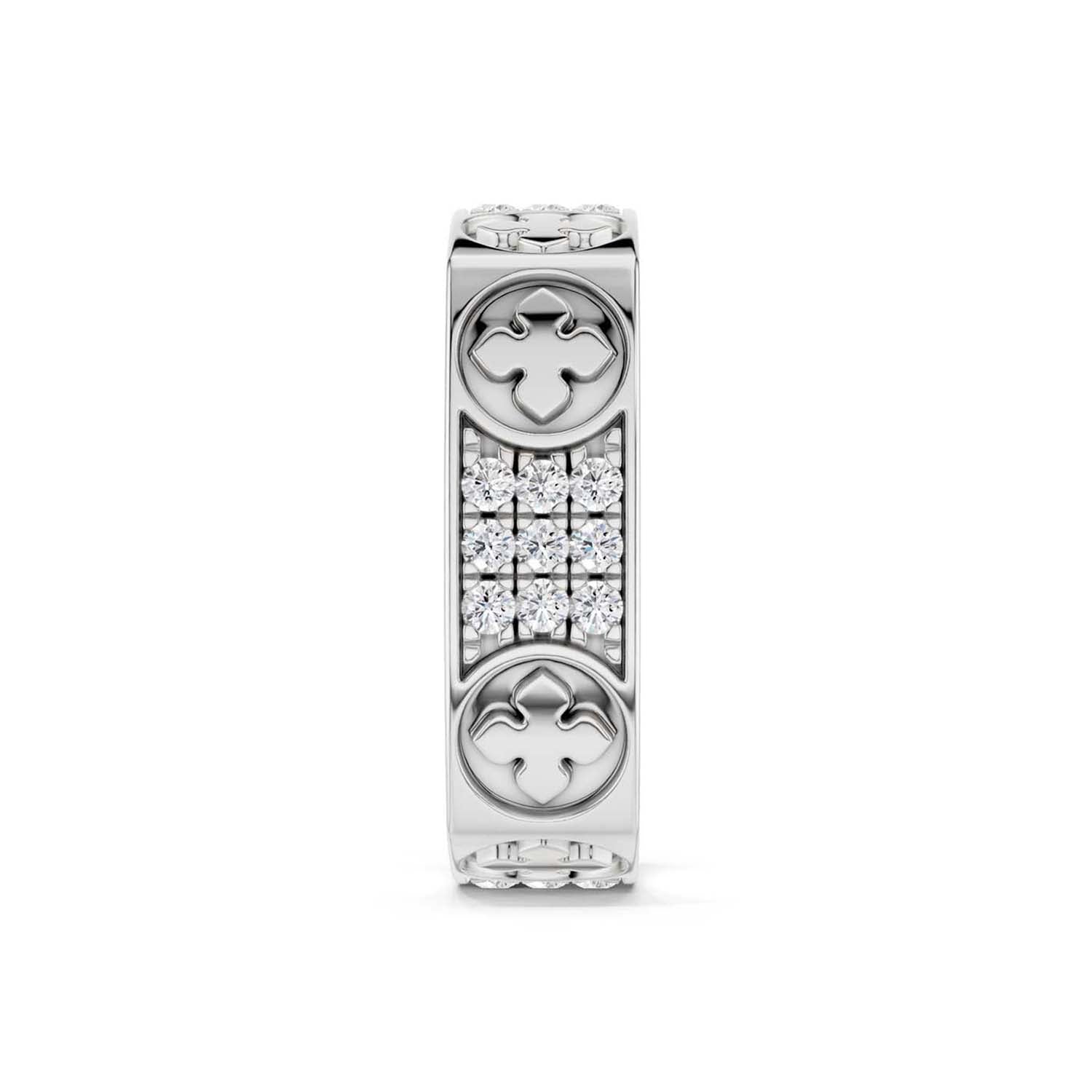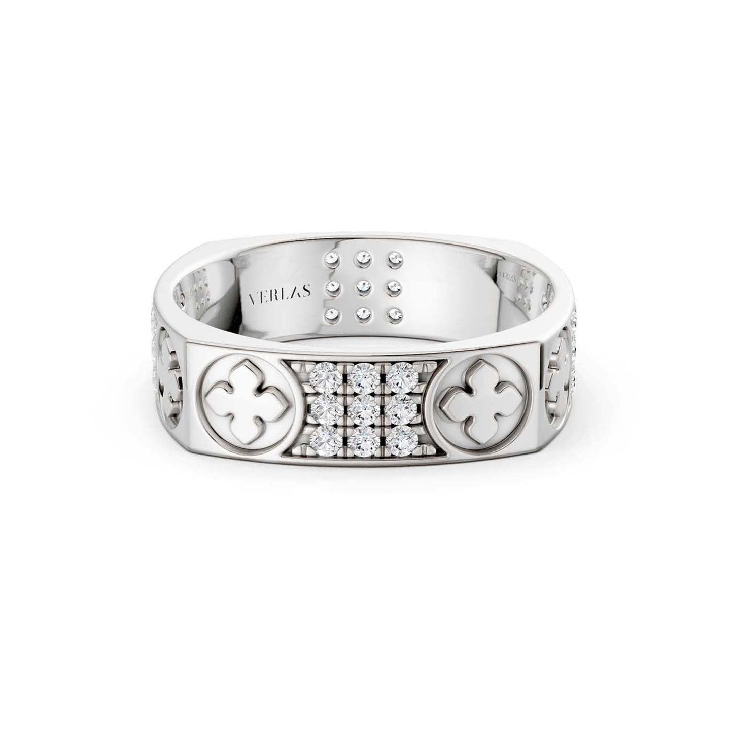 This La Fleur 5mm 4-Diamond Rows Square Band consists of four sets of tiny brilliant-cut diamonds artfully nestled between delicate floral motifs. Its square shape sets it apart, providing a modern twist to a classic concept. A stunning masterpiece unconstrained by gender,, it makes for a perfect choice for those looking for unique diamond wedding rings.
