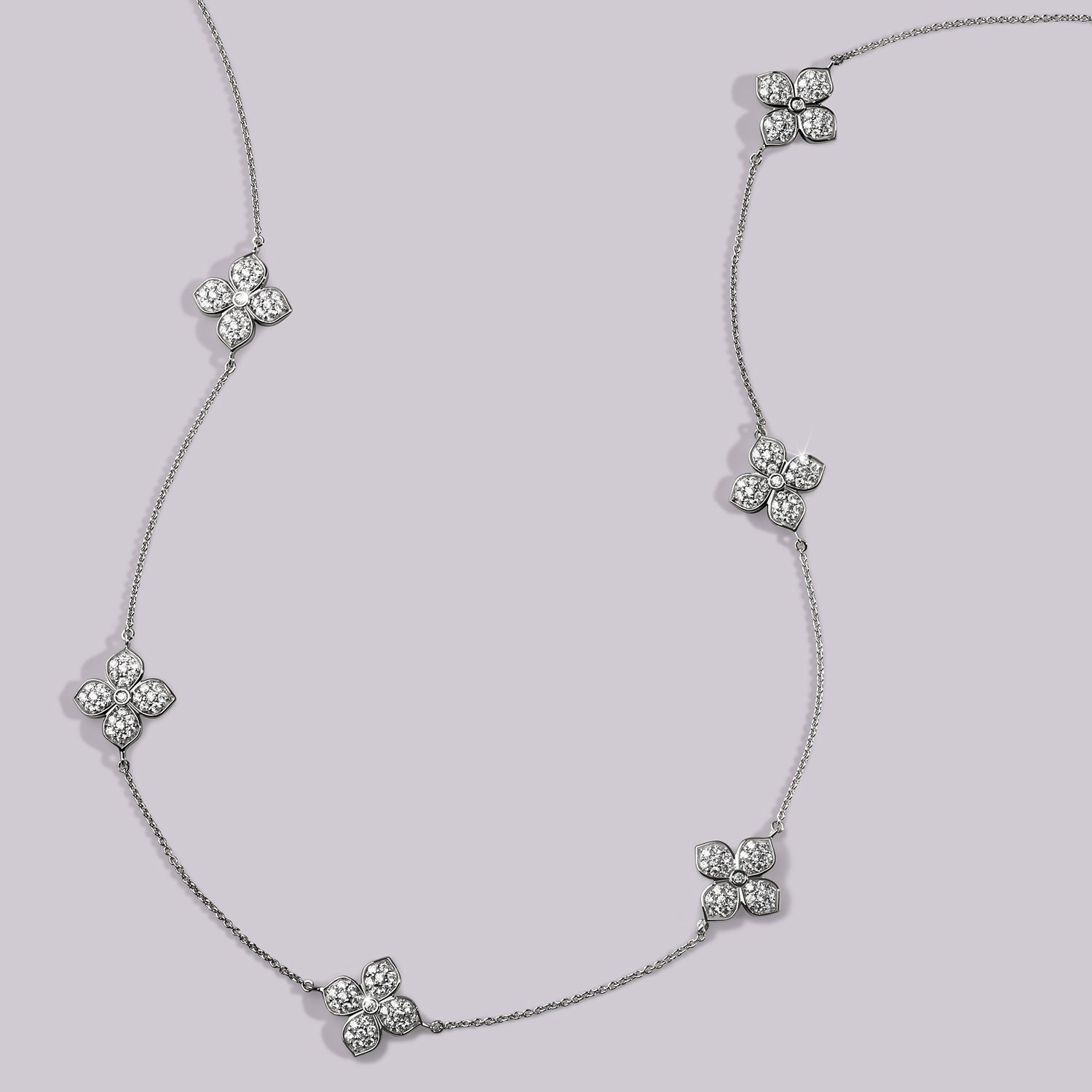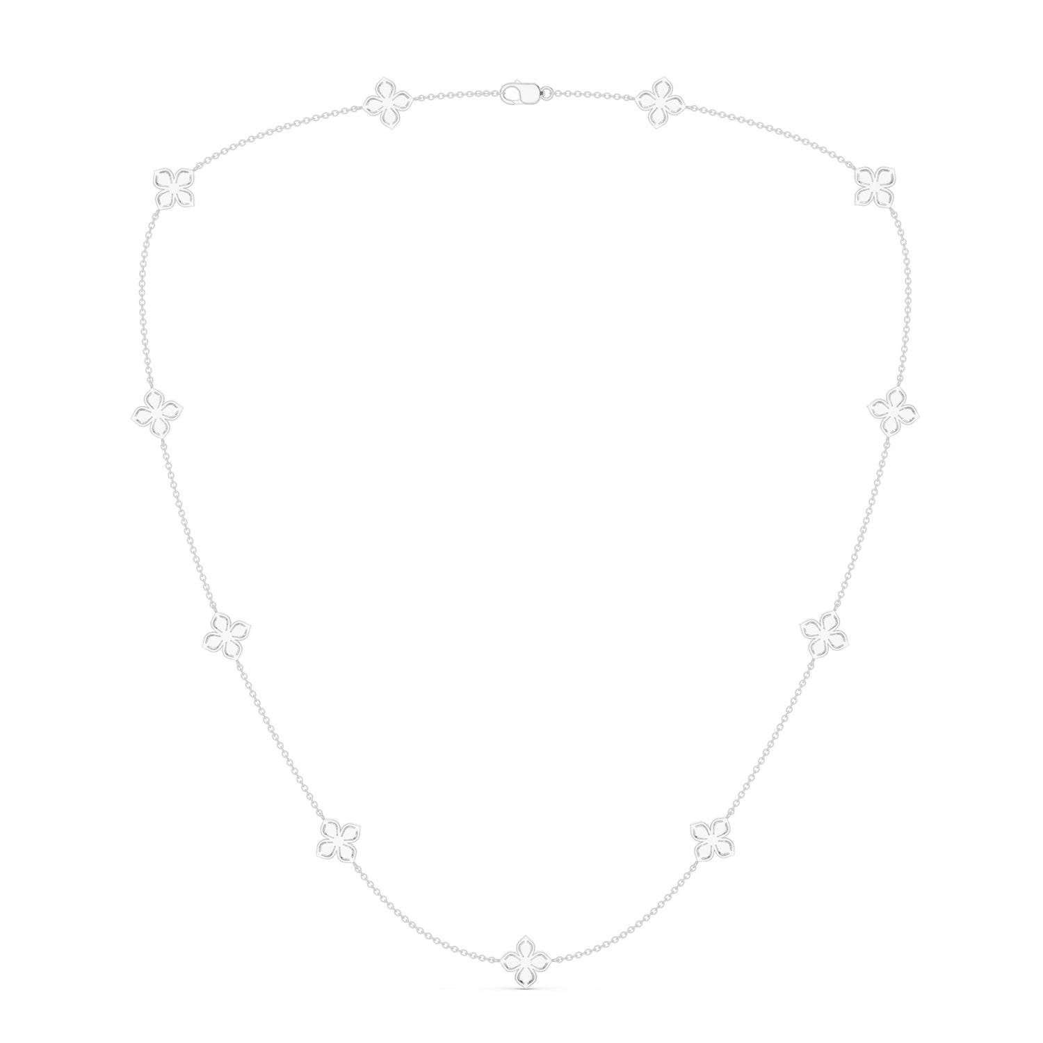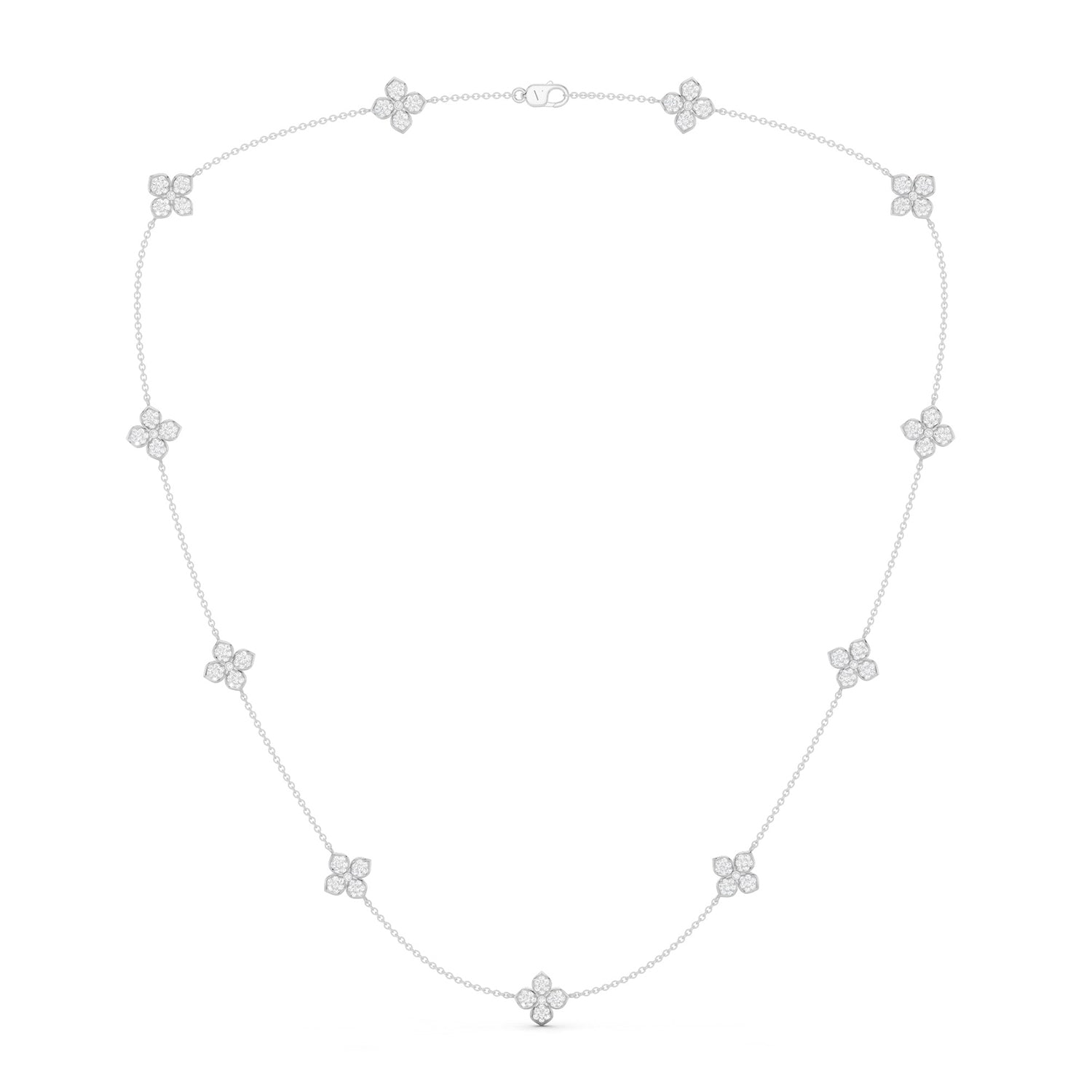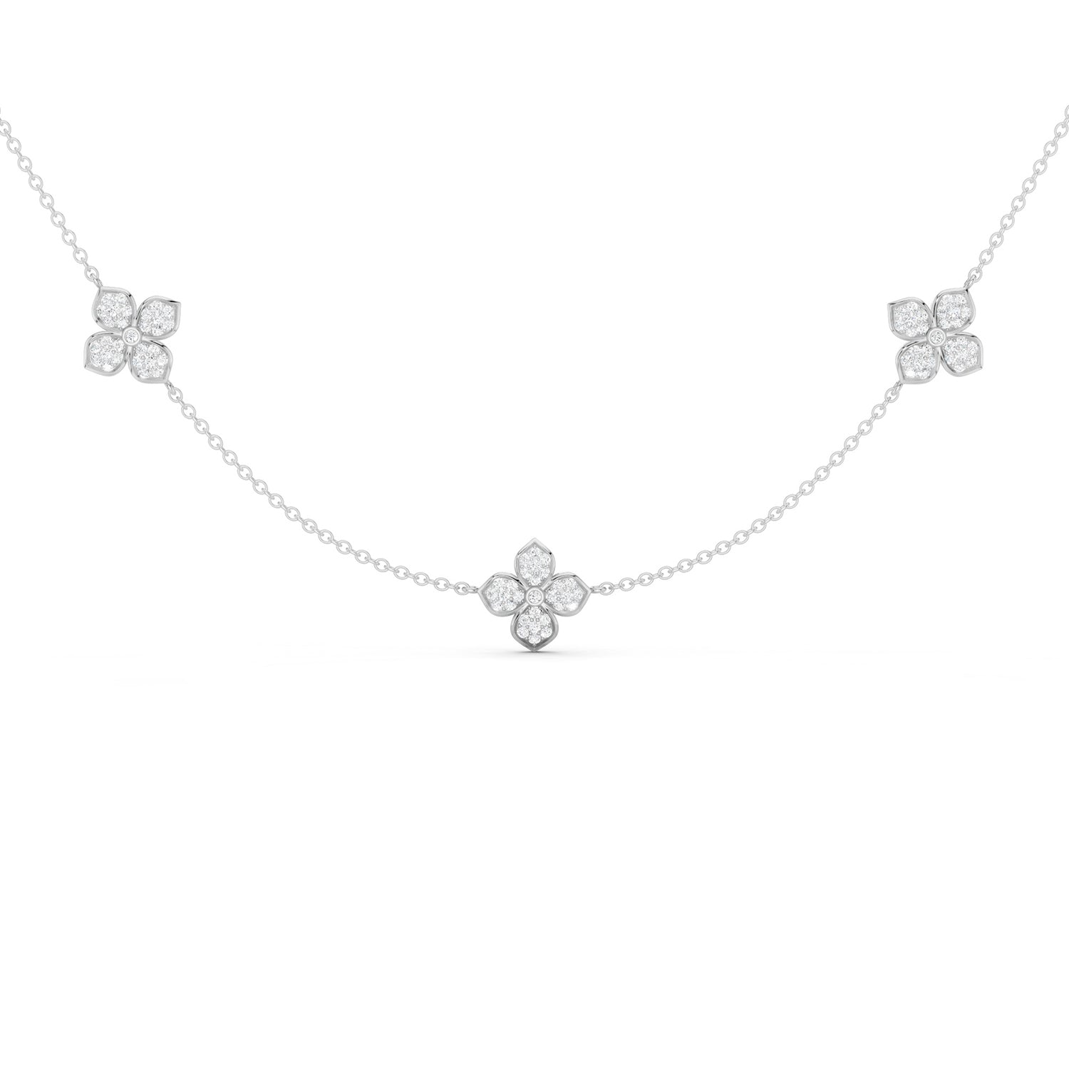 Elevating the allure of this La Fleur Petite Diamond Radiant Stationed Necklace are the dazzling diamond accents that grace its entire length. These brilliant diamonds are strategically stationed along the chain mirroring the elegance of the floral motifs. The petite yet impactful diamond necklace design is always ready to enhance your outfit with its timeless charm.