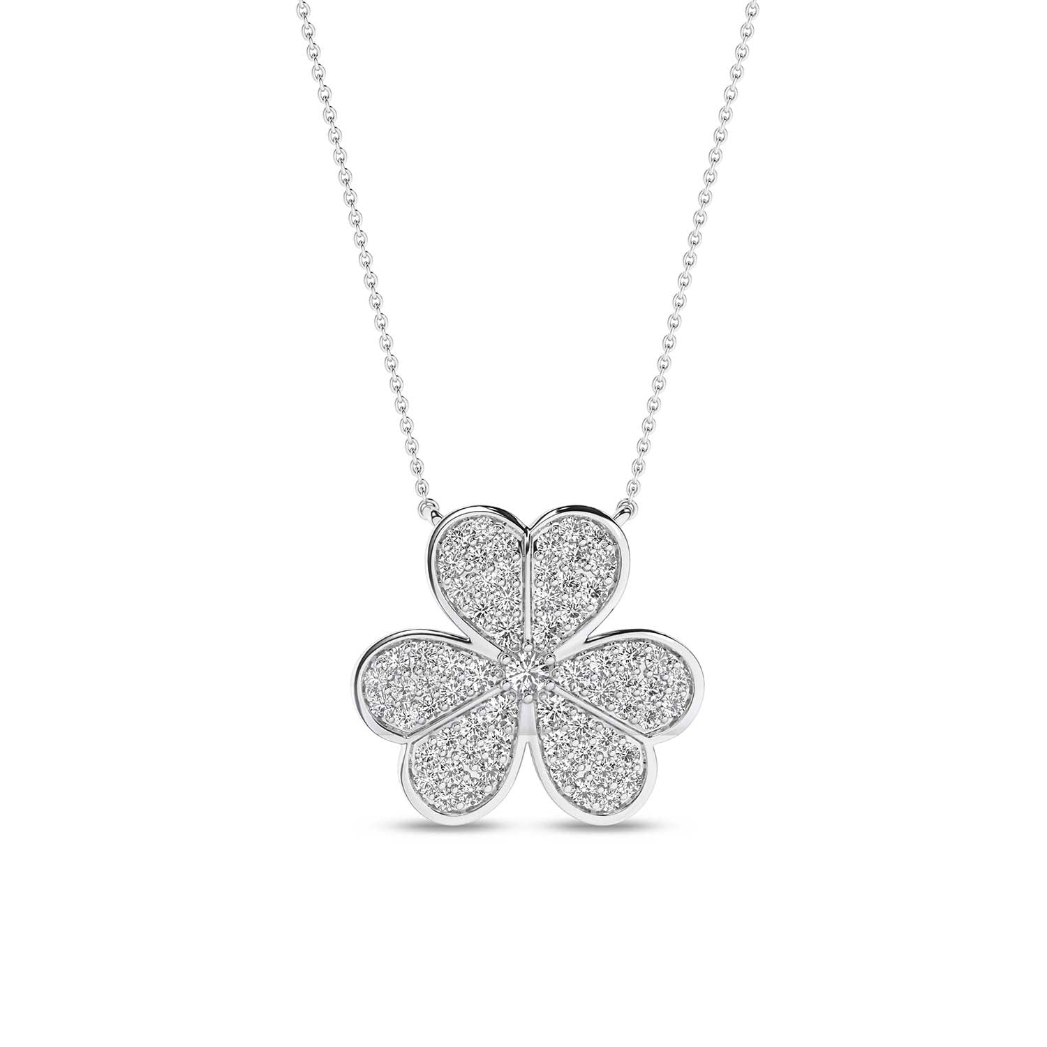 This Lucky Necklace showcases a floral motif with each petal embellished in diamond accents that capture the timeless beauty of blossoms. The floral diamond necklace design symbolizes luck and prosperity, making it a thoughtful and cherished gift.