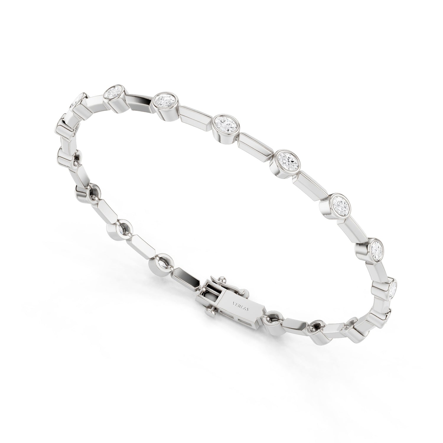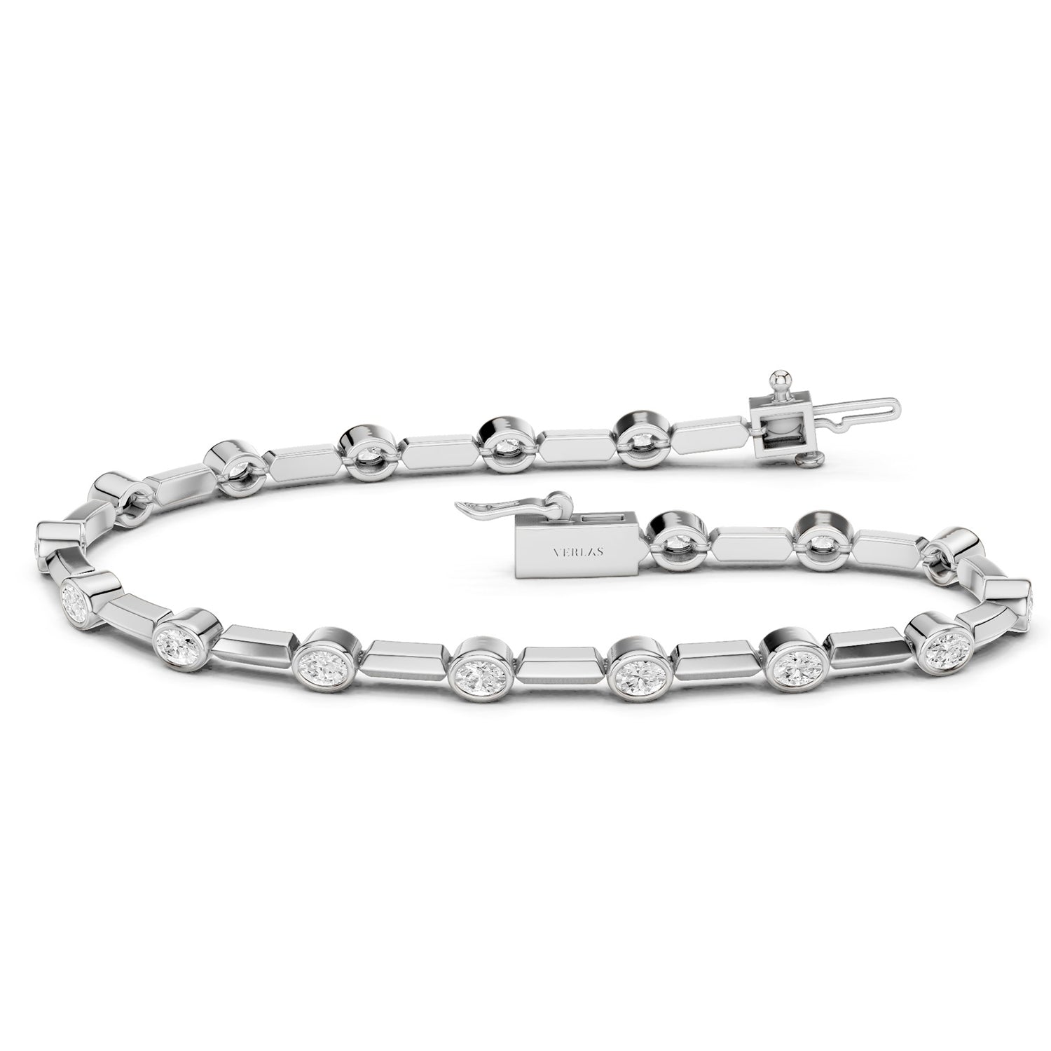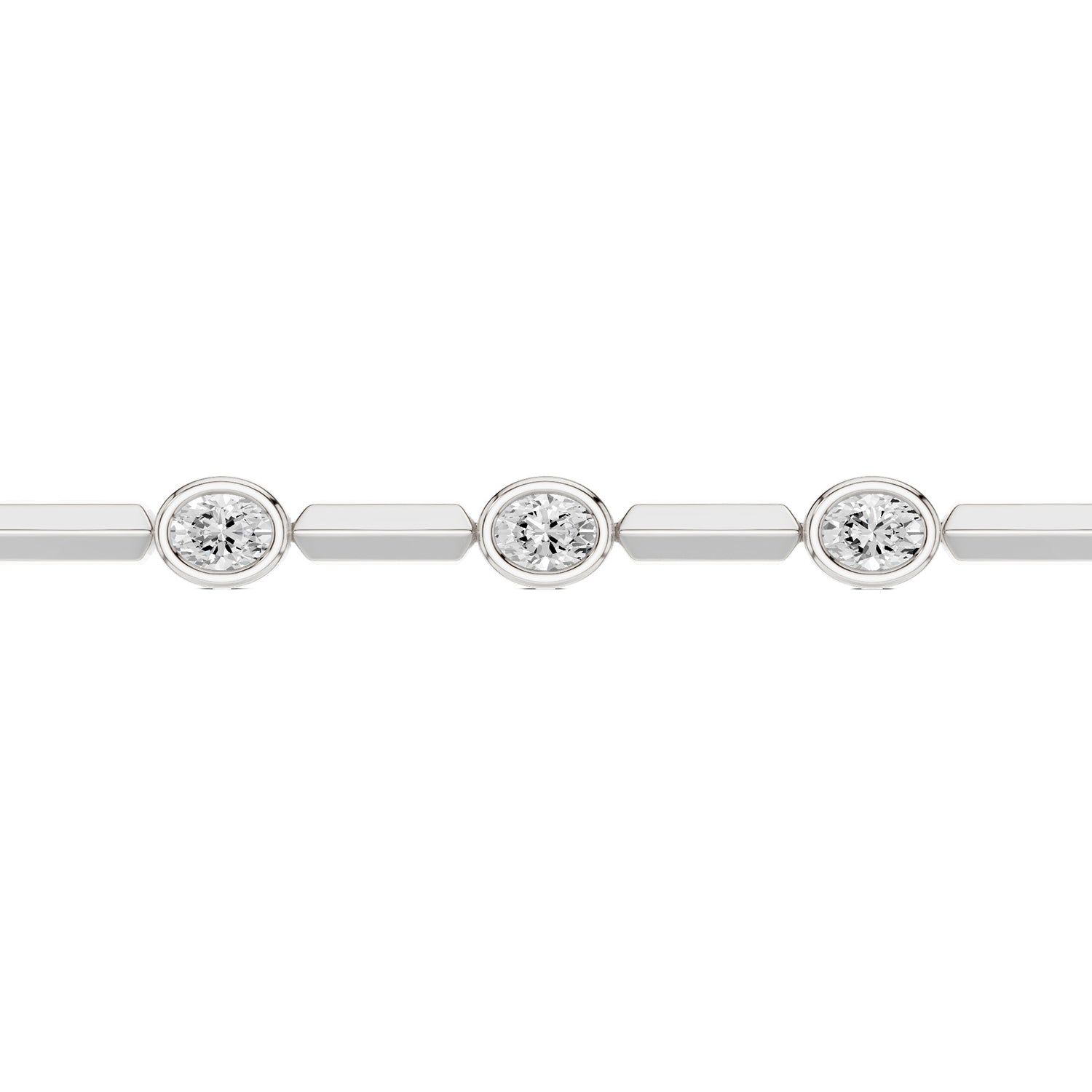 Step into timeless chic with the Bezel-Set Oval Diamond Tennis Bracelet, a piece that seamlessly blends classic charm with modern sophistication. Featuring a stunning array of oval lab-grown diamonds, each securely nestled in a polished bezel setting, this bracelet captures the essence of luxury. The alternating gold bars add a contemporary touch, creating a striking contrast that highlights the brilliance of the diamonds. The sleek design is perfect for both everyday wear and special occasions, effortlessly elevating any look with its refined sparkle and style.