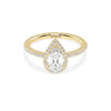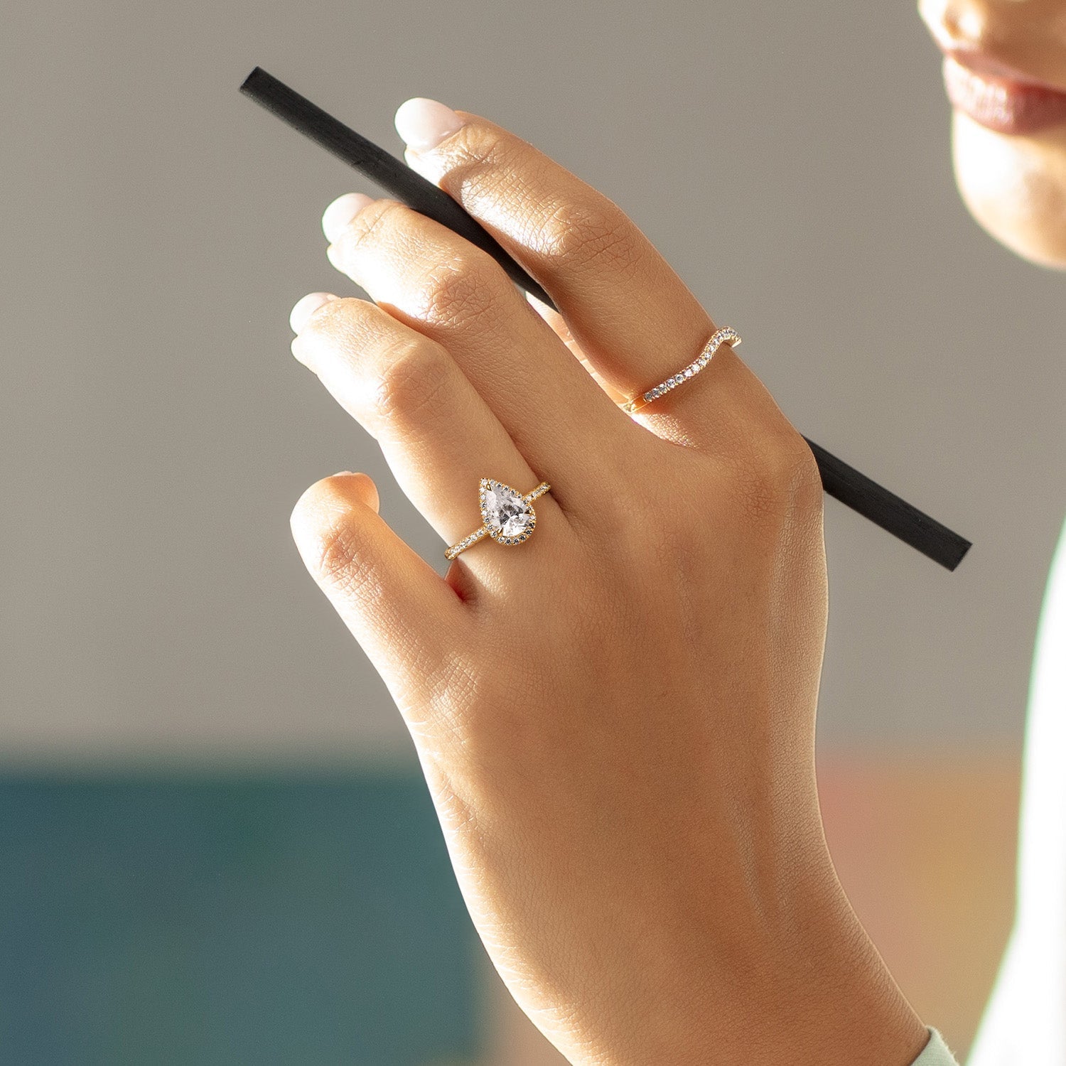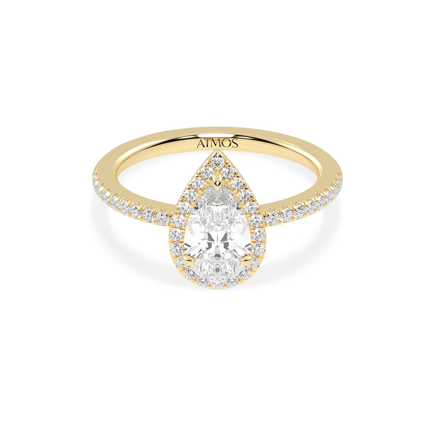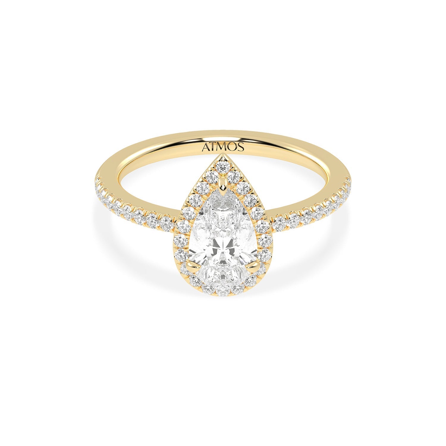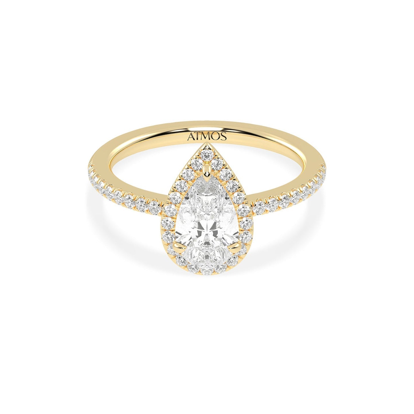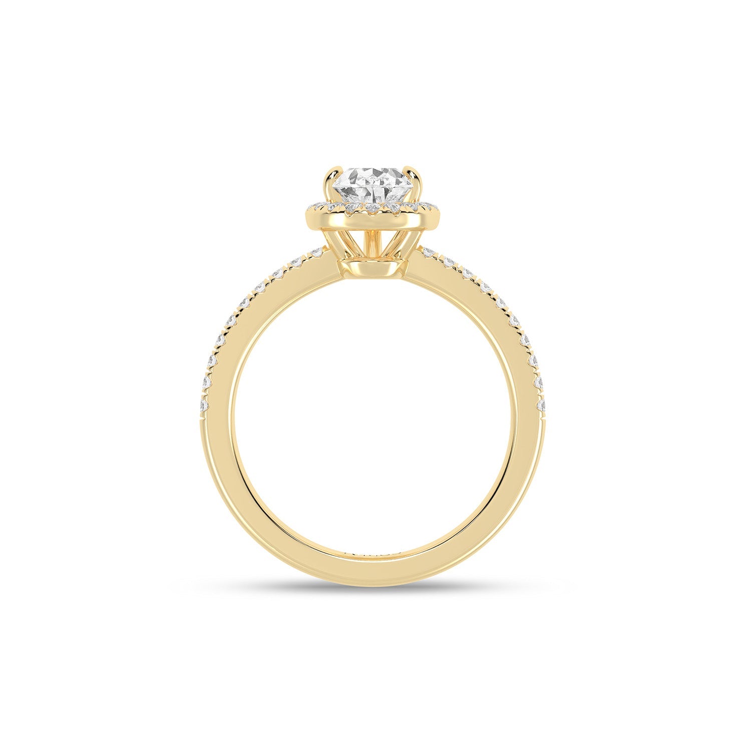 This spectacular lab-grown engagement ring features a dewdrop-shaped diamond that is surrounded by a halo of petite diamonds. Crafted with precision, this glamorous setting magnifies the brilliance of your pear-cut lab diamond ring from every angle.