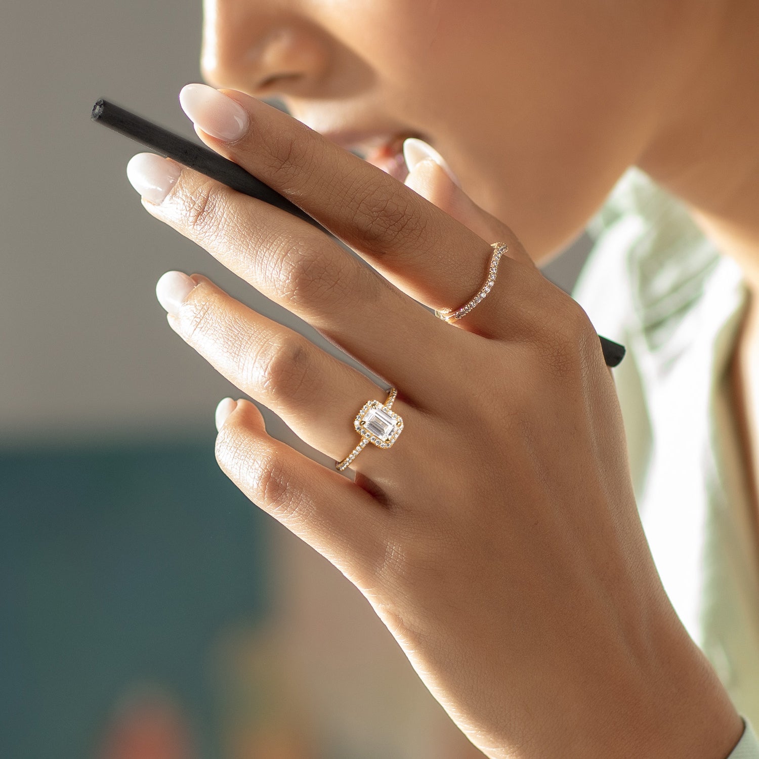 Read MoreThis lab-grown diamond halo ring is the epitome of vintage-inspired glamour. The classic emerald-cut center is enhanced by hand-cut facets and beautifully adorned with a halo of petite shimmering diamonds for undeniable radiance.