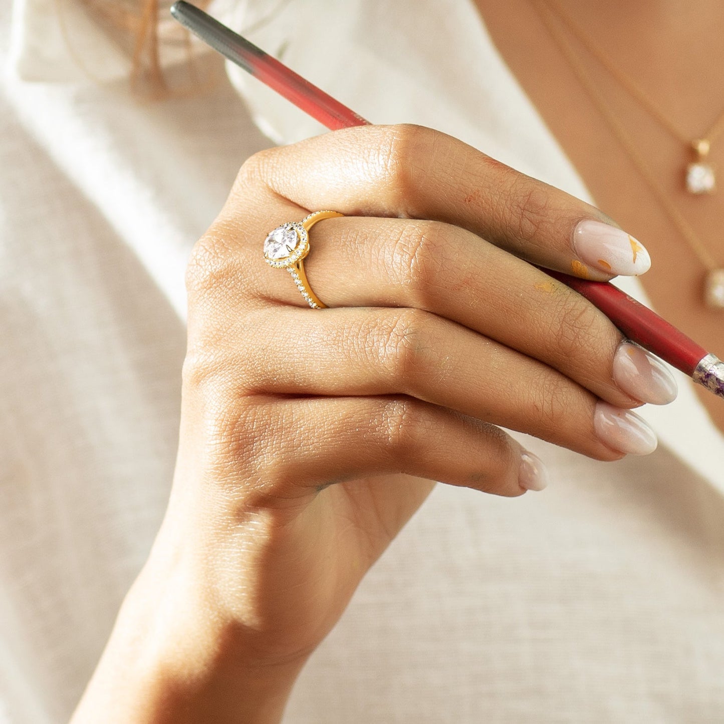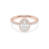 Modern and elegant, this subtle design ring features a brilliant-cut ellipse diamond surrounded by a halo of petite lab-grown diamonds. This lab-grown engagement ring is a beautiful piece featuring round diamonds on the band that adds optimum brilliance to your hand.
