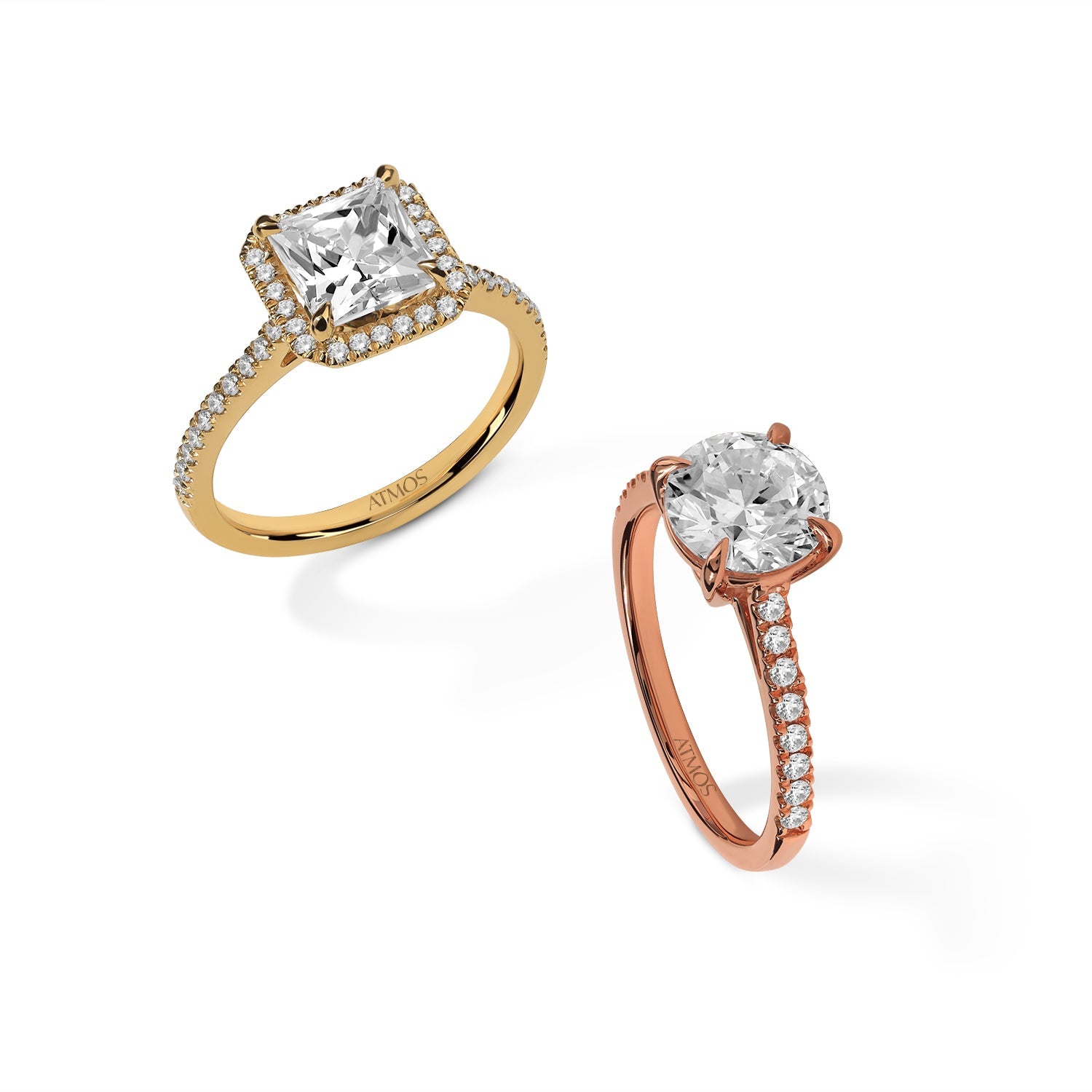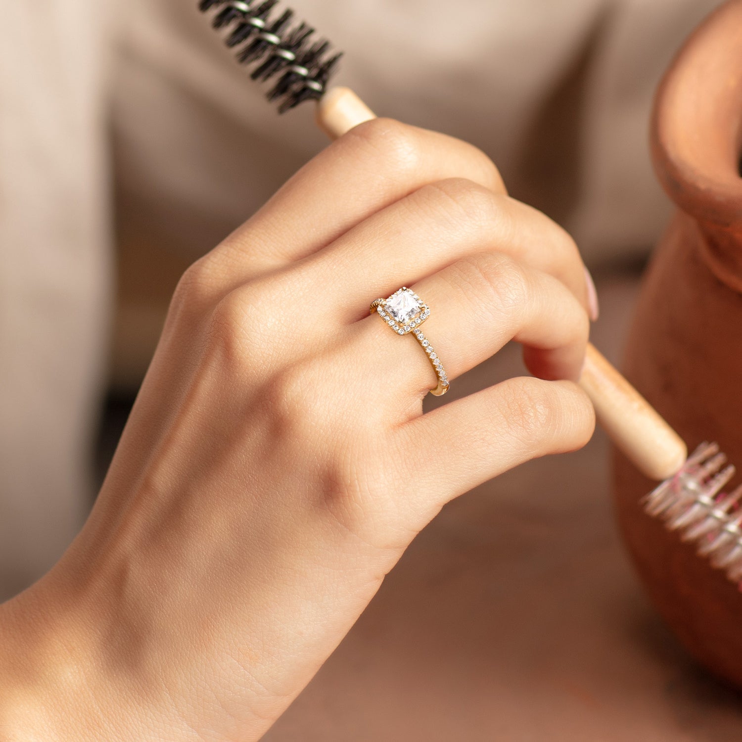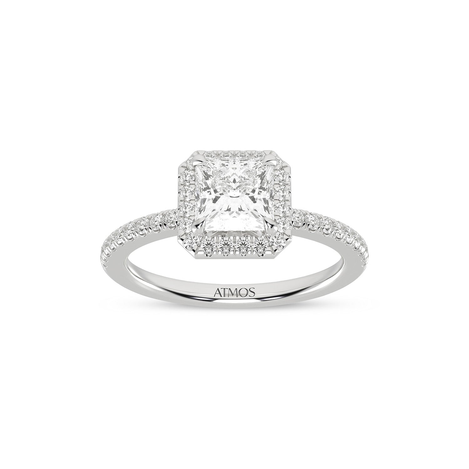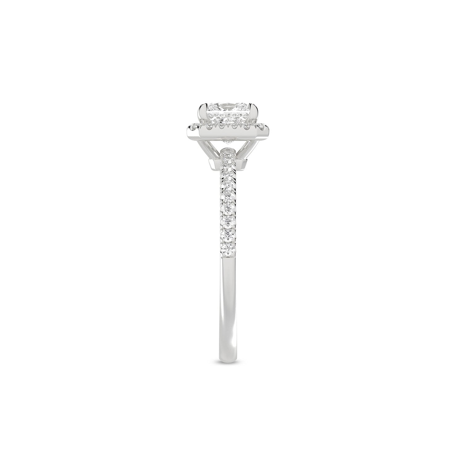 Elegant and classic, this lab-grown diamond engagement ring feature a bright, brilliant princess-shaped diamond at the center surrounded by a fiery halo of petite shimmering diamonds. This detailed halo ring is set in a lustrous solid gold band, perfect for a befitting l. . . Read More