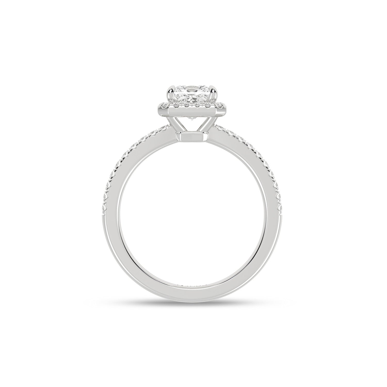 Elegant and classic, this lab-grown diamond engagement ring feature a bright, brilliant princess-shaped diamond at the center surrounded by a fiery halo of petite shimmering diamonds. This detailed halo ring is set in a lustrous solid gold band, perfect for a befitting look.