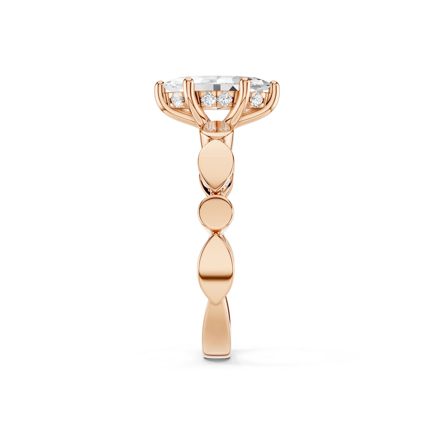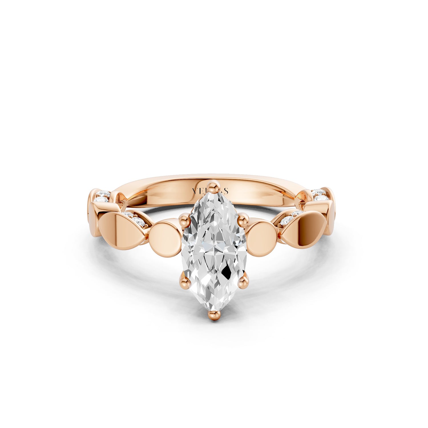 This marquise-cut lab-grown diamond ring features a hidden halo for extra radiance. The band is crafted with alternating marquise and round gold motifs, some polished and others diamond-set, creating a striking blend of texture and sparkle. Hidden diamond details beneath the prongs add a secret touch of brilliance from every angle.