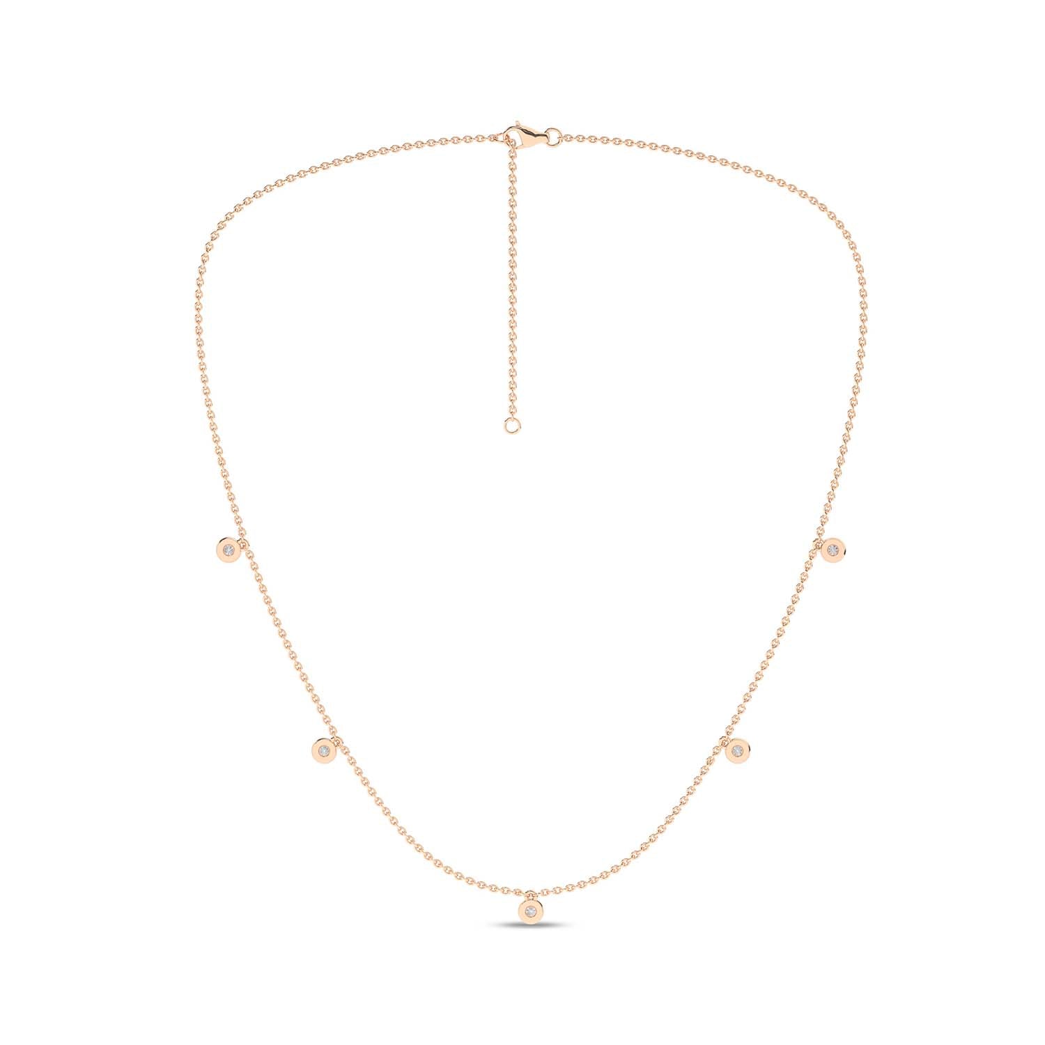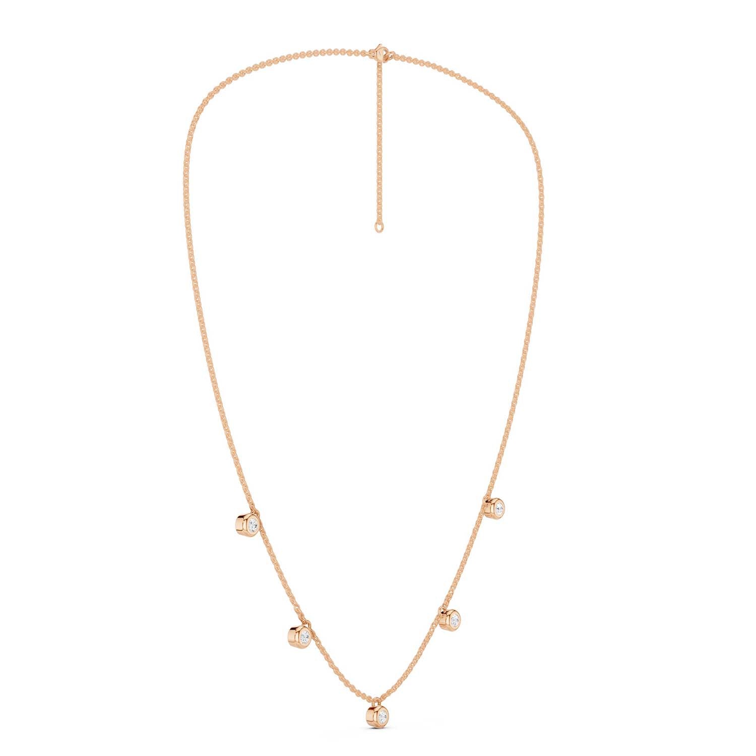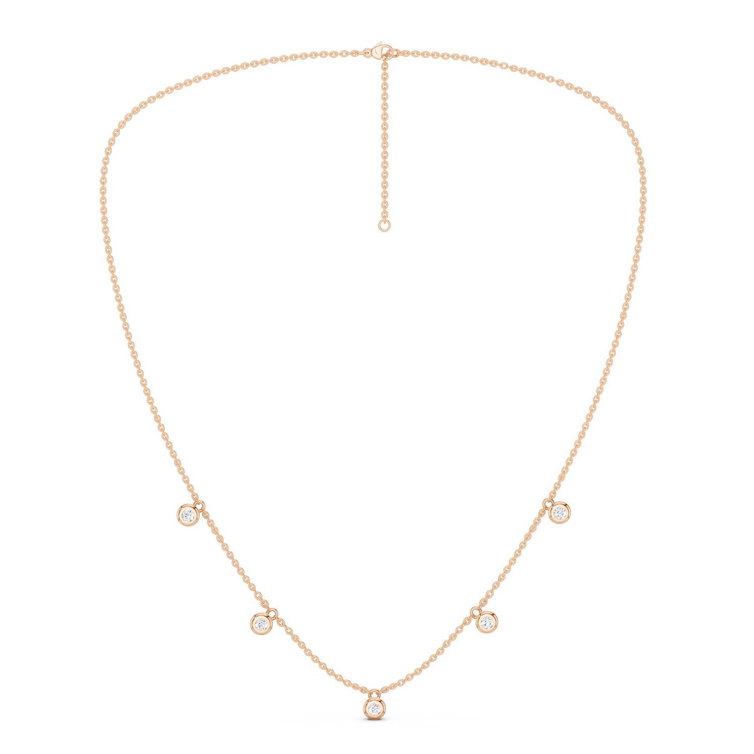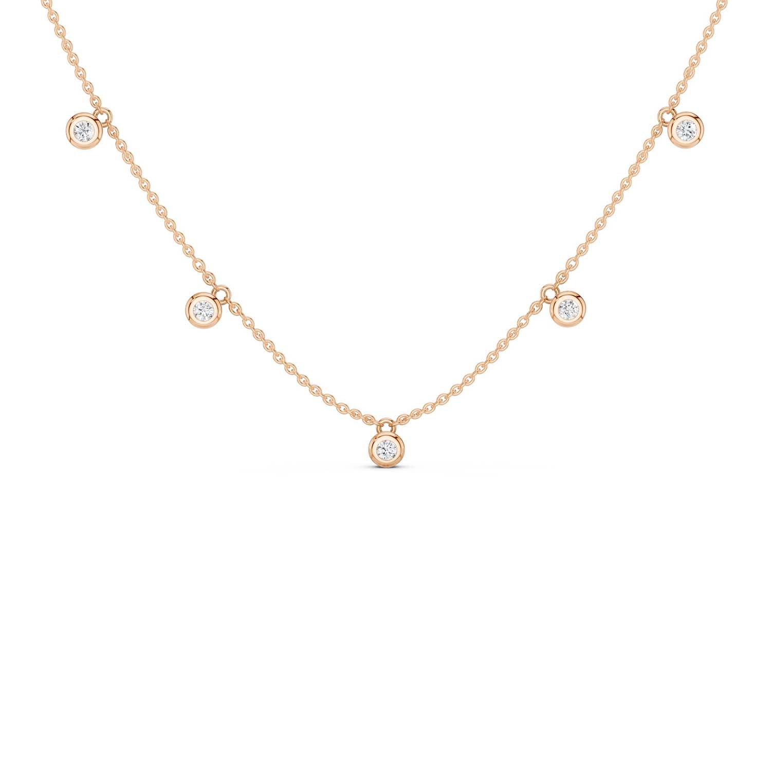 The versatile Mini-Round Encompassing Stationed Necklace showcases a series of carefully selected, round-cut diamonds, set in a manner that maximizes their radiance. It is a perfect blend of elegance and charm for those aspiring minimalists. With five stunning round bezel stations, this classic diamond necklace design offers endless layering possibilities.