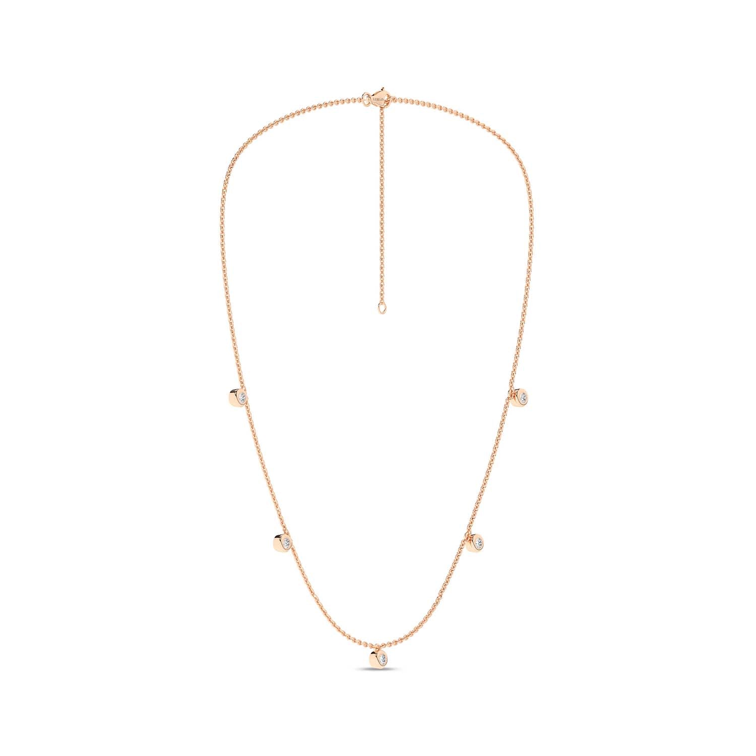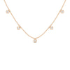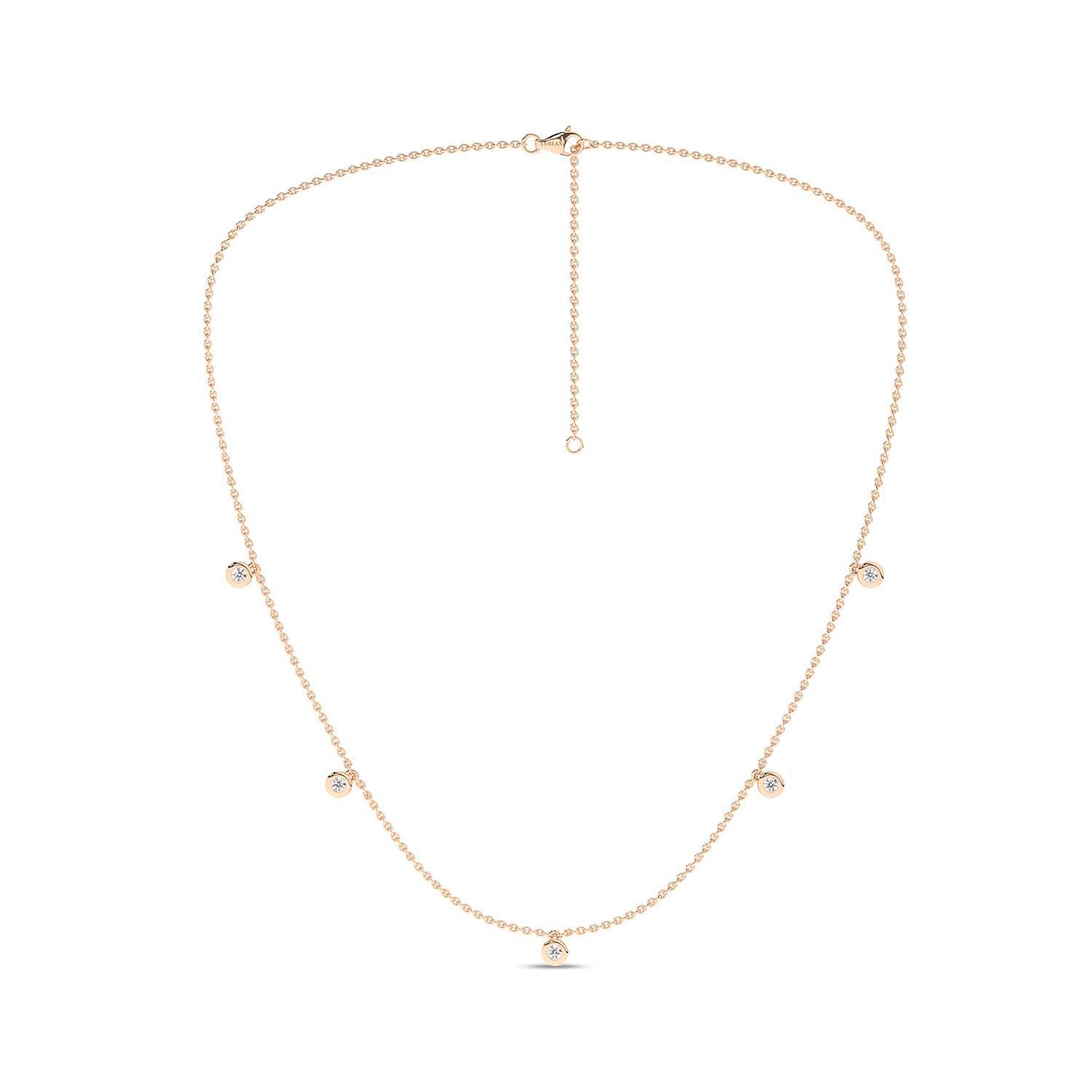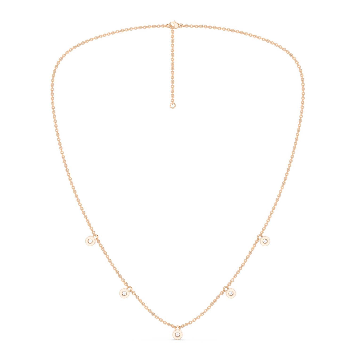 The versatile Mini-Round Encompassing Stationed Necklace showcases a series of carefully selected, round-cut diamonds, set in a manner that maximizes their radiance. It is a perfect blend of elegance and charm for those aspiring minimalists. With five stunning round bezel stations, this classic diamond necklace design offers endless layering possibilities.