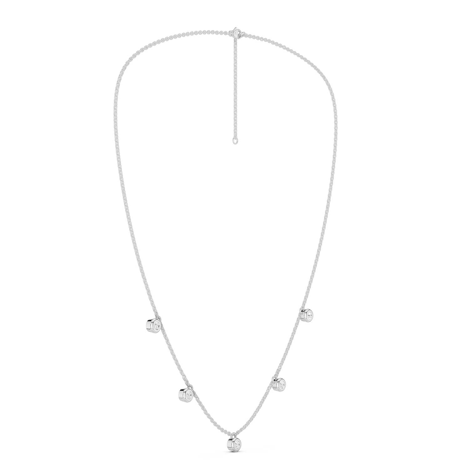 The versatile Mini-Round Encompassing Stationed Necklace showcases a series of carefully selected, round-cut diamonds, set in a manner that maximizes their radiance. It is a perfect blend of elegance and charm for those aspiring minimalists. With five stunning round bezel stations, this classic diamond necklace design offers endless layering possibilities.