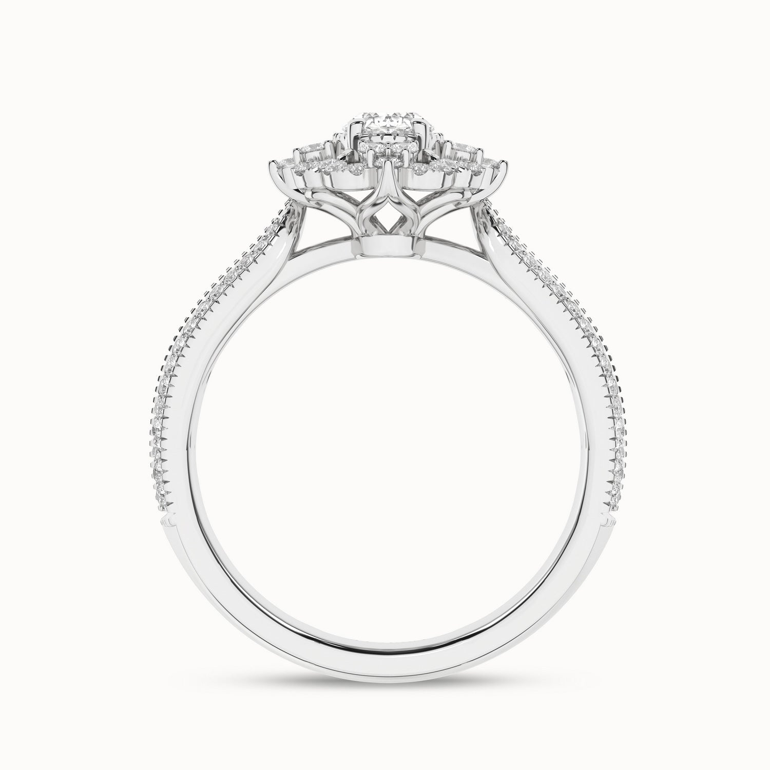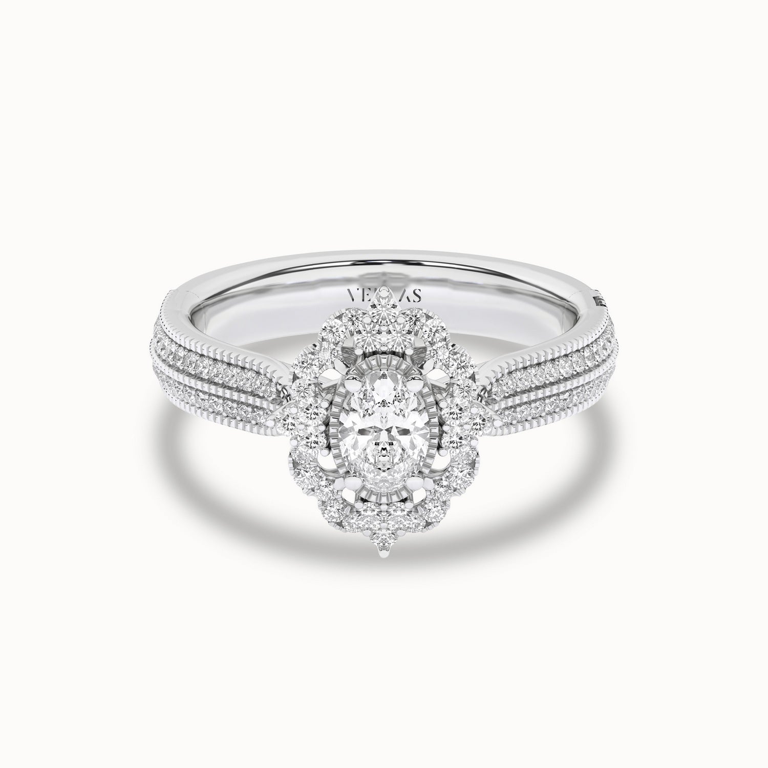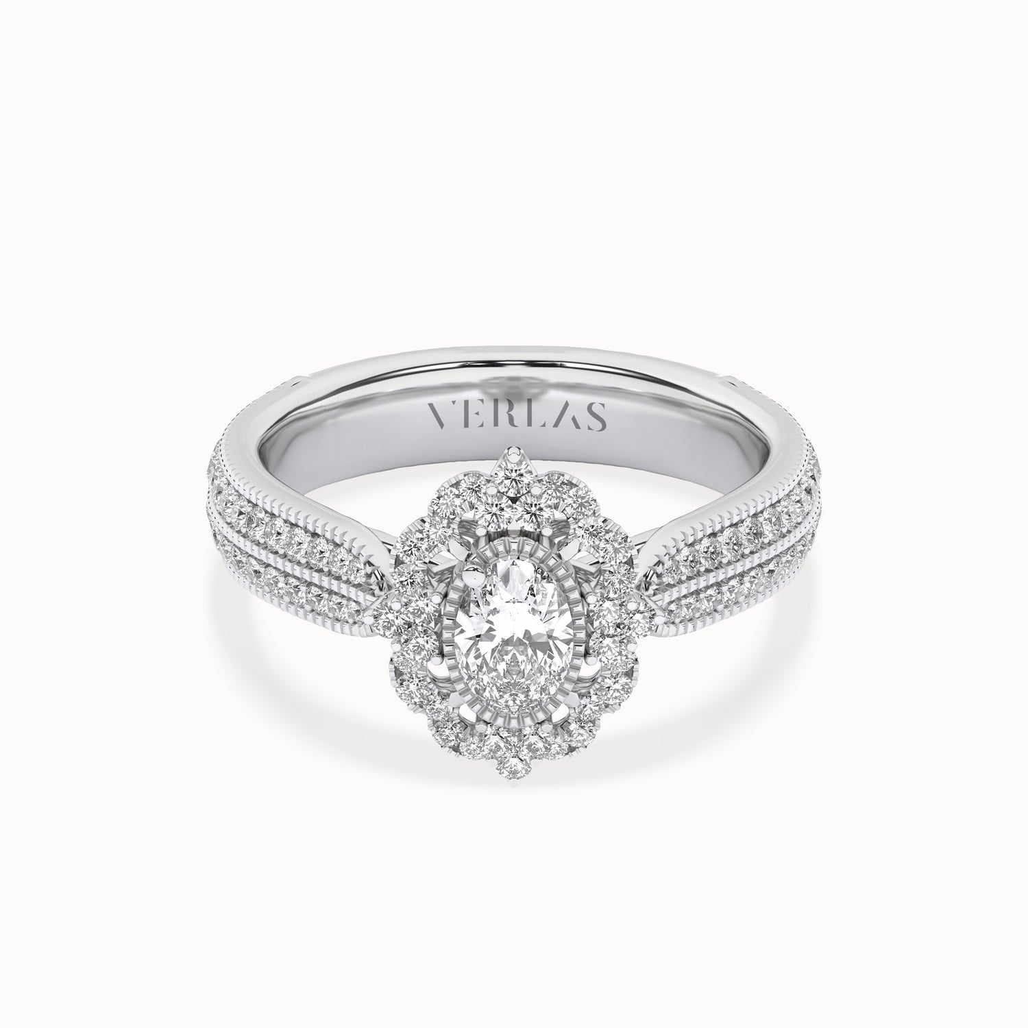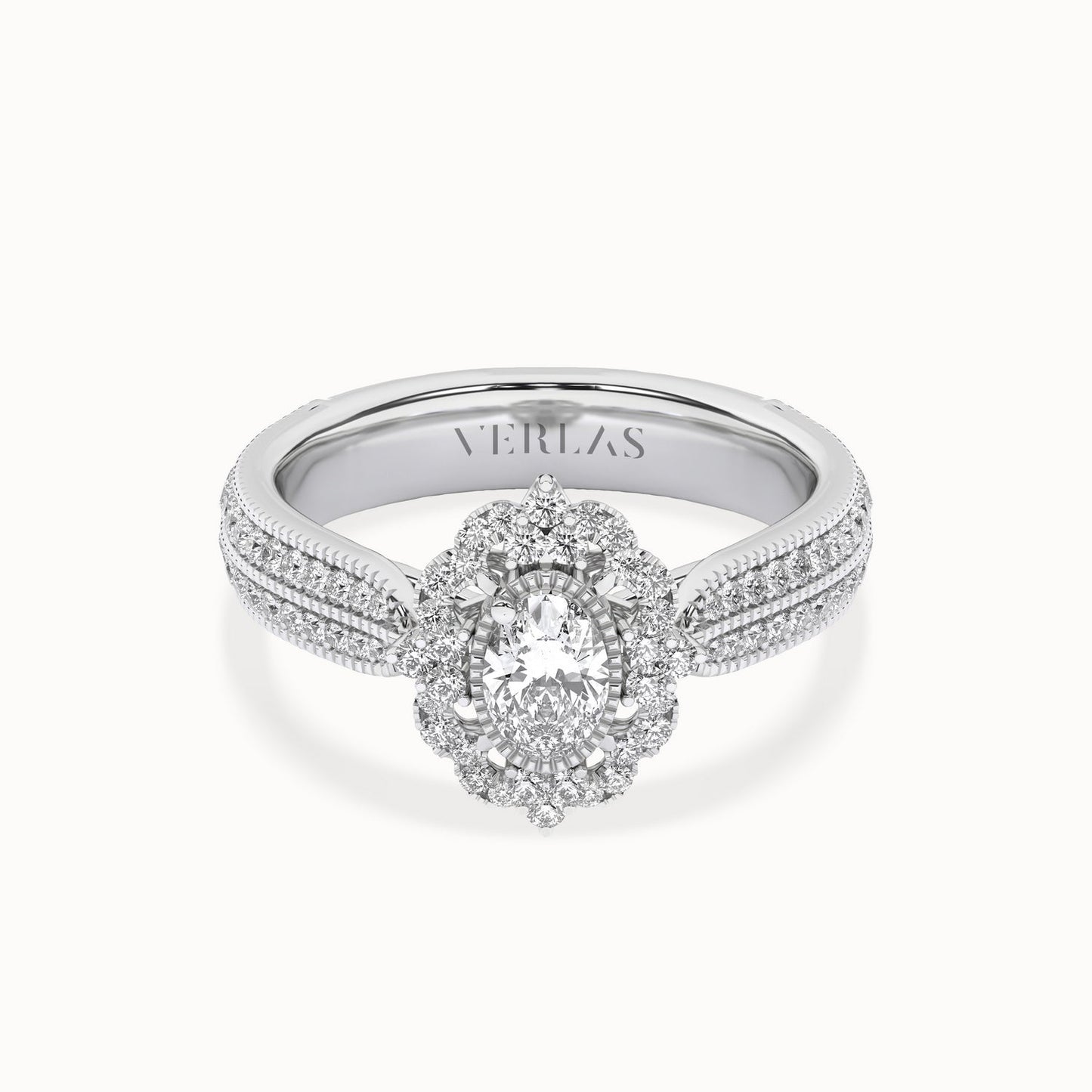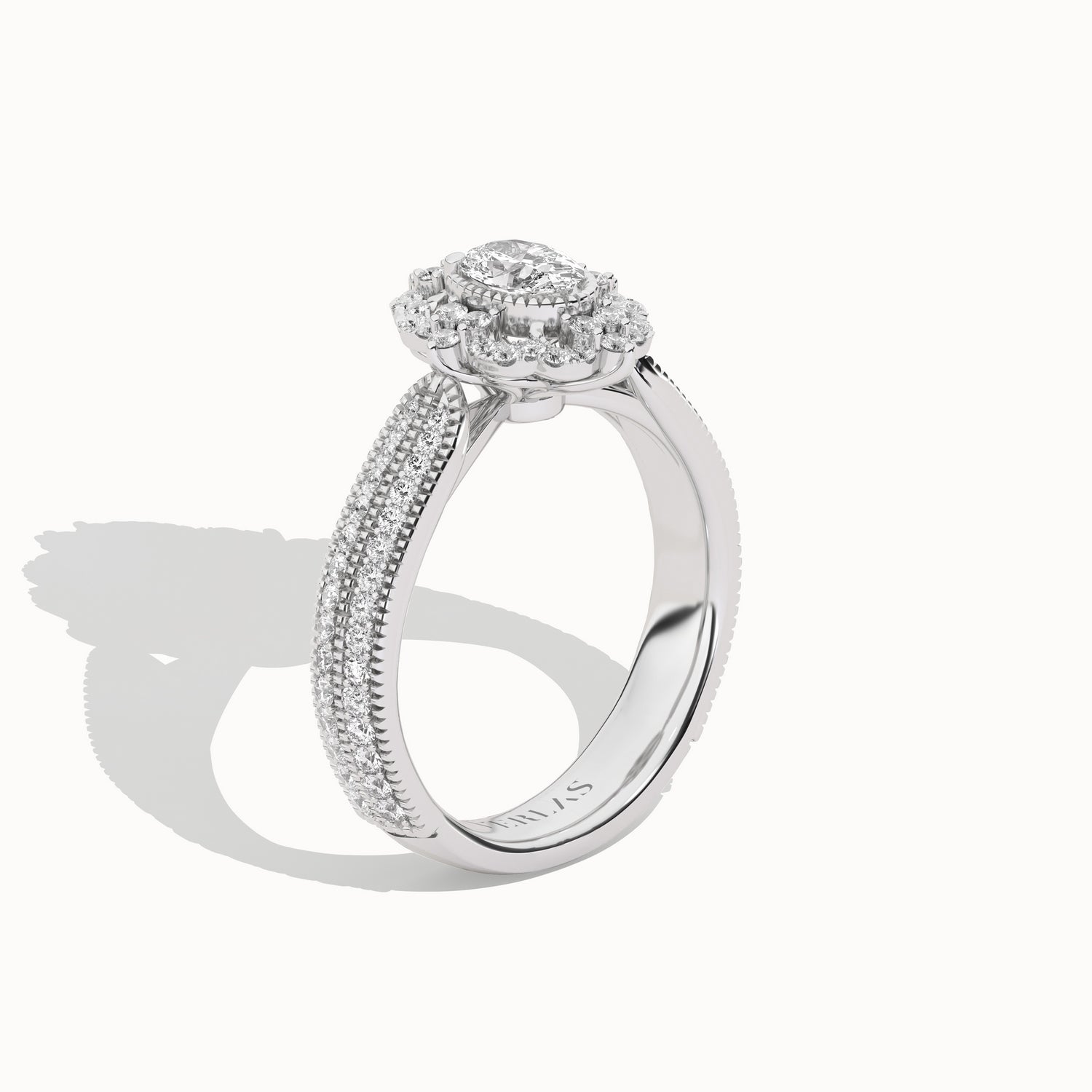 Make a bold statement with this Ornate Ellipse Ring. This exquisite ring features an oval-cut diamond center piece that is surrounded by a halo of radiant round diamonds. Its intricate detailing adds a touch of regal elegance to any outfit. Whether worn alone or stacked . . . Show More