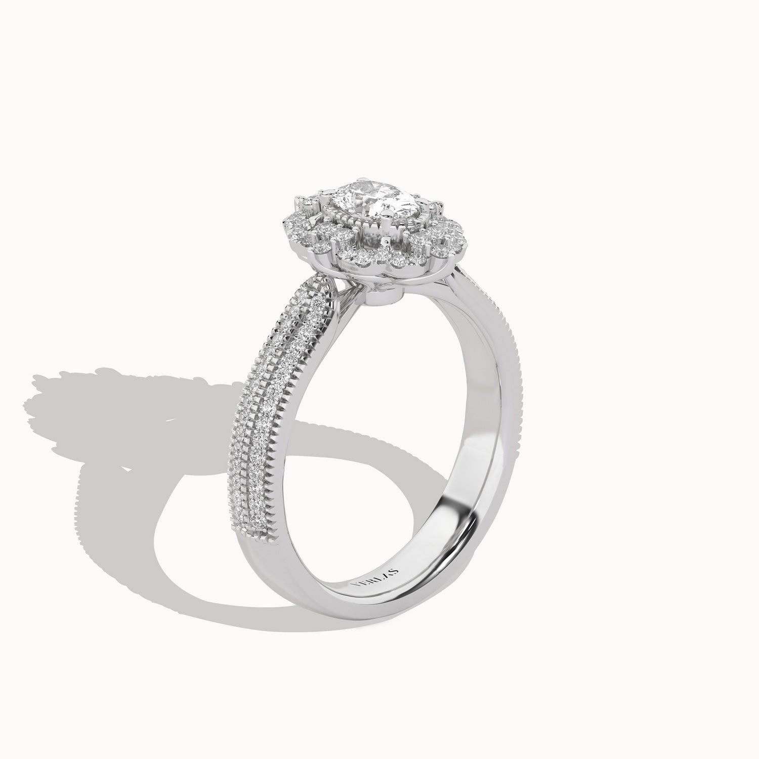 Show LessMake a bold statement with this Ornate Ellipse Ring. This exquisite ring features an oval-cut diamond center piece that is surrounded by a halo of radiant round diamonds. Its intric. . . Show More