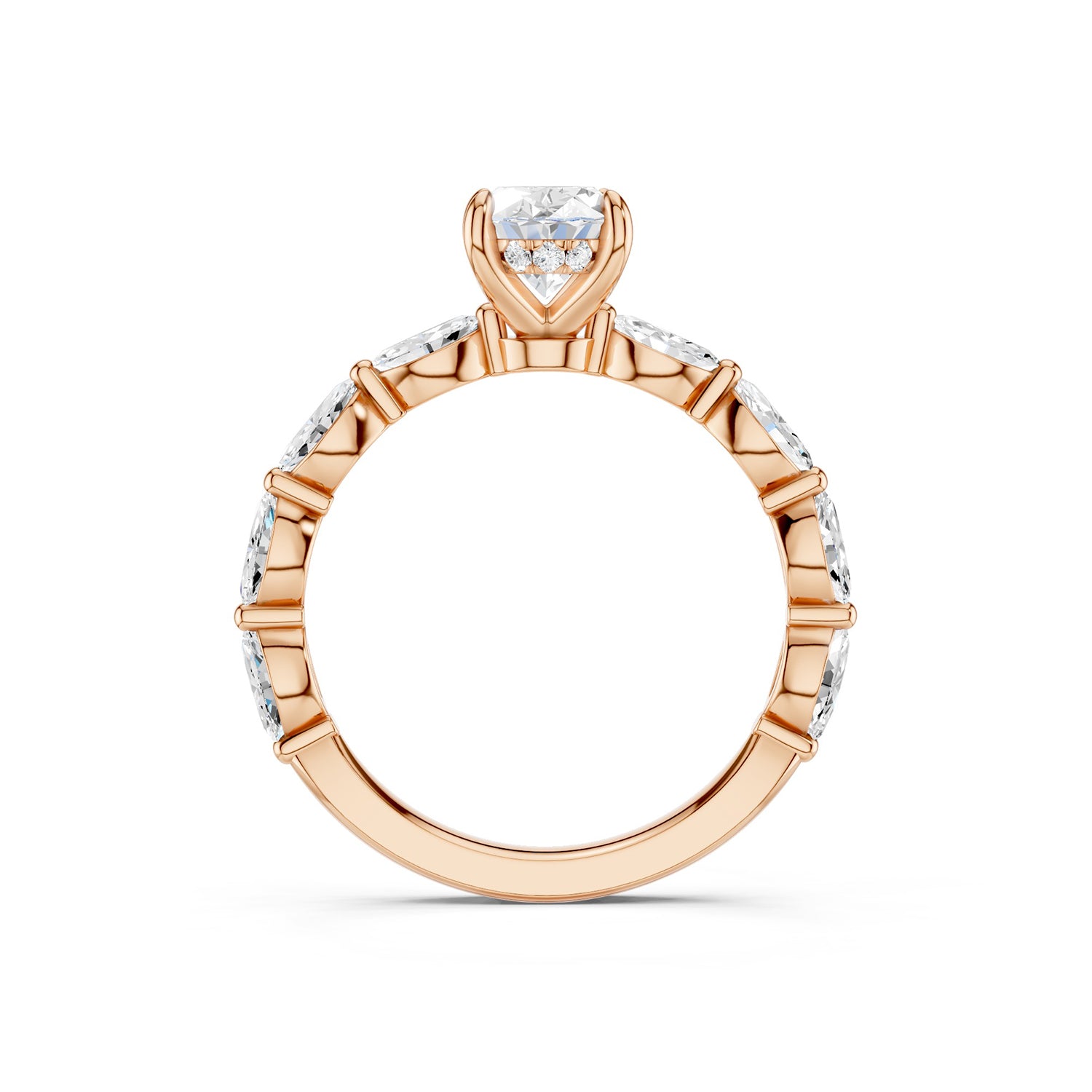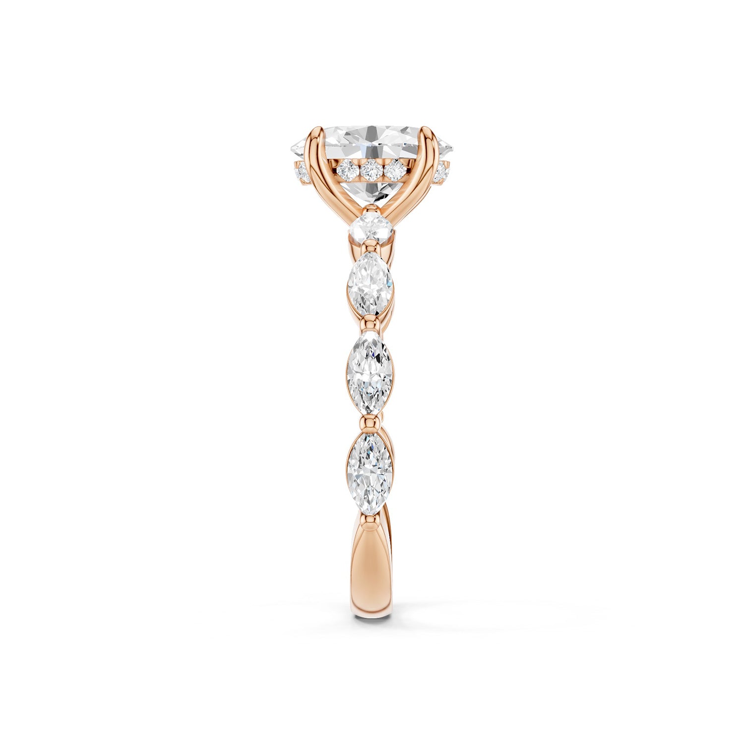 Unveil brilliance with the Oval-Marquise Hidden Halo Diamond Ring, a lustrous oval-cut lab-grown diamond takes center stage, surrounded by a subtle hidden halo that glimmers with movement. Marquise-shaped diamonds along the polished gold band add sculptural depth and flowing elegance, making the diamond ring an exceptional choice for engagements, anniversaries, or milestone celebrations.