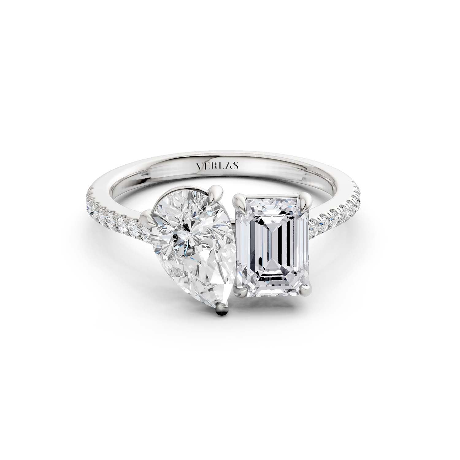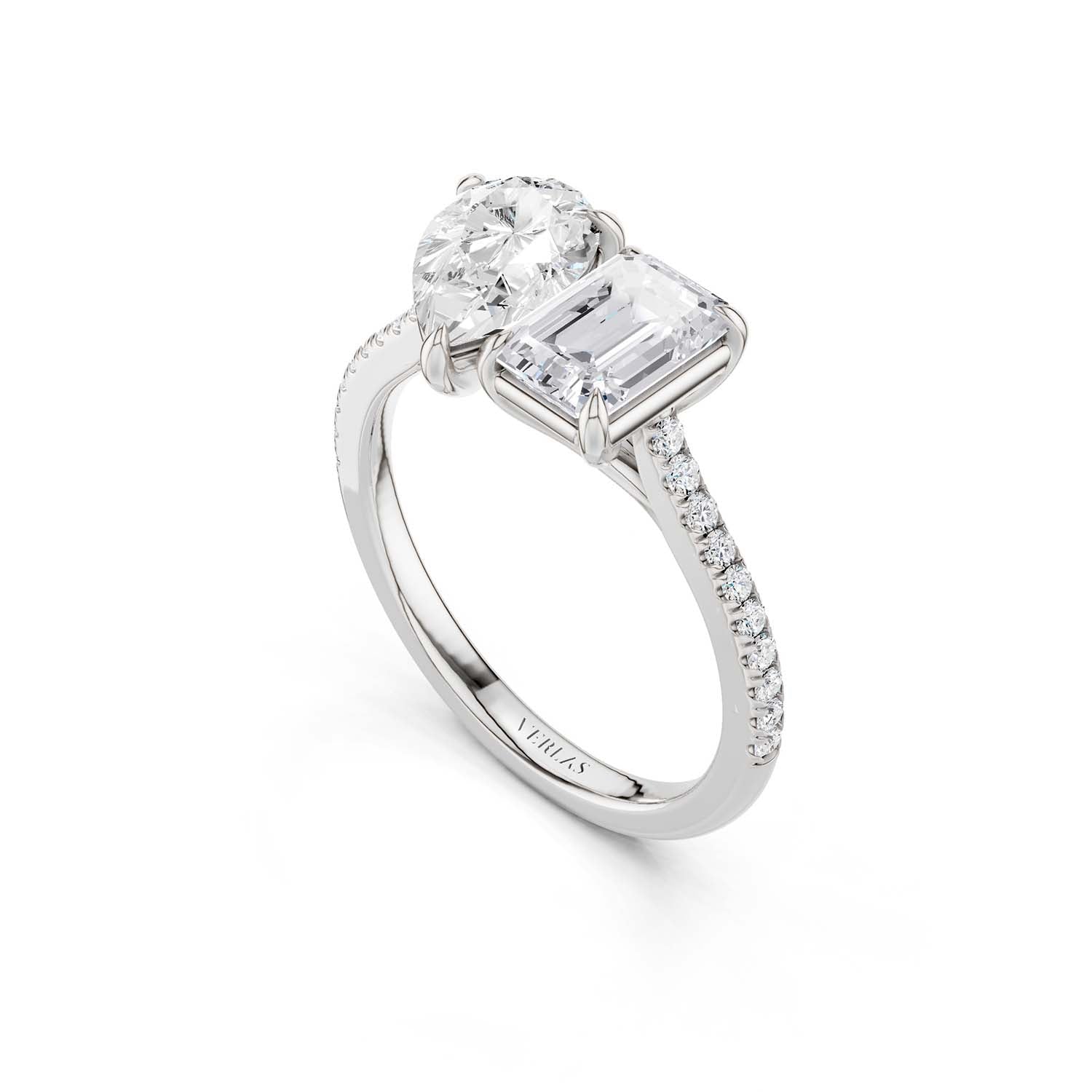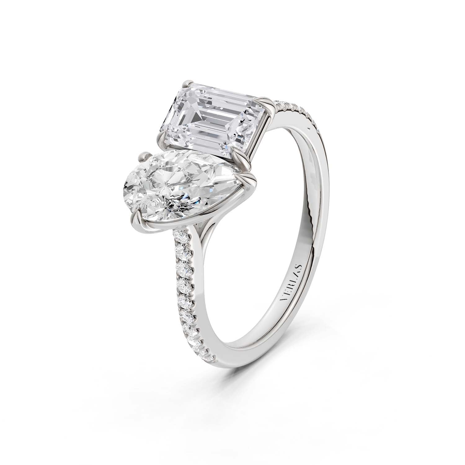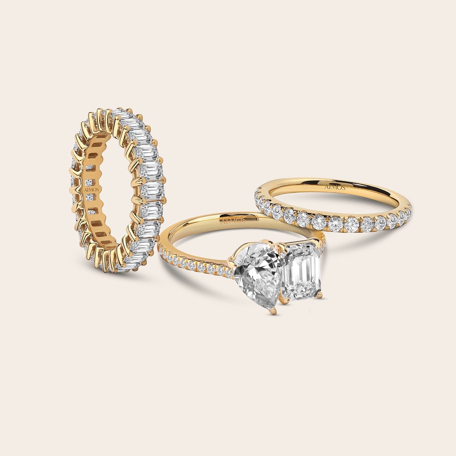 Wonderfully elegant, this two-stone ring plays with the foundations of the Toi et Moi ring, which are positioned side by side, representing the union of two lovers. The design features a combination of pear and emerald-shaped Atmos diamonds in a solid gold prong setting. This ring is a perfeCt. choice for couples looking for something equally classic and unconventional.