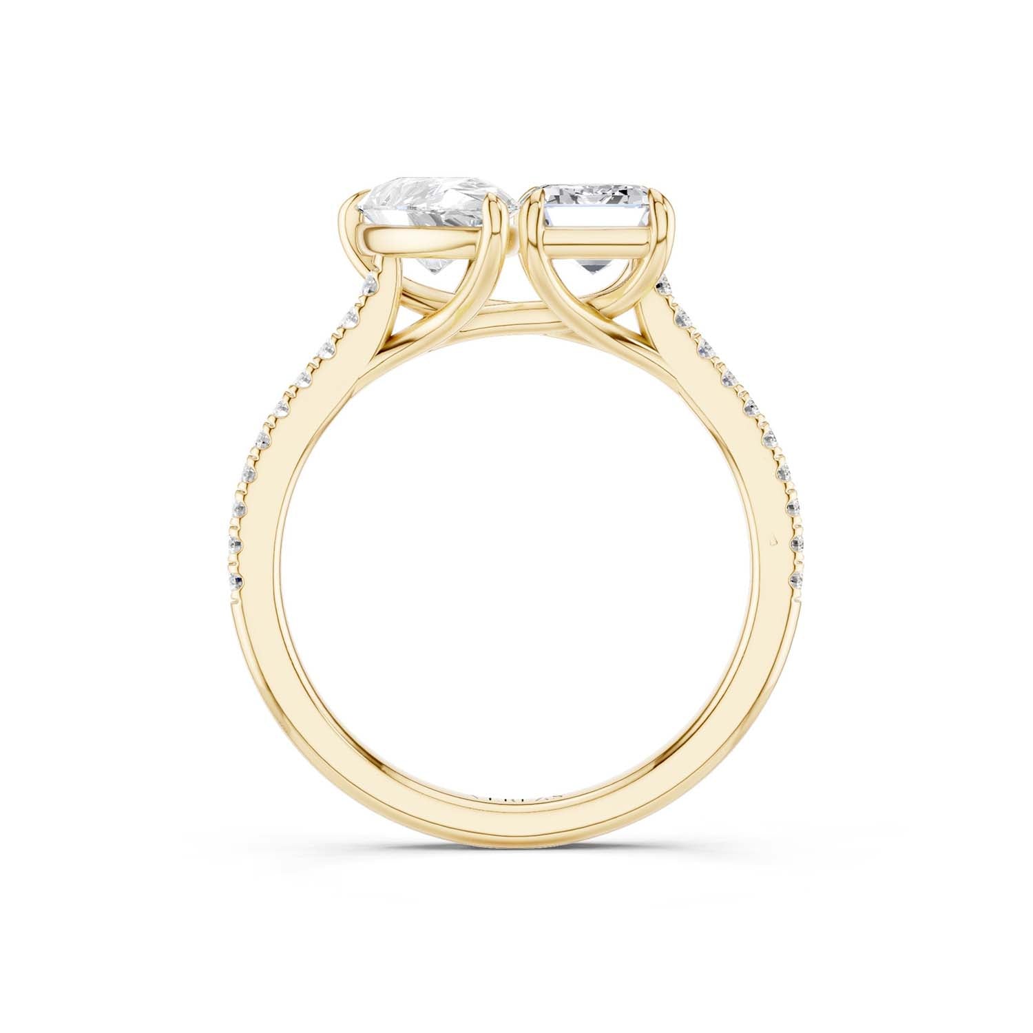 Wonderfully elegant, this two-stone ring plays with the foundations of the Toi et Moi ring, which are positioned side by side, representing the union of two lovers. The design features a combination of pear and emerald-shaped Atmos diamonds in a solid gold prong setting.. . . Read More