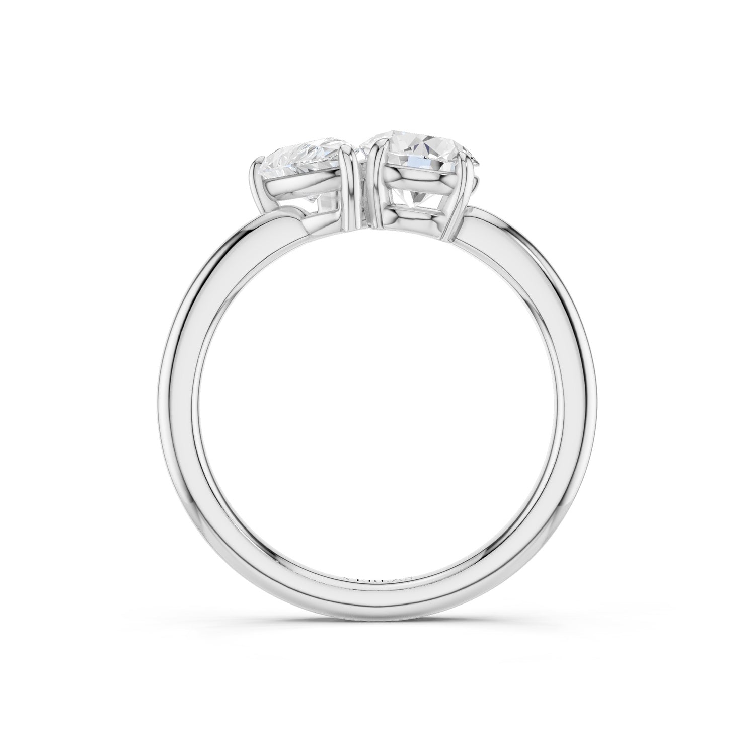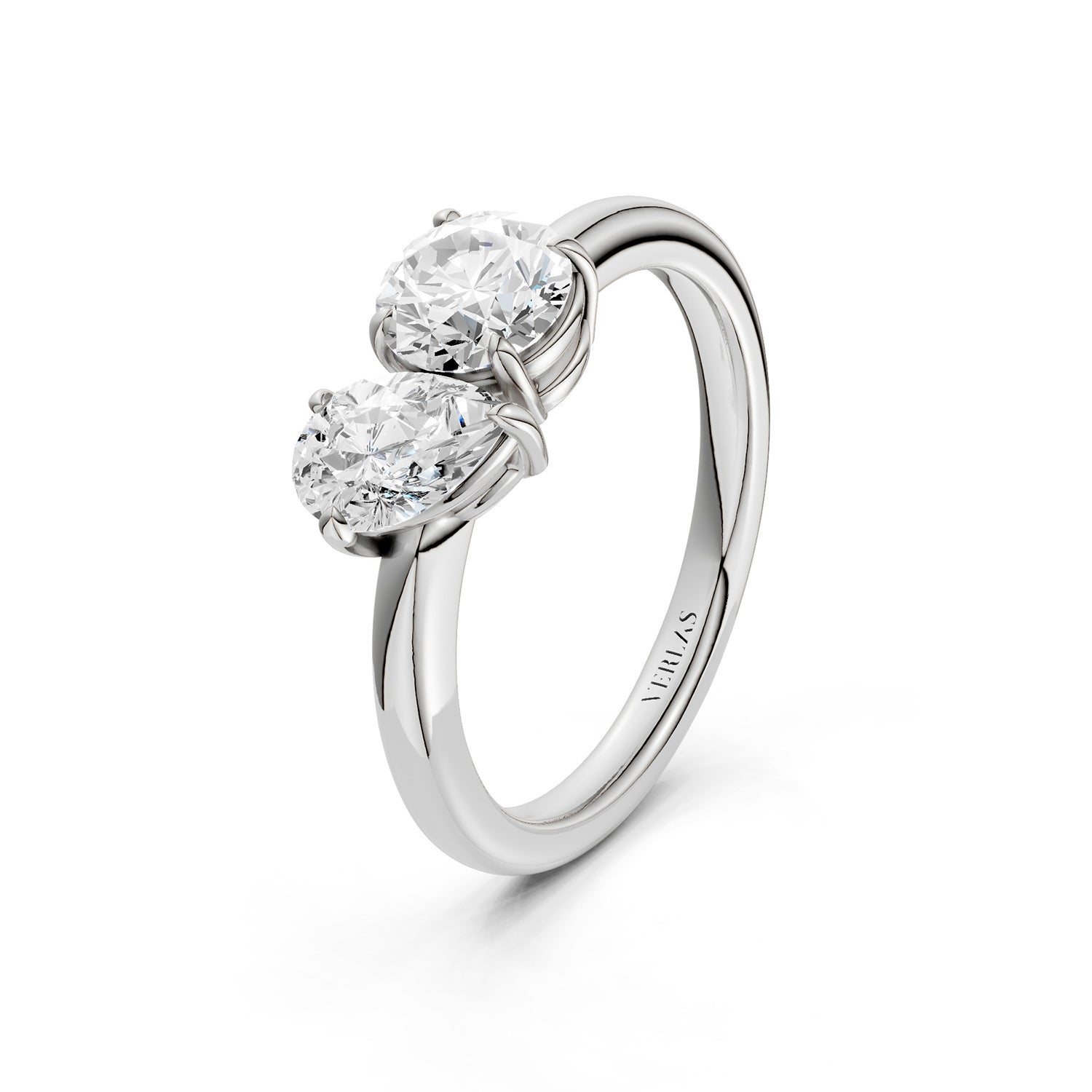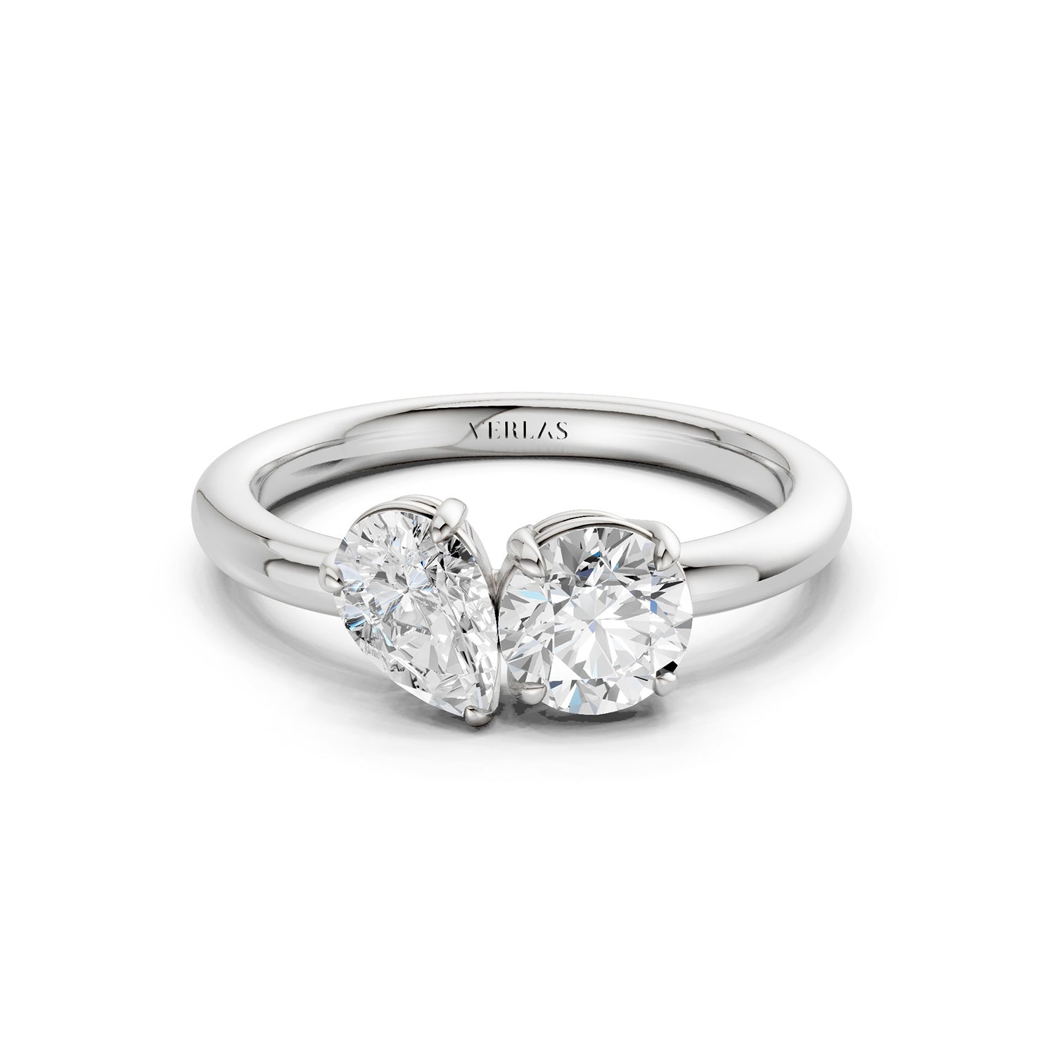 This lab-grown diamond ring captures the essence of your combined spirits into an extraordinary piece of jewelry. Featuring both pear and round diamonds in prong settings, this gold two stone ring is a memento of your shared experiences and your continued devotion.