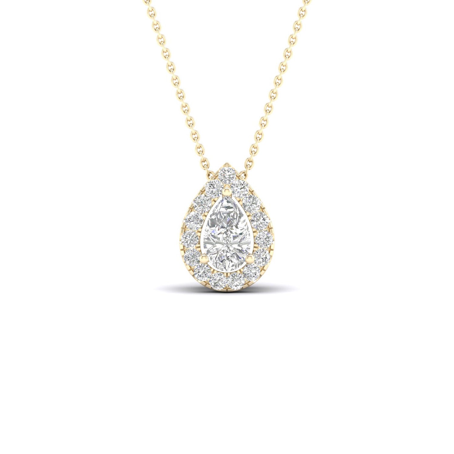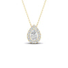 This enchanting Petite Dewdrop Halo Necklace features a petite dewdrop-shaped diamond. Surrounding it is a captivating halo of round diamonds, each one amplifying the radiance of the center stone. The design of this diamond pendant necklace is both delicate and intricate, making it a perfect accessory to add charm to your every look.