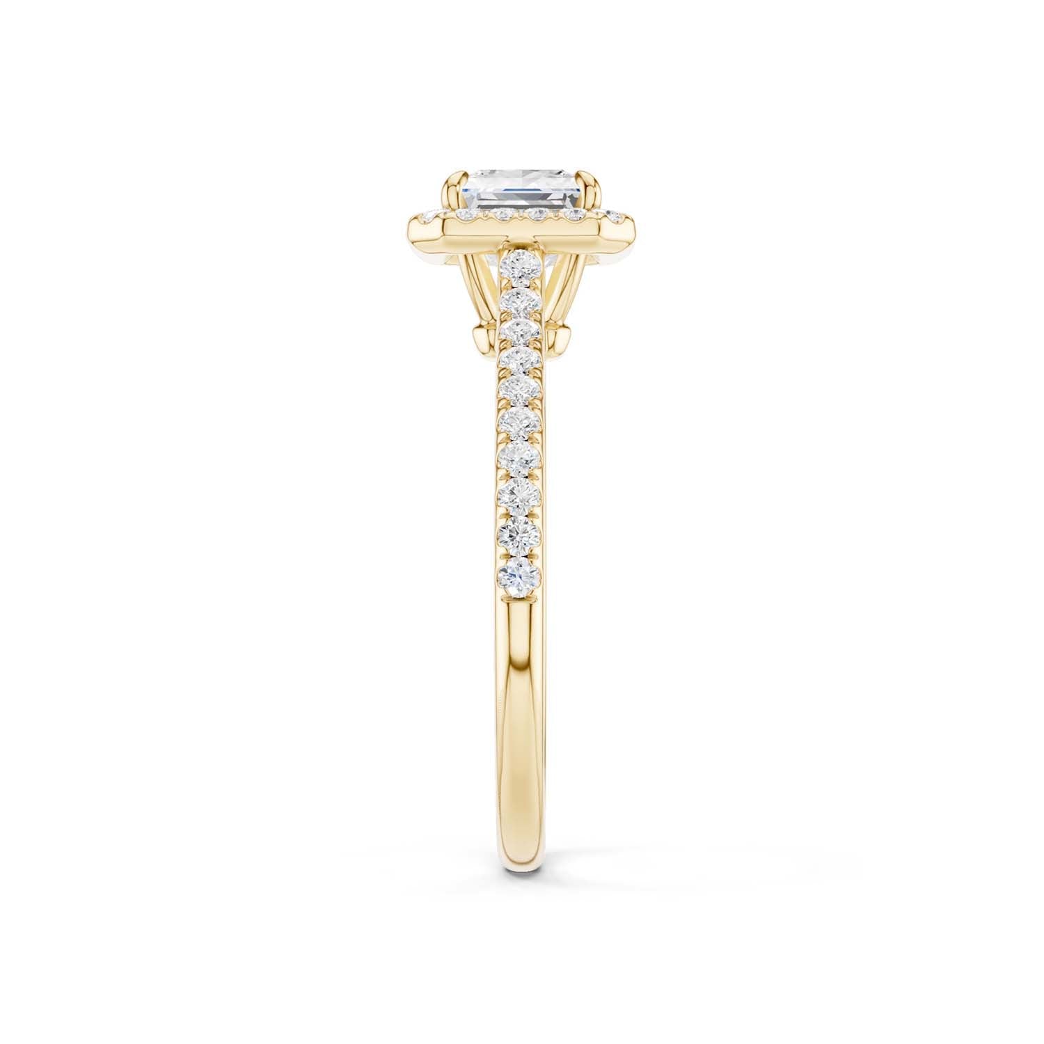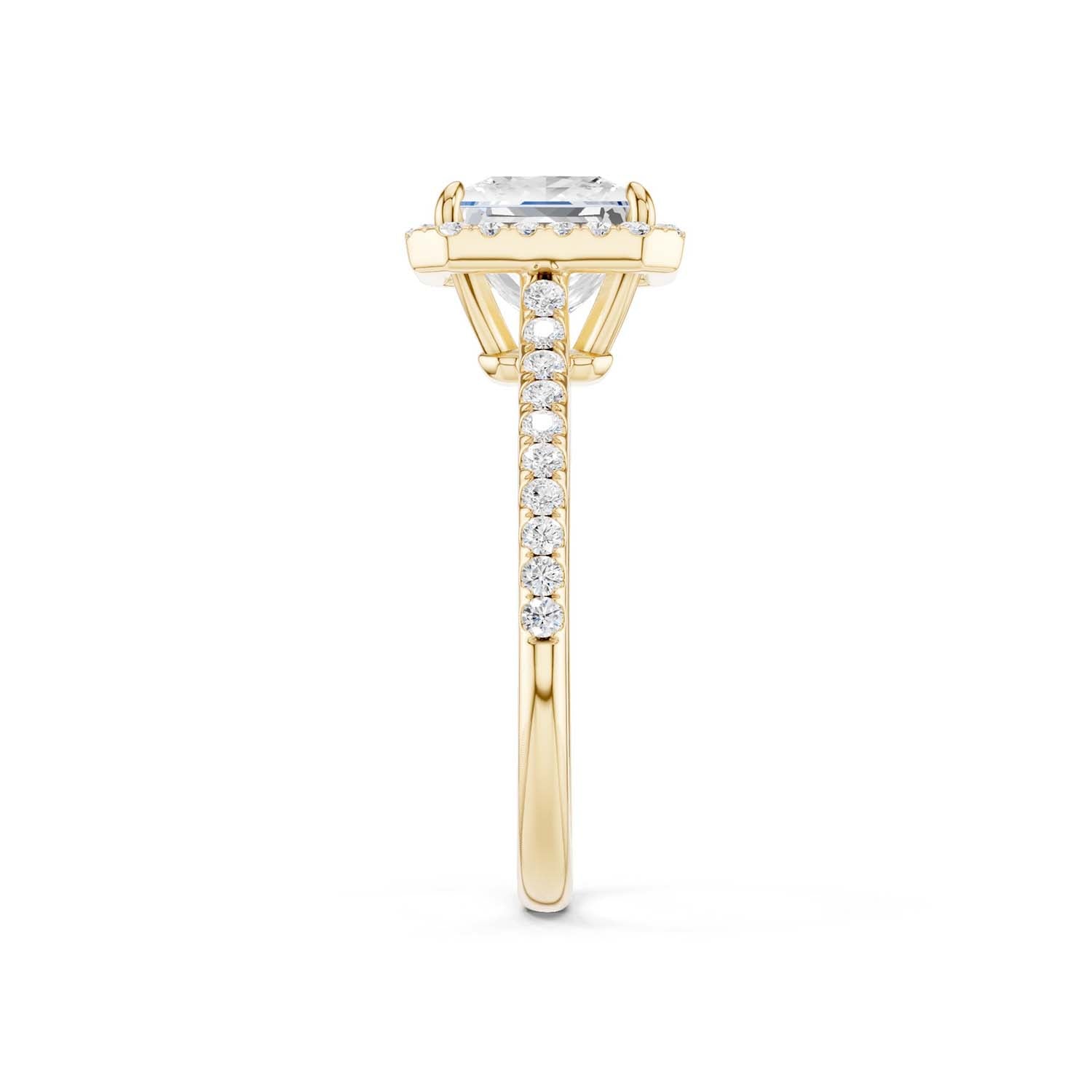 This princess-cut halo ring is the perfect mix of modern and vintage design, crafted to accent the beauty of brilliant round diamonds in a halo setting. Set in lustrous gold, the band is embellished in petite shimmering lab-grown diamonds radiating from every angle.