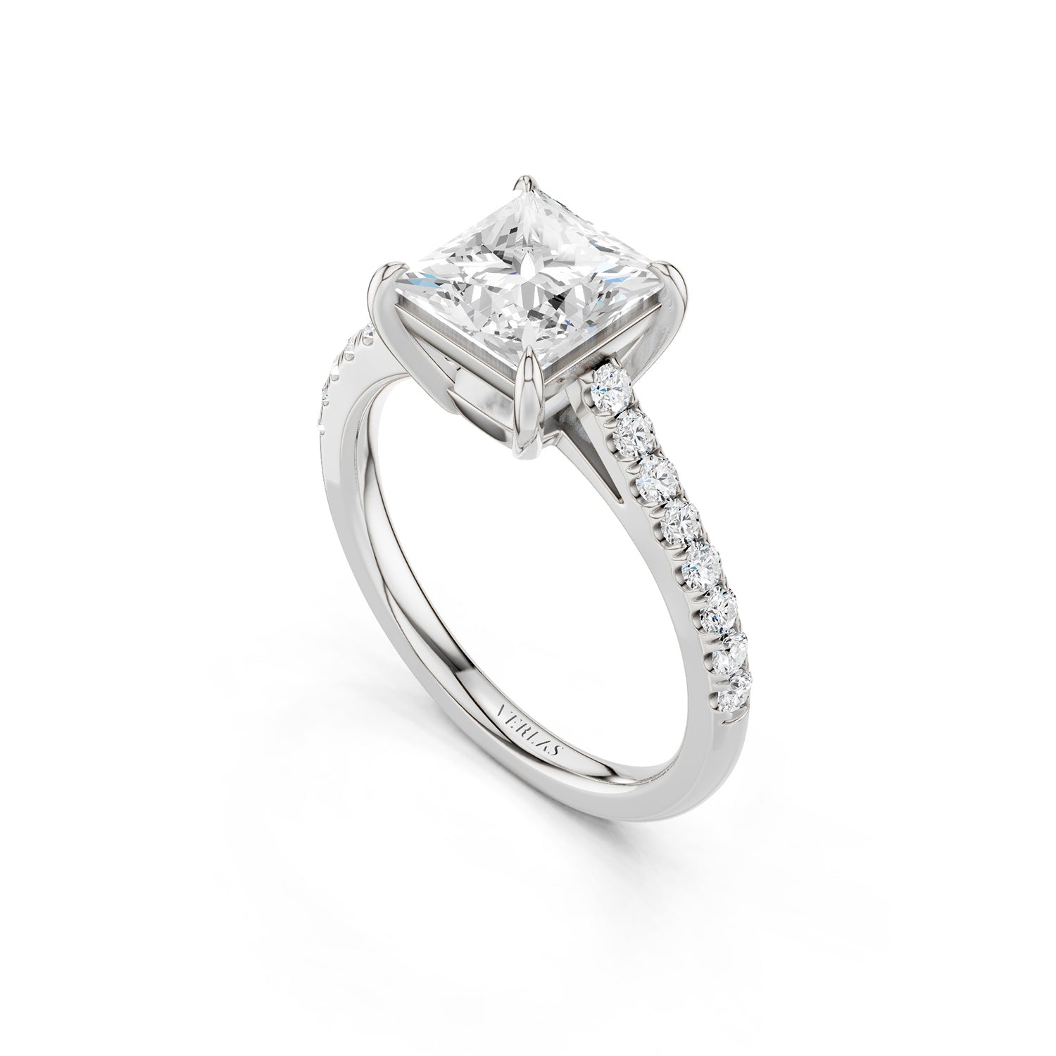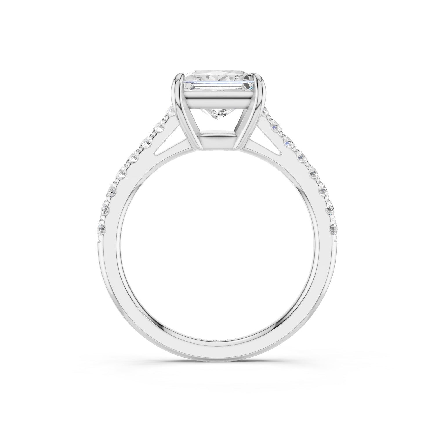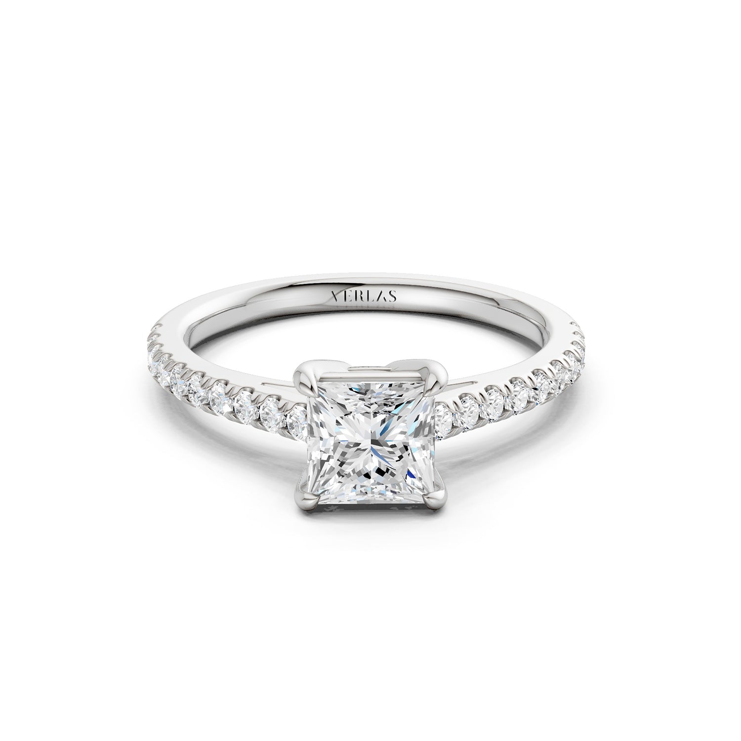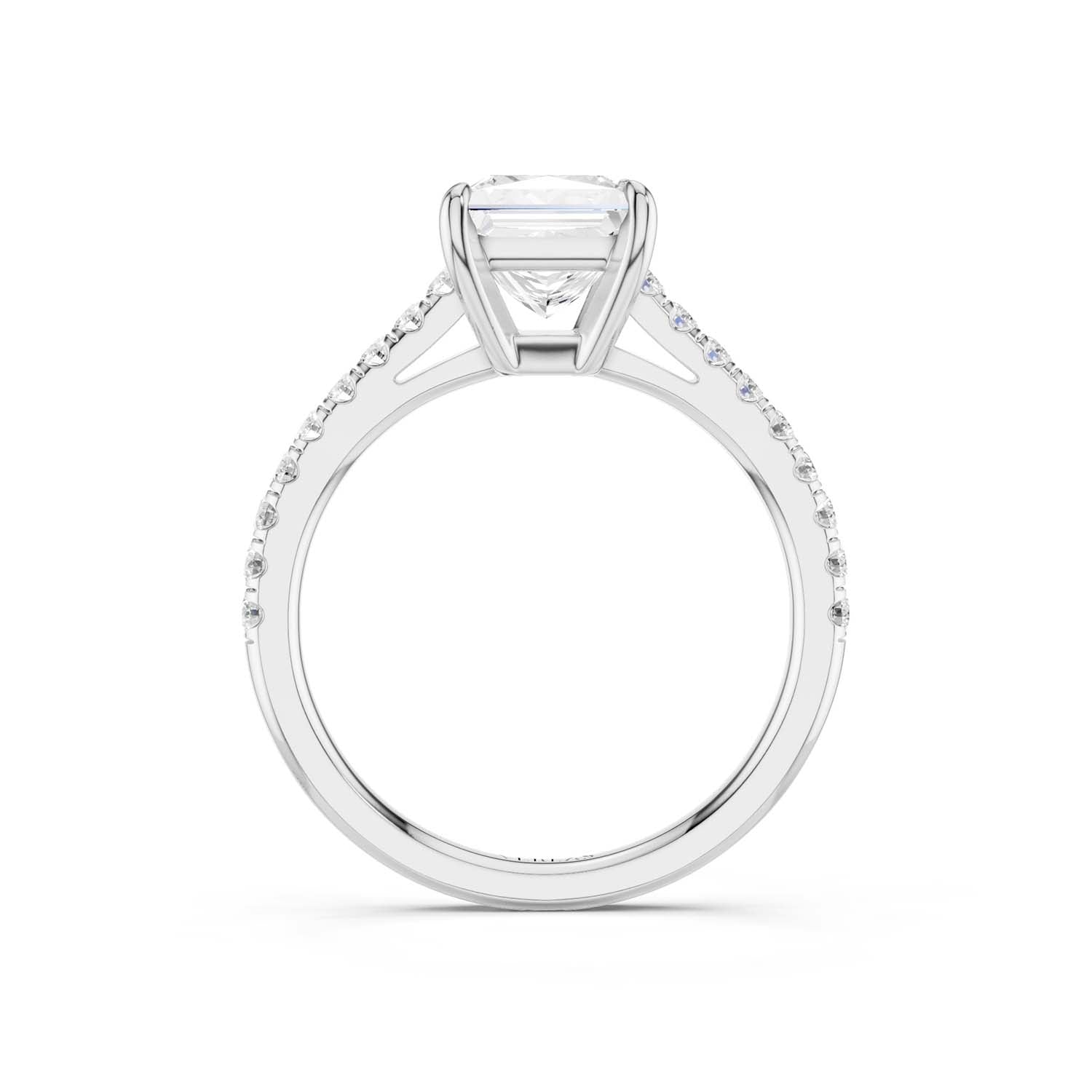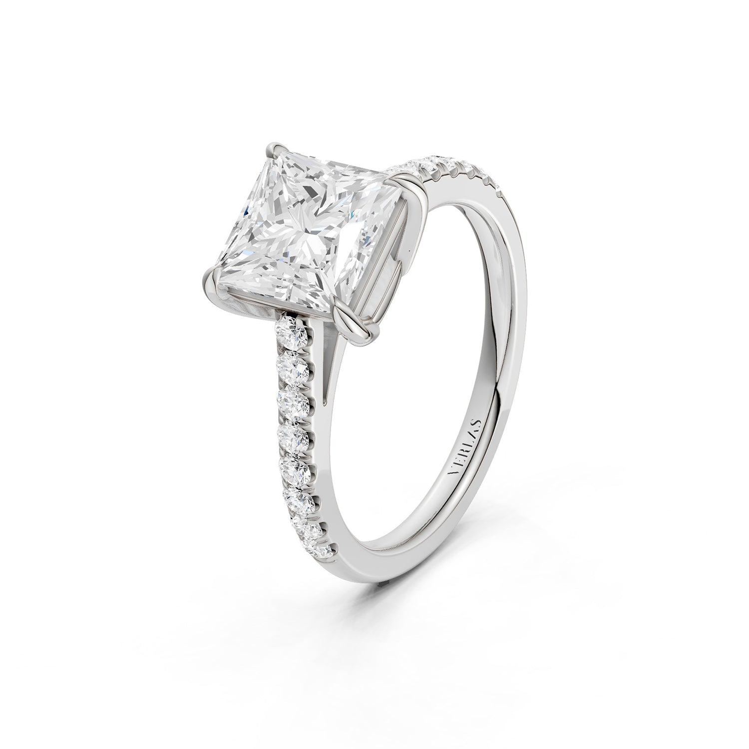 This lab-made diamond engagement ring features sparkling pavé diamonds that extend three-fourths of the way around the ring. Graceful four-claw prongs embrace the princess-cut center diamond, giving this ring a timeless appeal.