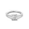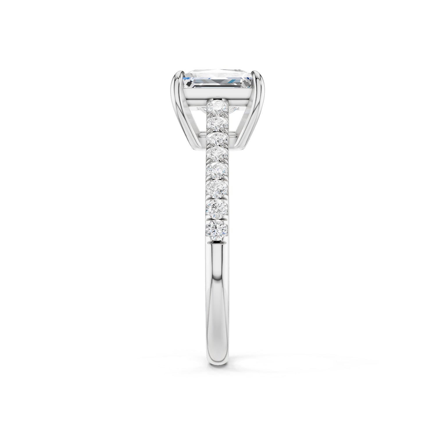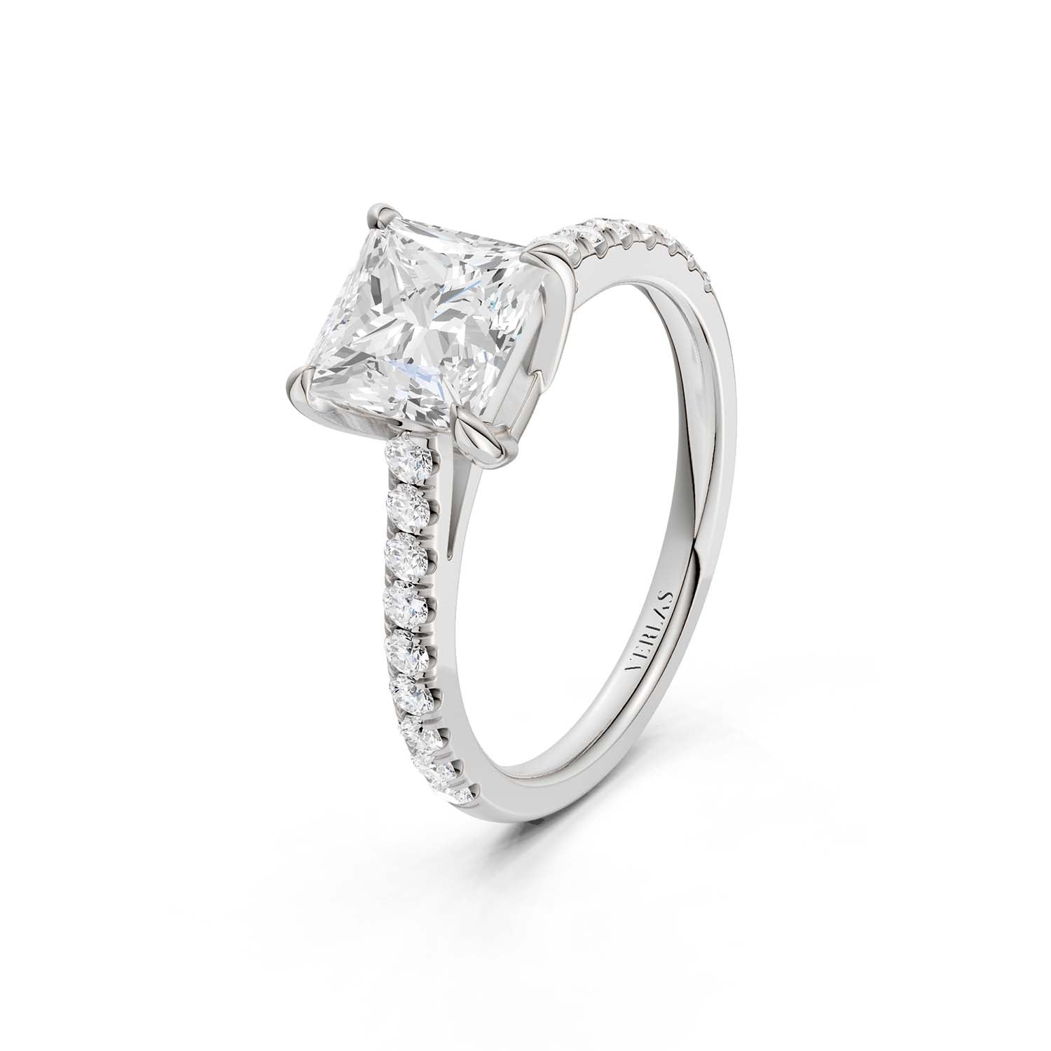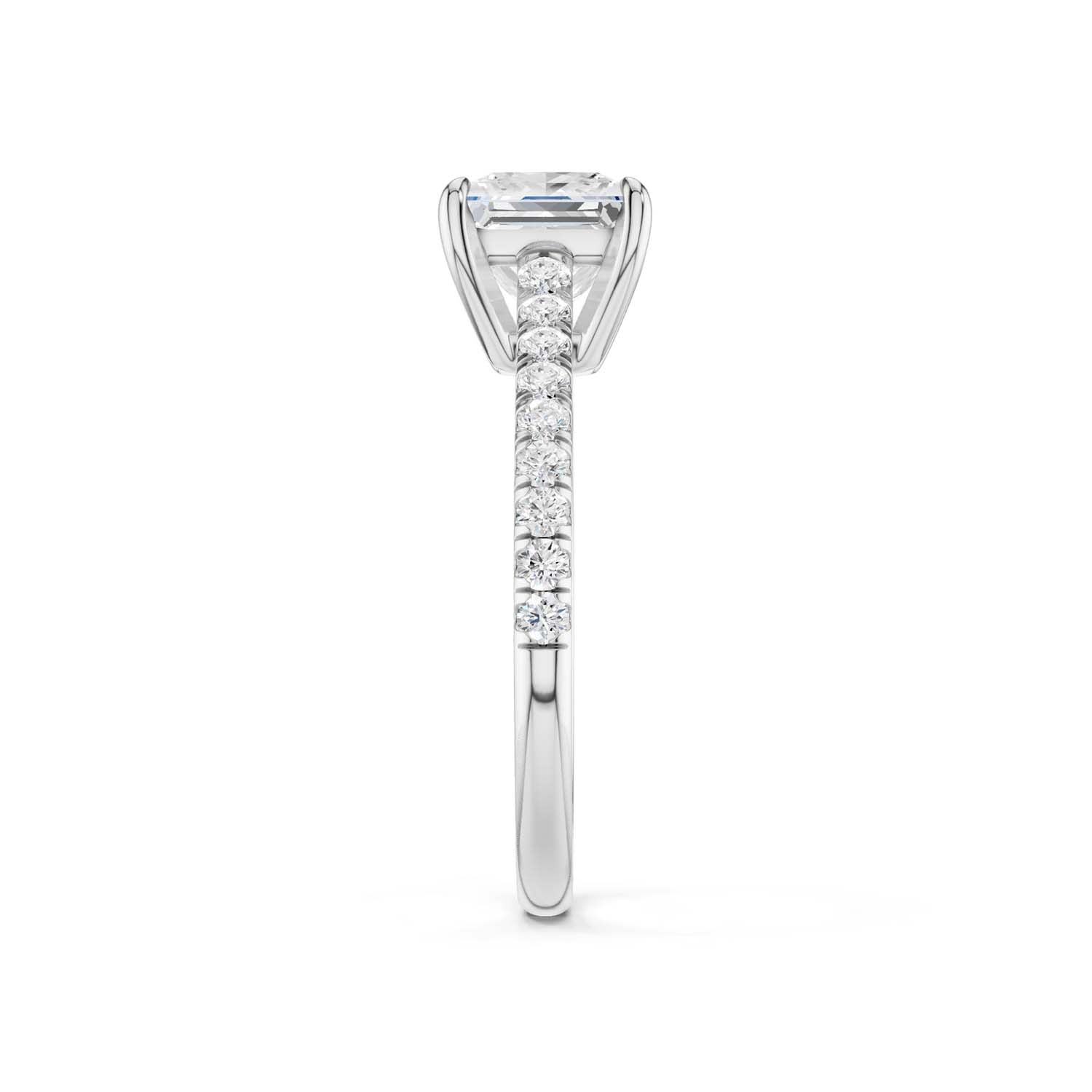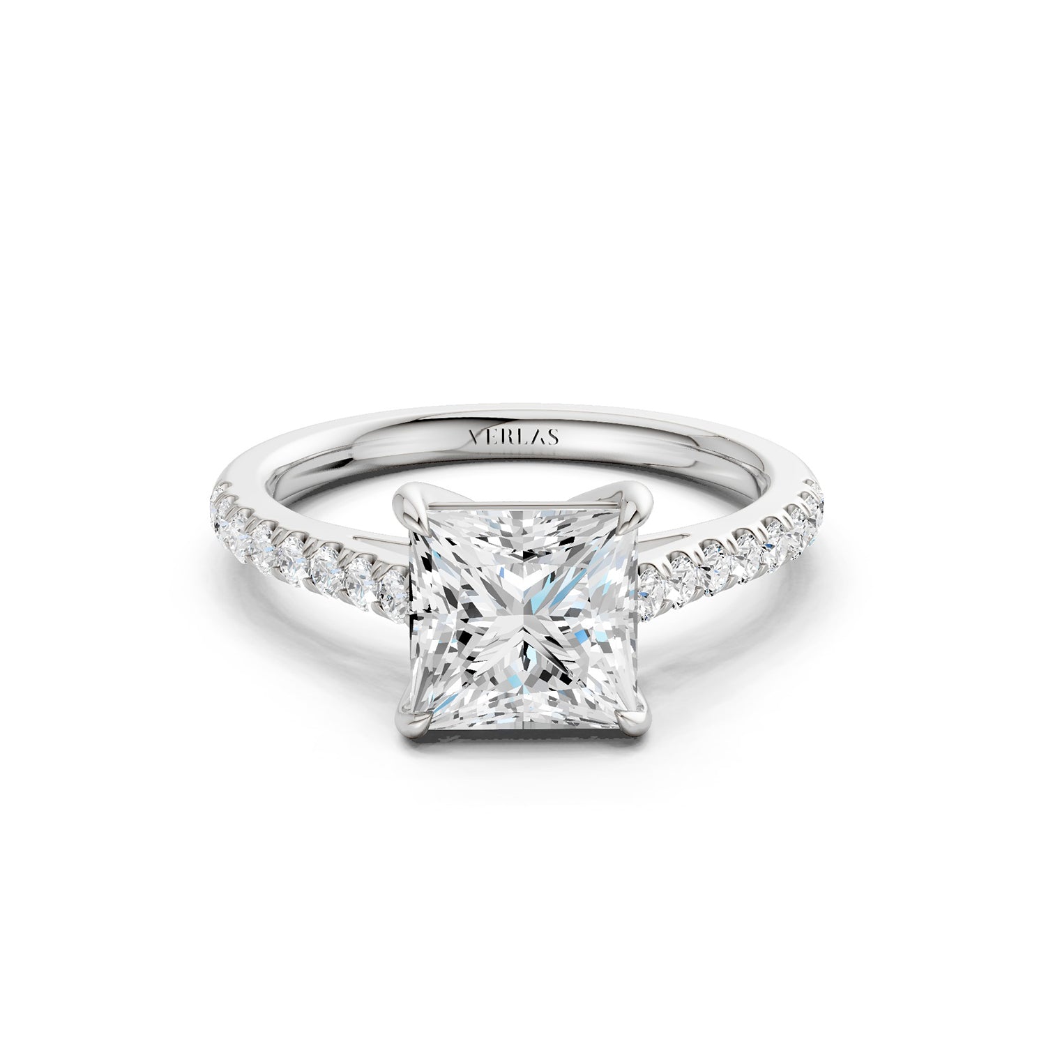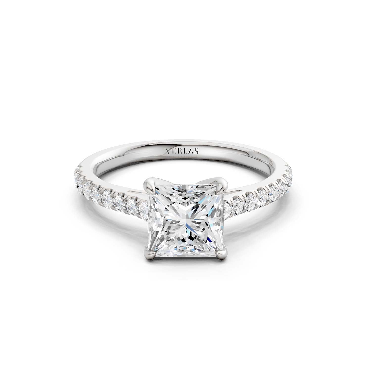 This lab-made diamond engagement ring features sparkling pavé diamonds that extend three-fourths of the way around the ring. Graceful four-claw prongs embrace the princess-cut center diamond, giving this ring a timeless appeal.