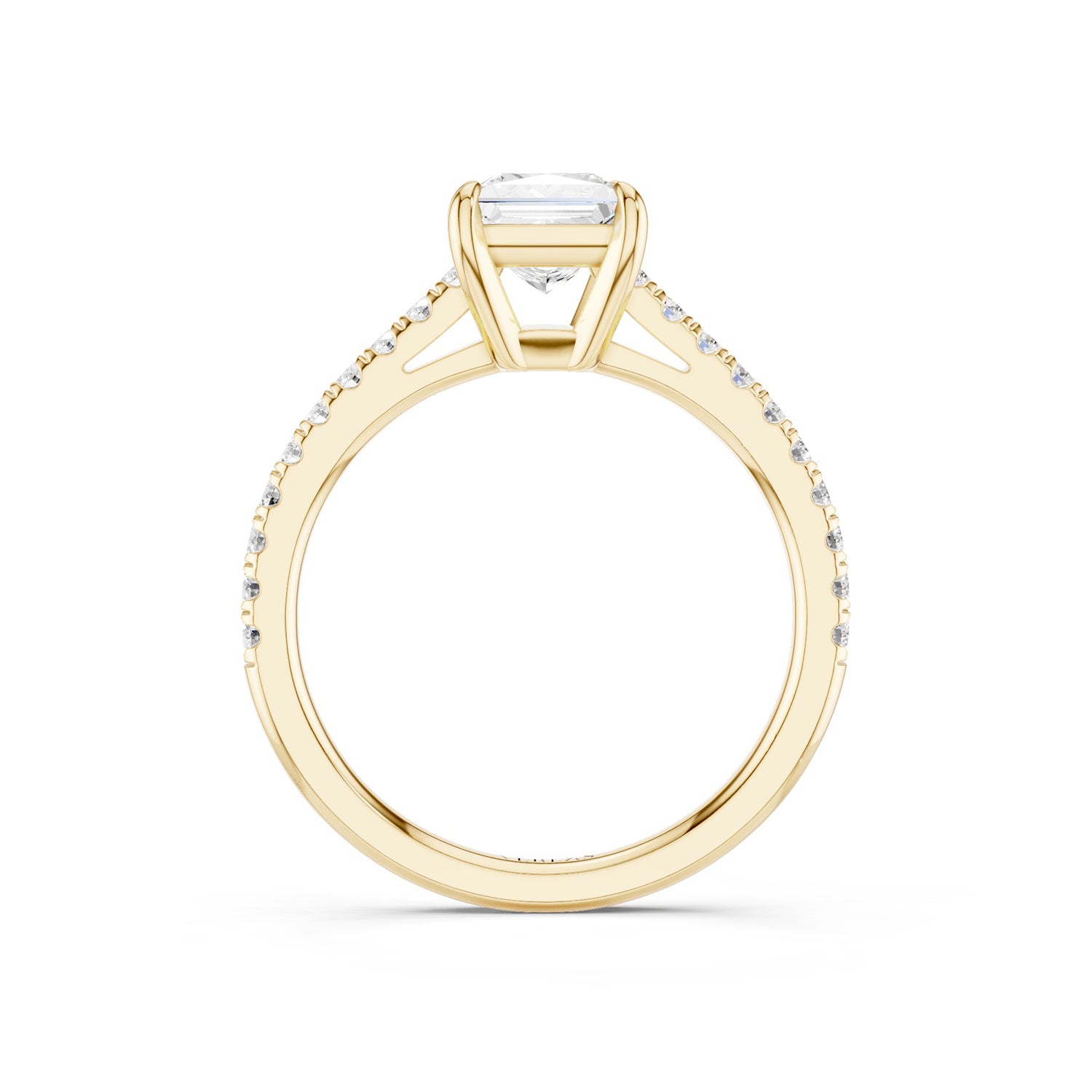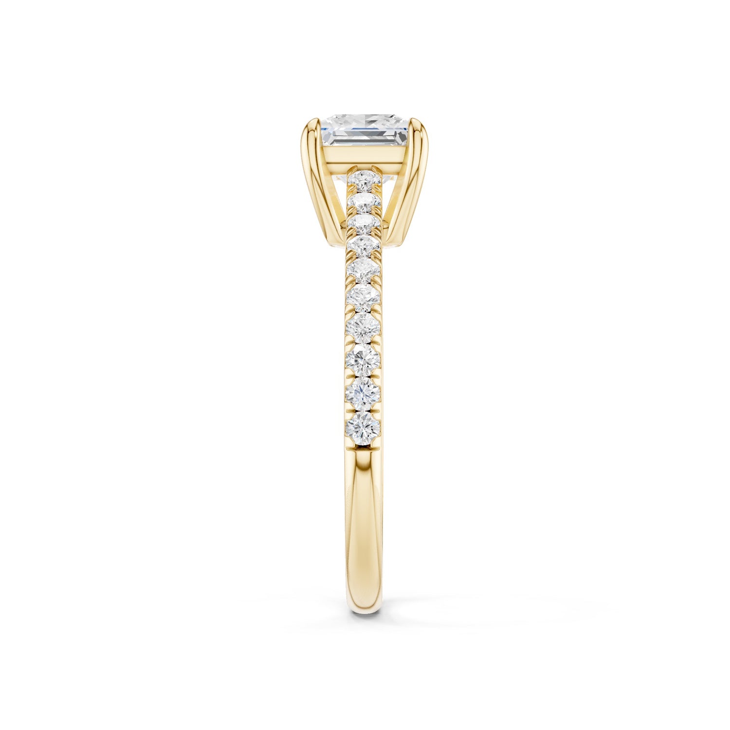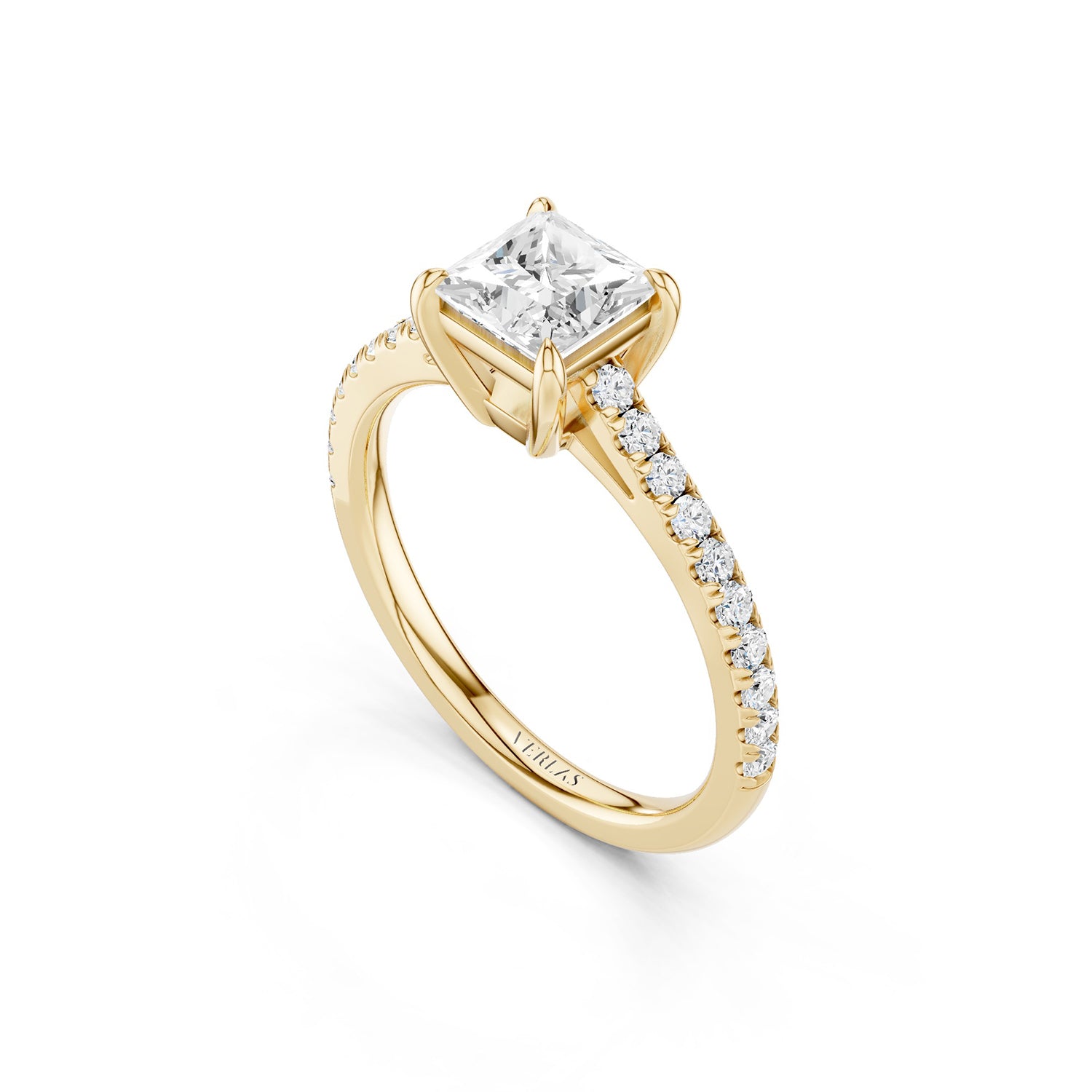 This lab-made diamond engagement ring features sparkling pavé diamonds that extend three-fourths of the way around the ring. Graceful four-claw prongs embrace the princess-cut center diamond, giving this ring a timeless appeal.