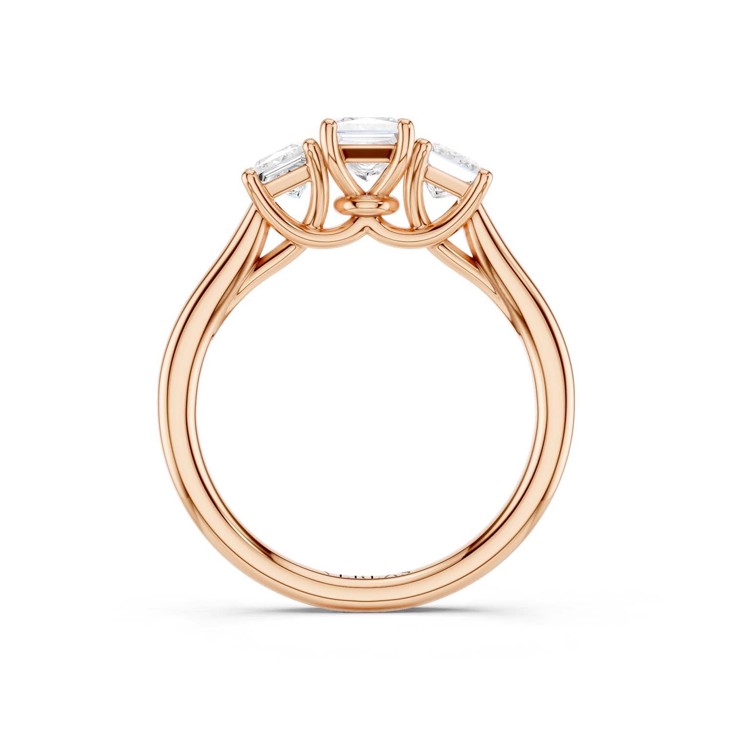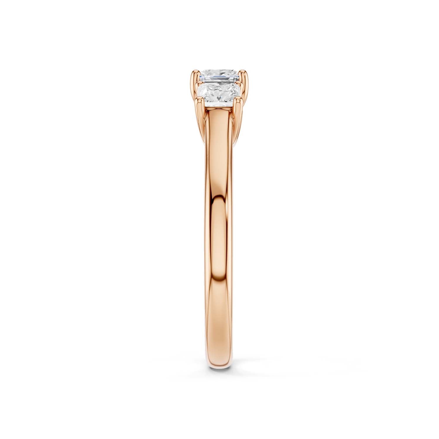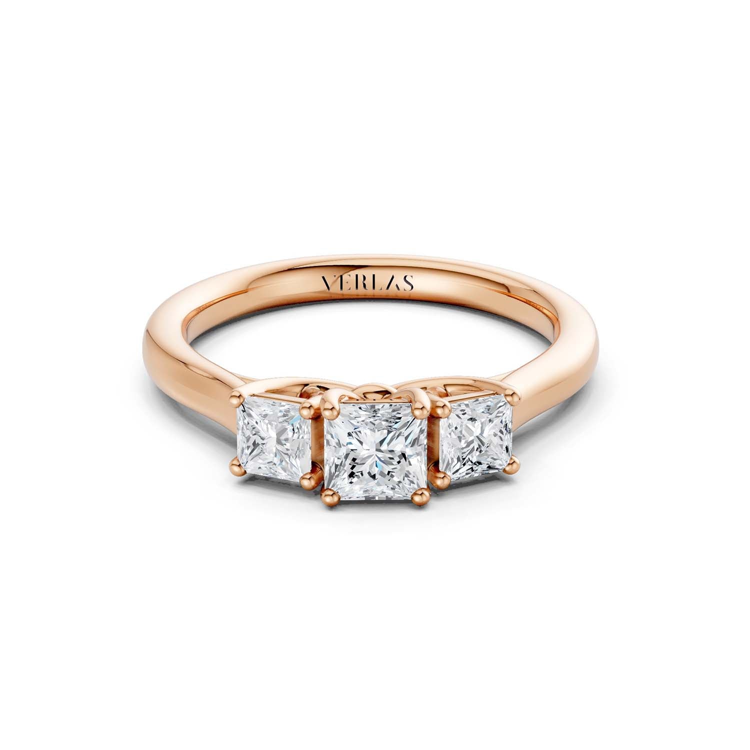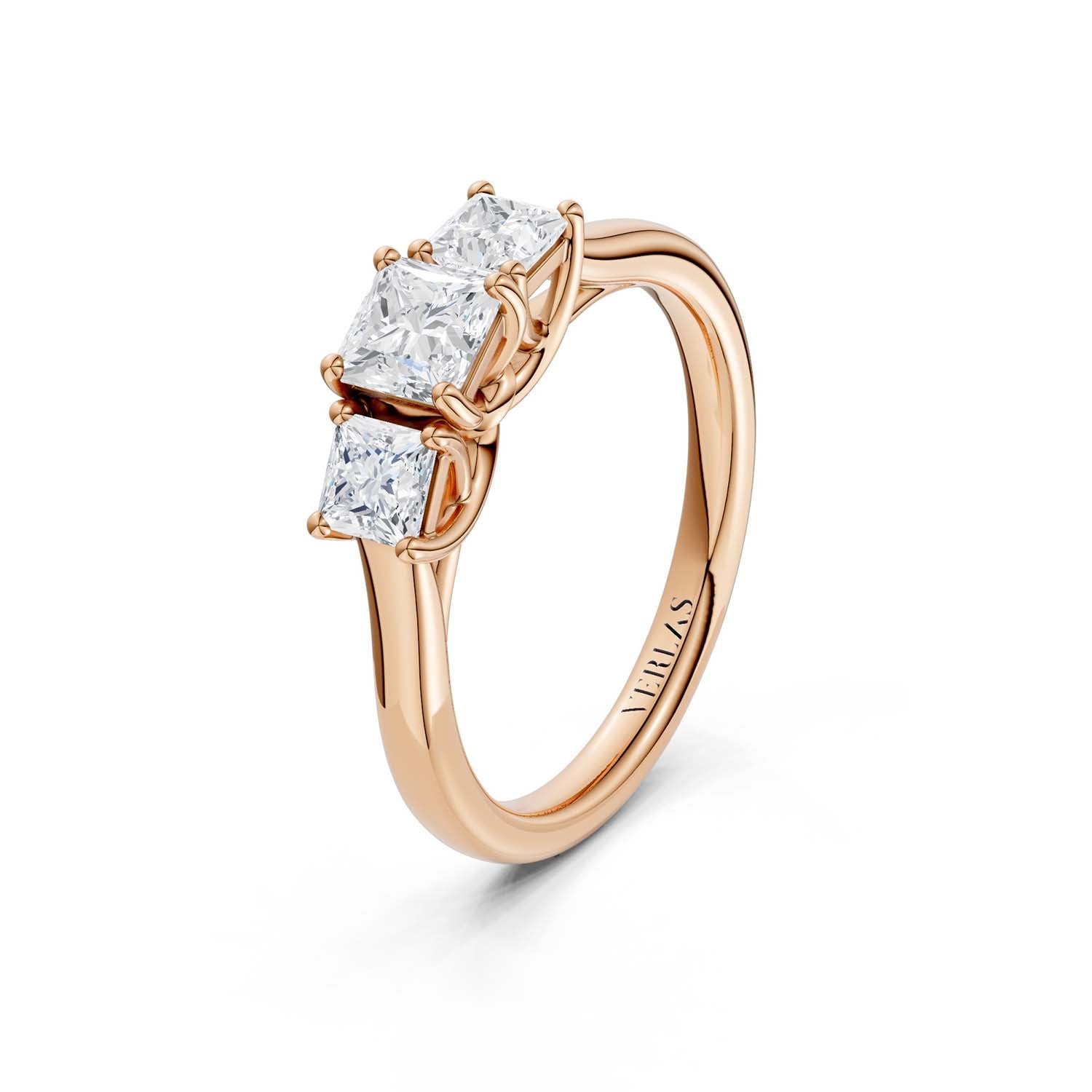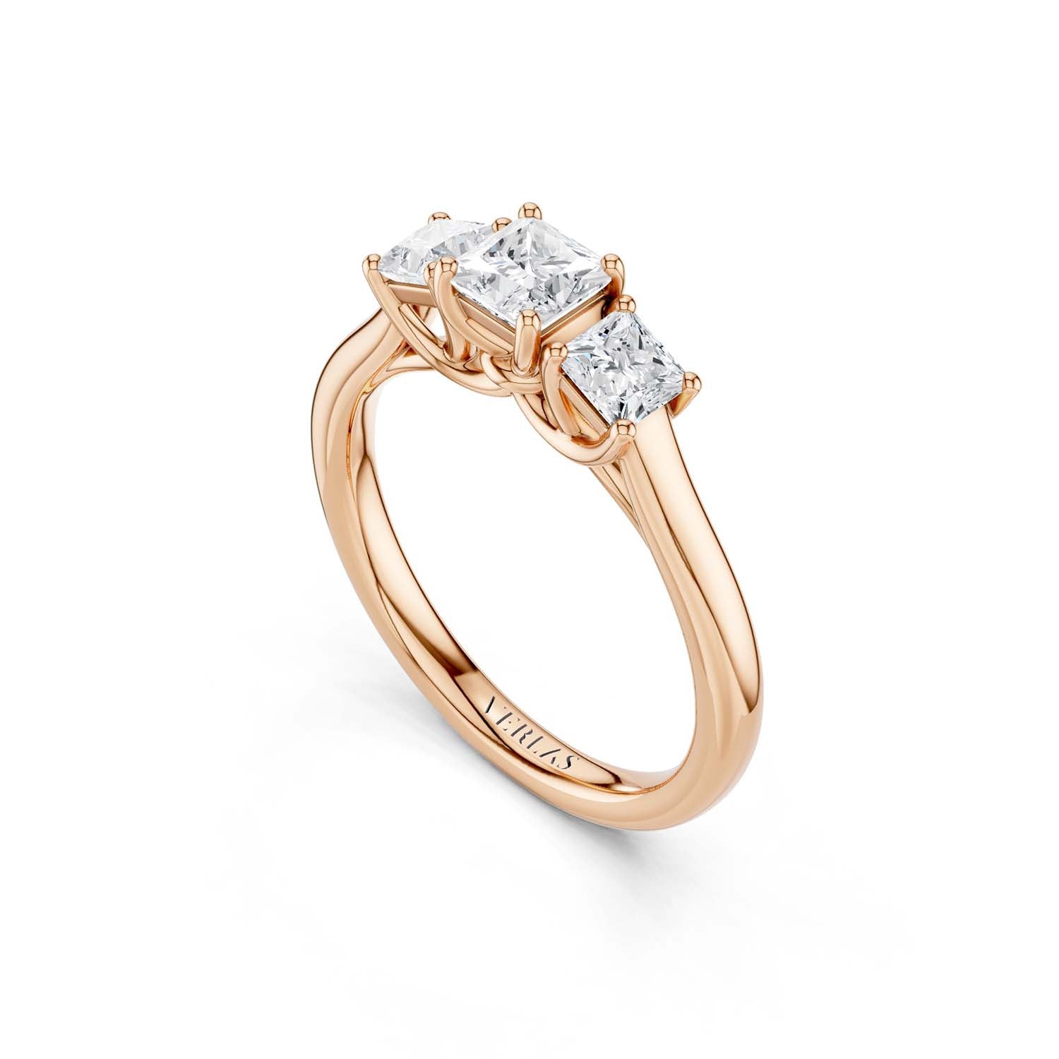 The Princess Vows diamond ring is classic, elegant, and iconic. It features three princess-cut diamonds placed next to each other on a gold ring in a prong setting. The princess vows design symbolizes love and commitment. The three princess-cut diamonds add sparkle and brilliance to the ring, making it a stunning statement piece to celebrate your love.