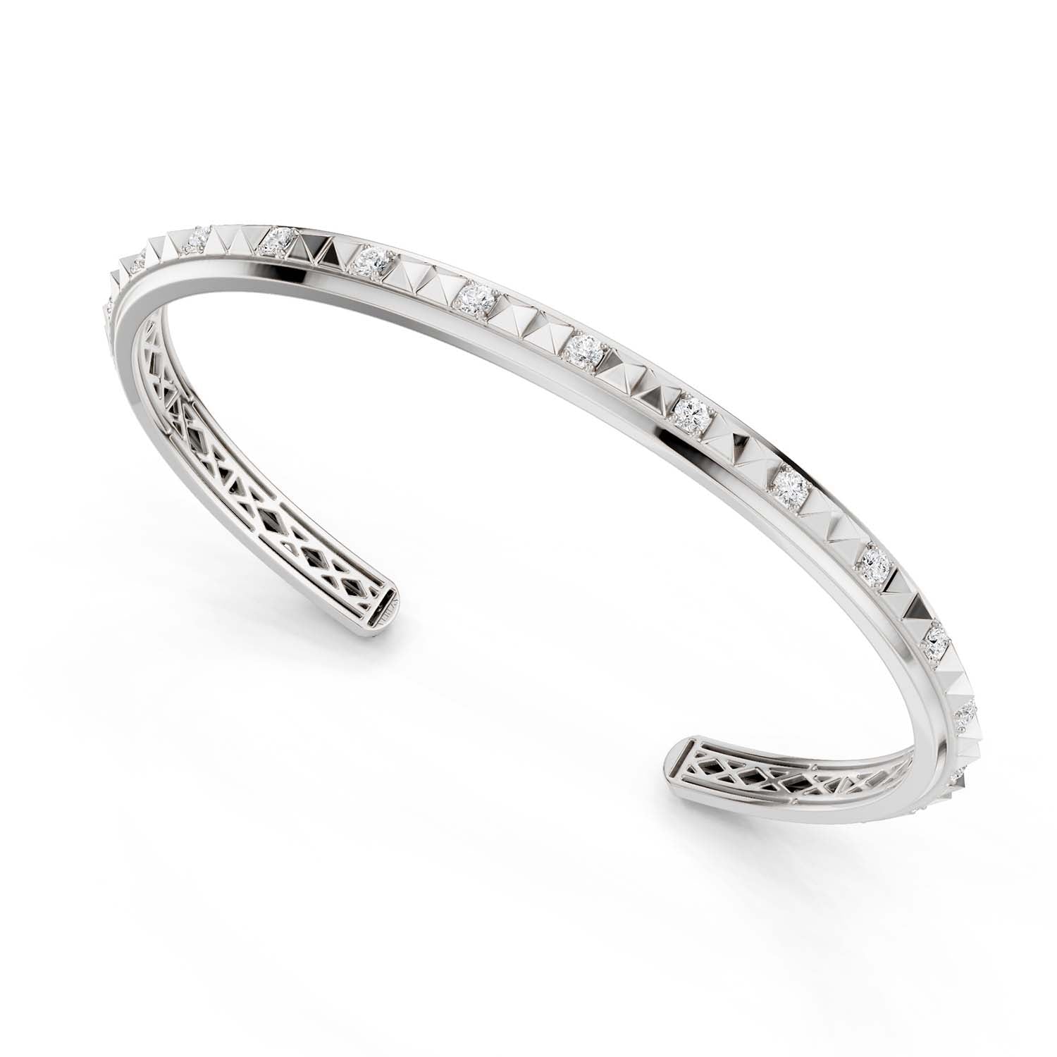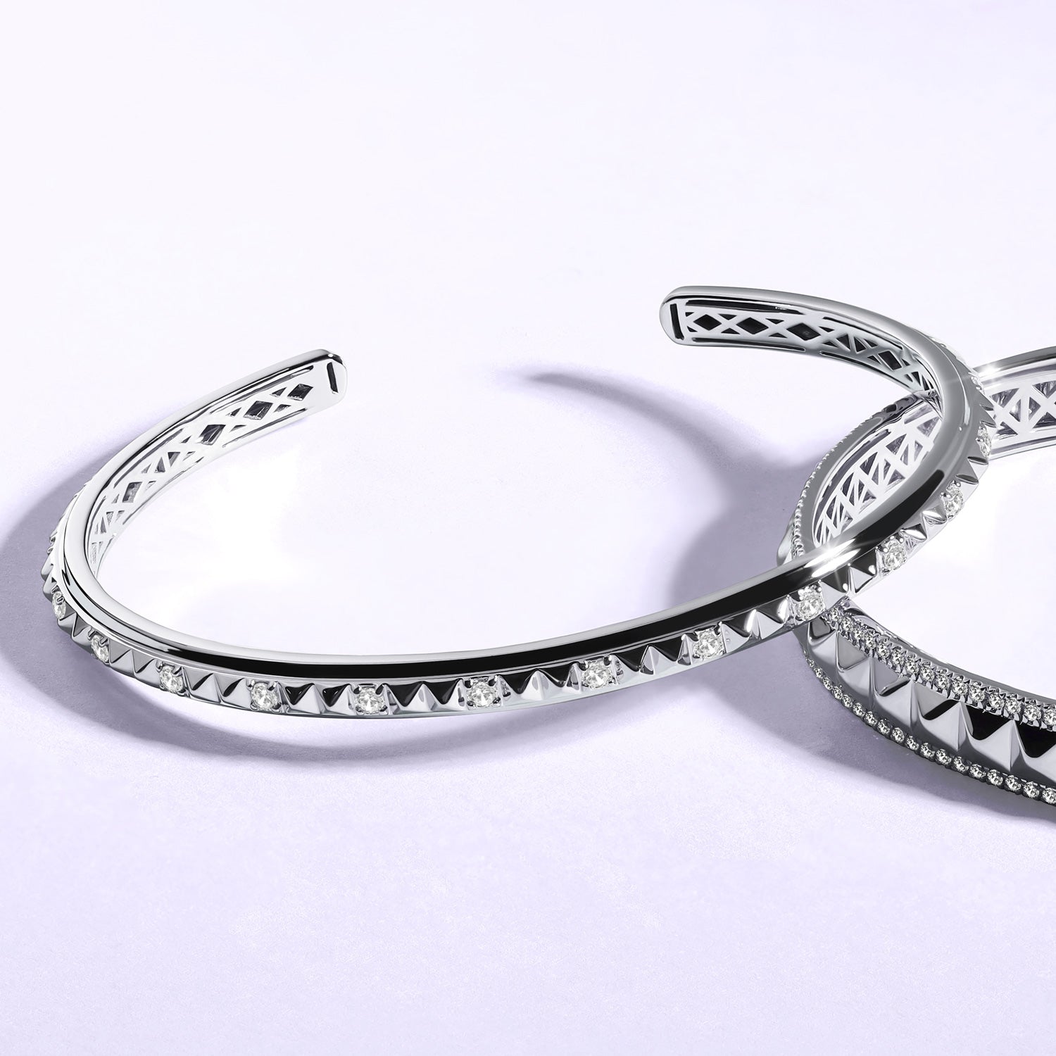 Discover the perfect blend of modern design and effortless elegance with our Pyramid Luxe Cuff Bracelet. This stunning piece is adorned with an array of embossed pyramid motifs that create a striking three-dimensional texture. Every two pyramid motifs are beautifully complemented by a round lab-grown diamond, adding a touch of sparkle that contrasts perfectly with the matte finish of the cuff. Its open-ended design ensures a comfortable fit, allowing you to adjust it to your wrist size with ease. Whether you're dressing up for a special occasion or adding flair to your everyday outfit, this diamond bracelet is your go-to statement piece.