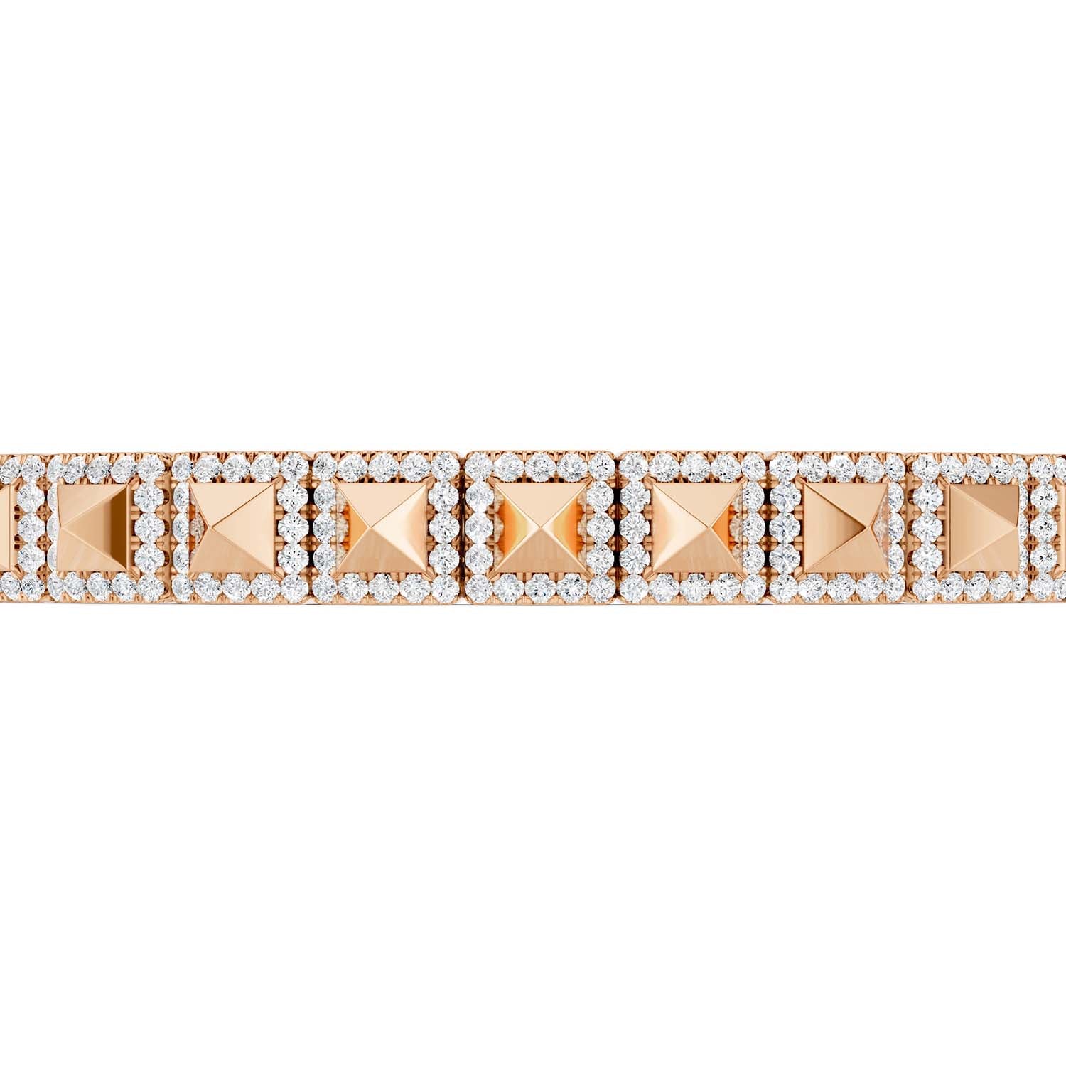 Introducing the Pyramid Luxe Geometric Bangle. This stunning diamond bangle showcases a row of three-dimensional pyramids in square-shaped settings along the top half, each adorned with lab-grown diamonds for a sharp and contemporary look. The design exudes elegance and modernity, with a geometric flair created by the square settings that offer a striking contrast to the smooth circular shape of the bangle. Elevate your style with this sophisticated and eye-catching piece.