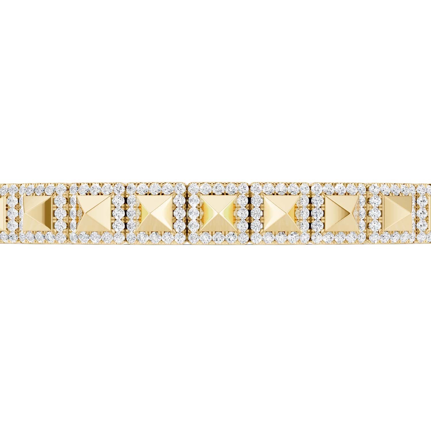 Introducing the Pyramid Luxe Geometric Bangle. This stunning diamond bangle showcases a row of three-dimensional pyramids in square-shaped settings along the top half, each adorned with lab-grown diamonds for a sharp and contemporary look. The design exudes elegance and modernity, with a geometric flair created by the square settings that offer a striking contrast to the smooth circular shape of the bangle. Elevate your style with this sophisticated and eye-catching piece.