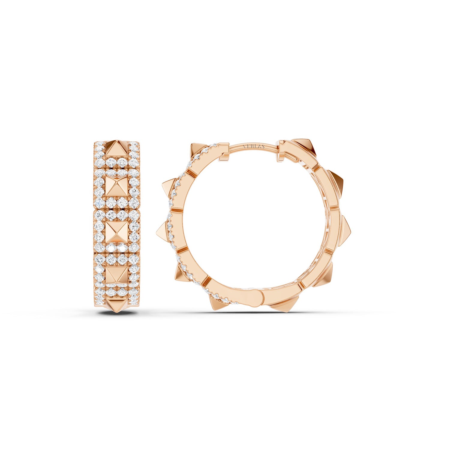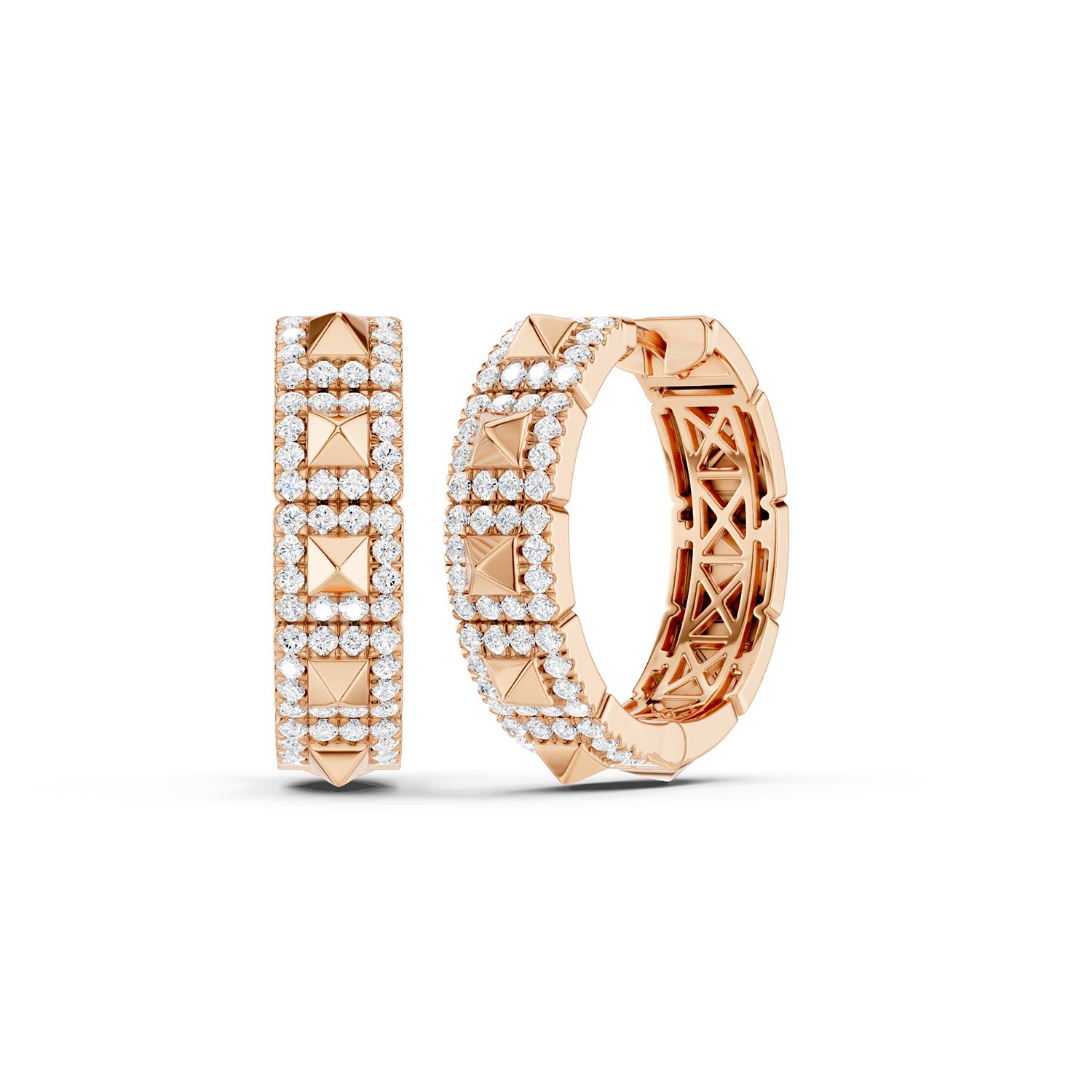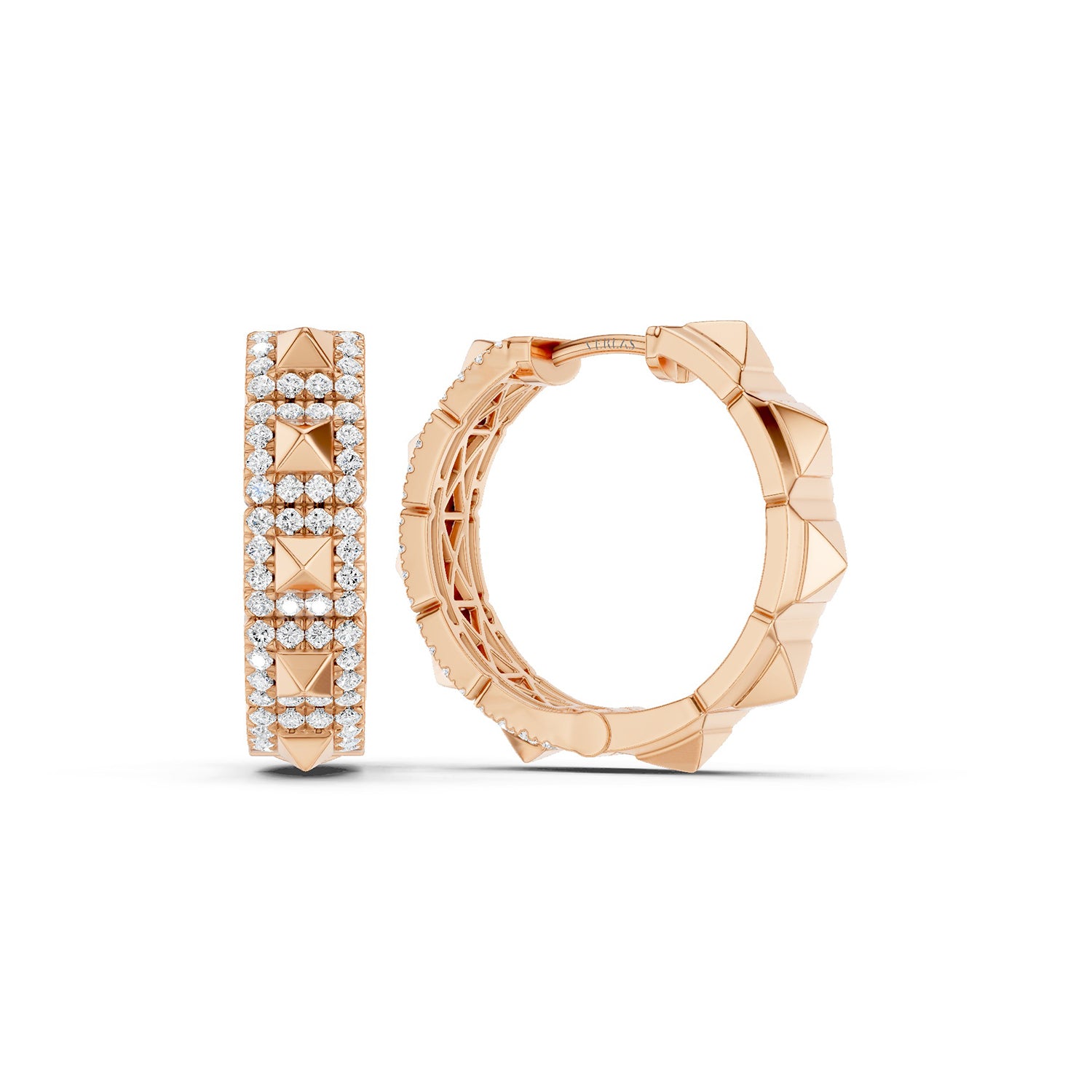Step into the spotlight with the Pyramid Luxe Geometric Huggies, a stunning fusion of contemporary elegance and timeless beauty. These exquisite diamond huggie hoops showcase a row of three-dimensional pyramids set within square-shaped settings, creating a unique geometric appeal that’s sure to turn heads. Each pyramid motif is surrounded by sparkling round lab-grown diamonds, enhancing the luxurious look and adding a touch of brilliance to your ensemble. Designed for both comfort and style, these huggie hoops are perfect for everyday wear or special occasions. Their secure closure ensures a snug fit, while the captivating design allows you to express your individuality effortlessly.