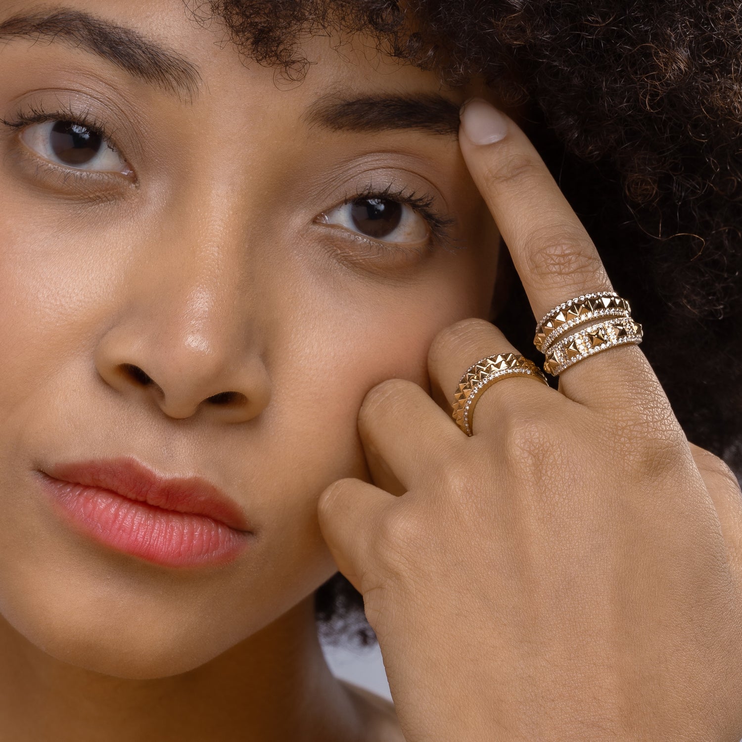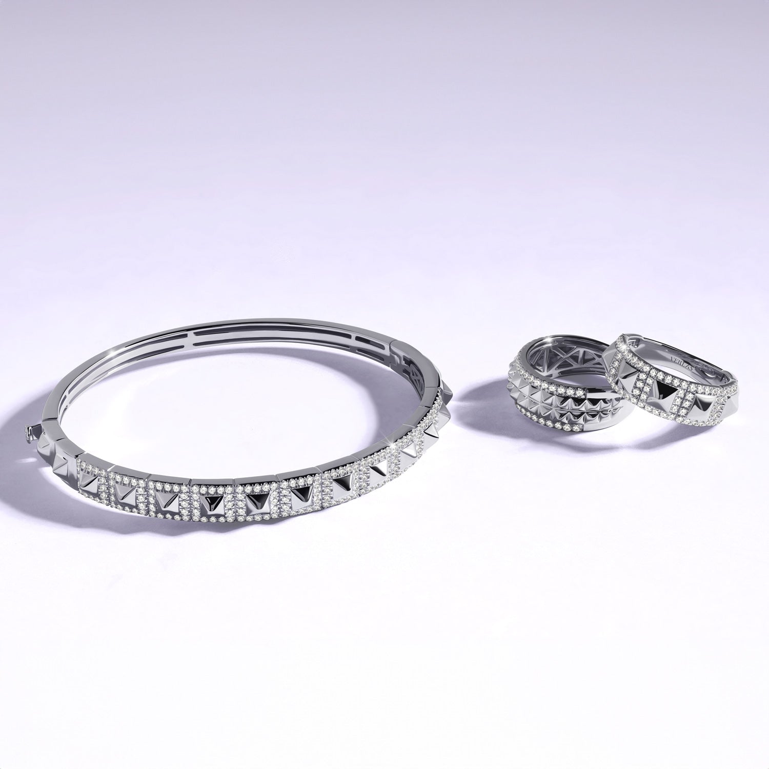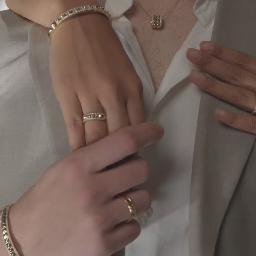 Make a bold statement with the Pyramid Luxe Geometric Statement Band, where contemporary design meets timeless elegance. This striking band showcases a captivating interplay of three-dimensional pyramid-like shapes, and rectangular sections, all polished to perfection. The rectangular sections are beautifully encrusted with sparkling lab-grown diamonds, adding a touch of classic sophistication. With its striking size and dramatic sparkle, this band is ideal for those who love a bold, glamorous look that stands out from the crowd. Wear it as a standalone accessory or stack it for a more layered look.