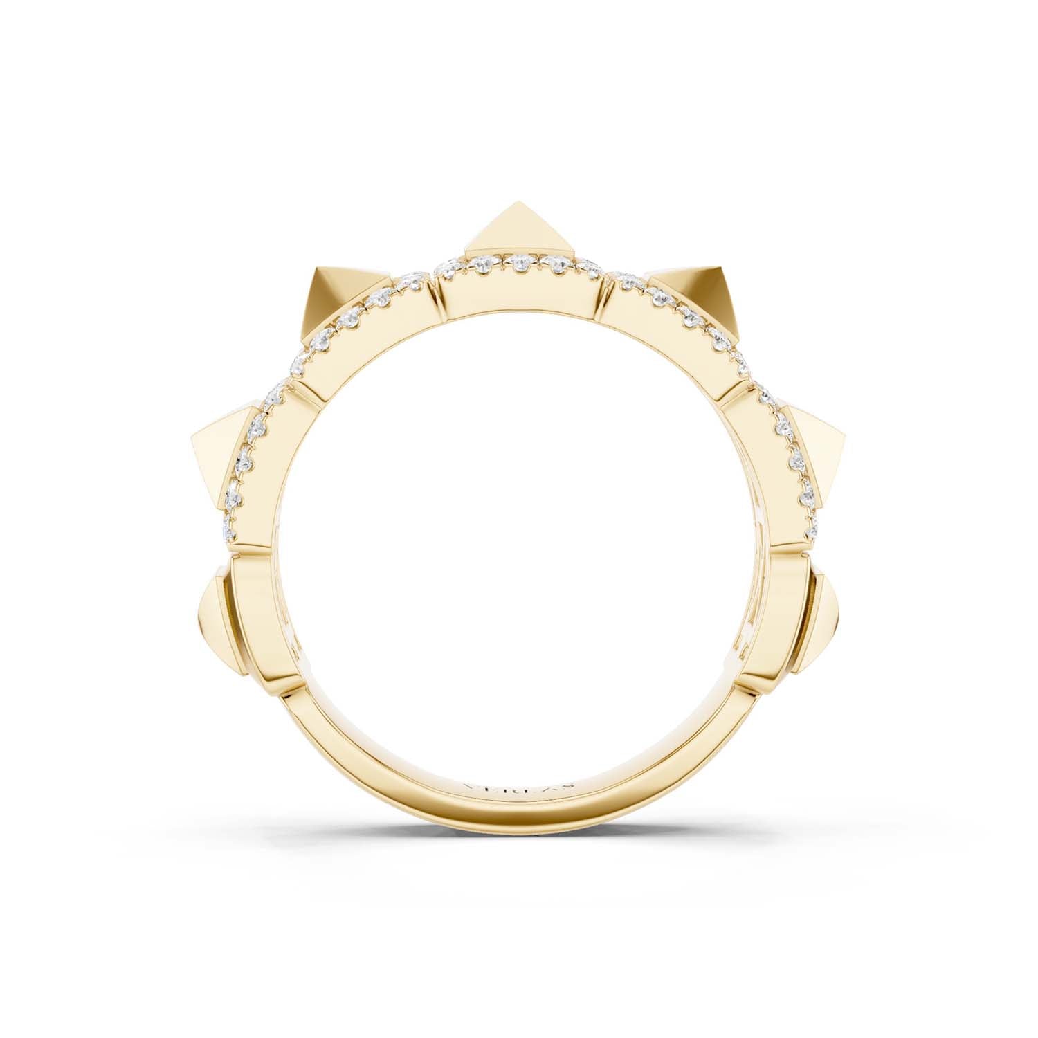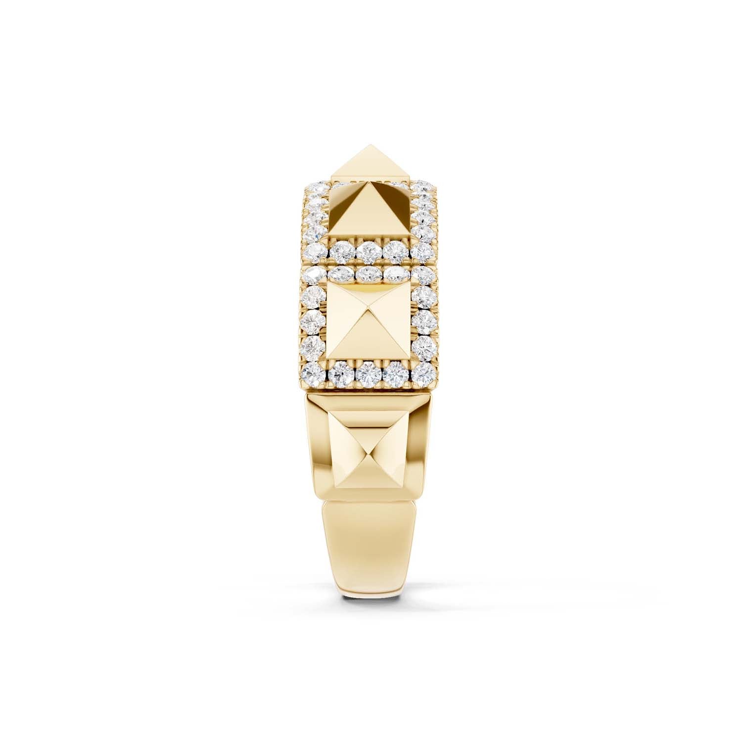 Make a bold statement with the Pyramid Luxe Geometric Statement Band, where contemporary design meets timeless elegance. This striking band showcases a captivating interplay of three-dimensional pyramid-like shapes, and rectangular sections, all polished to perfection. The rectangular sections are beautifully encrusted with sparkling lab-grown diamonds, adding a touch of classic sophistication. With its striking size and dramatic sparkle, this band is ideal for those who love a bold, glamorous look that stands out from the crowd. Wear it as a standalone accessory or stack it for a more layered look.