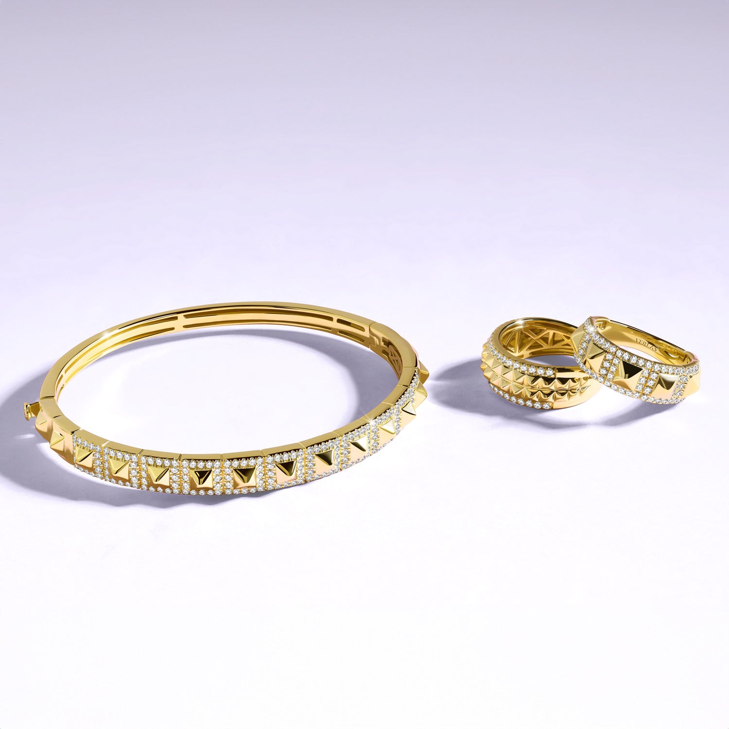 Make a bold statement with the Pyramid Luxe Geometric Statement Band, where contemporary design meets timeless elegance. This striking band showcases a captivating interplay of three-dimensional pyramid-like shapes, and rectangular sections, all polished to perfection. The rectangular sections are beautifully encrusted with sparkling lab-grown diamonds, adding a touch of classic sophistication. With its striking size and dramatic sparkle, this band is ideal for those who love a bold, glamorous look that stands out from the crowd. Wear it as a standalone accessory or stack it for a more layered look.