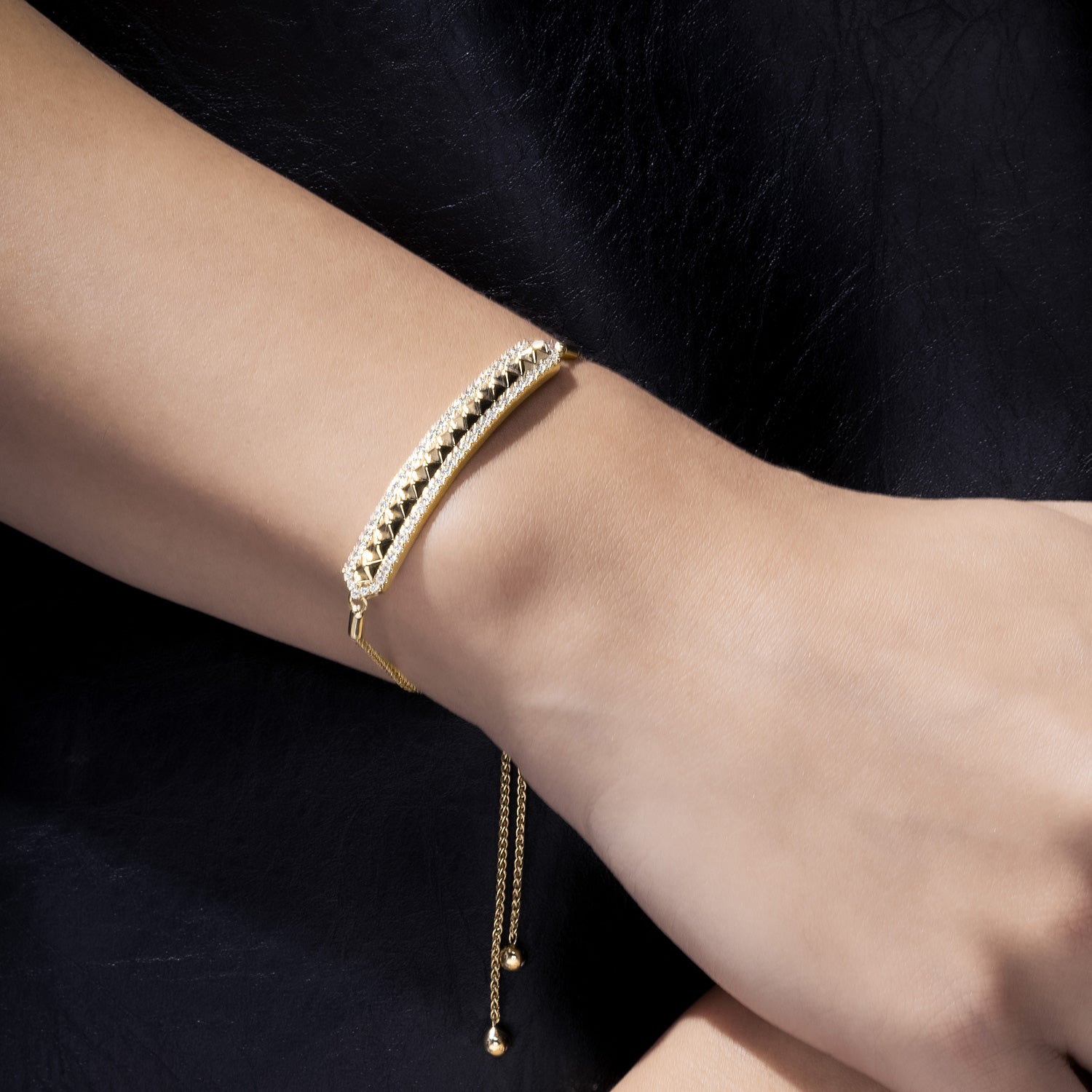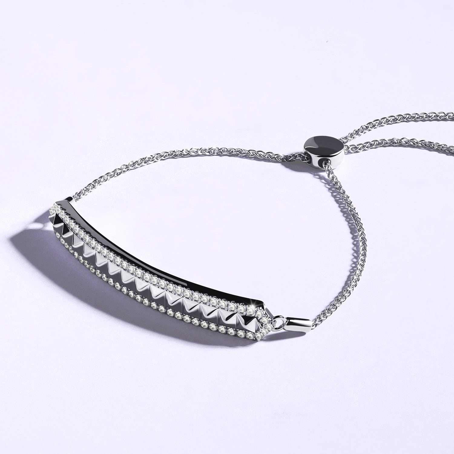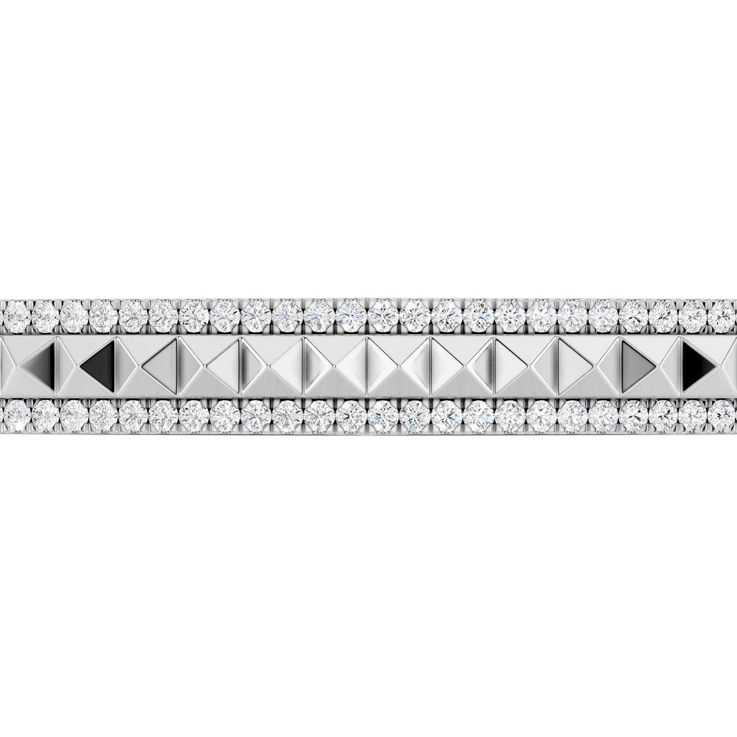 Discover your inner trendsetter with the Pyramid Spiked Diamond Bolo Bracelet, a stunning blend of architectural brilliance and modern sophistication. This striking cuff features a central bar, adorned with intricately arranged pyramid-like studs, introducing a playful texture that elevates its contemporary aesthetic. On either side of the central pyramids, two radiant rows of ethically sourced lab-grown diamonds add a touch of opulence, ensuring that this piece shines with every movement. This diamond bolo bracelet is a powerful statement of style and confidence, perfect for those who dare to stand out.