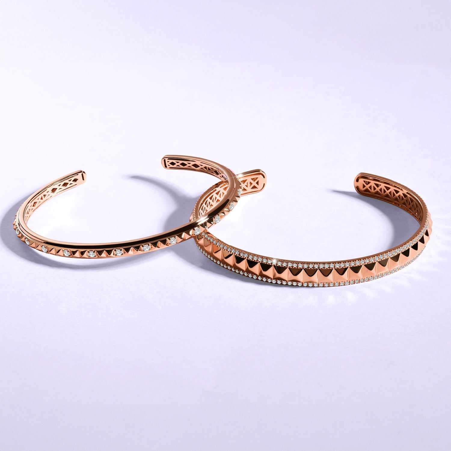 Step into the spotlight with the Pyramid Spiked Diamond Cuff Bracelet, where avant-garde design meets timeless elegance. This striking piece features a continuous row of bold pyramid motifs that wrap around the cuff, symbolizing your unique style and confidence. Adorning the pyramids are two radiant rows of dazzling lab-grown diamonds that sparkle with every movement, ensuring you shine bright on any occasion. Perfect for the modern individual who values both artistry and sustainability, this diamond bracelet effortlessly enhances any outfit, making it an essential accessory for both casual outings and special events. Embrace your individuality and let this stunning cuff be your signature statement piece.