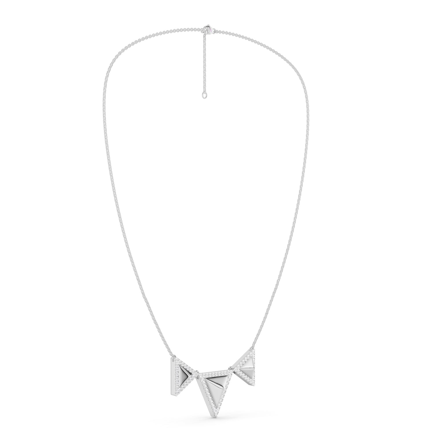 This Pyramid Trois Pendant Necklace features three pyramid motifs arranged in a horizontal line, creating a striking focal point. Each pyramid boasts an equilateral triangle base, connected at the base for a symmetrical and balanced appearance. The central pyramid is slightly larger than the two flanking it, enhancing the visual appeal and adding a sophisticated touch. Adorned along the edges with stunning lab-grown diamonds, this pendant radiates elegance and catches the light with every movement. Whether you're dressing up for a special occasion or adding a chic touch to your everyday outfit, this diamond pendant necklace is the ideal accessory to express your unique style.