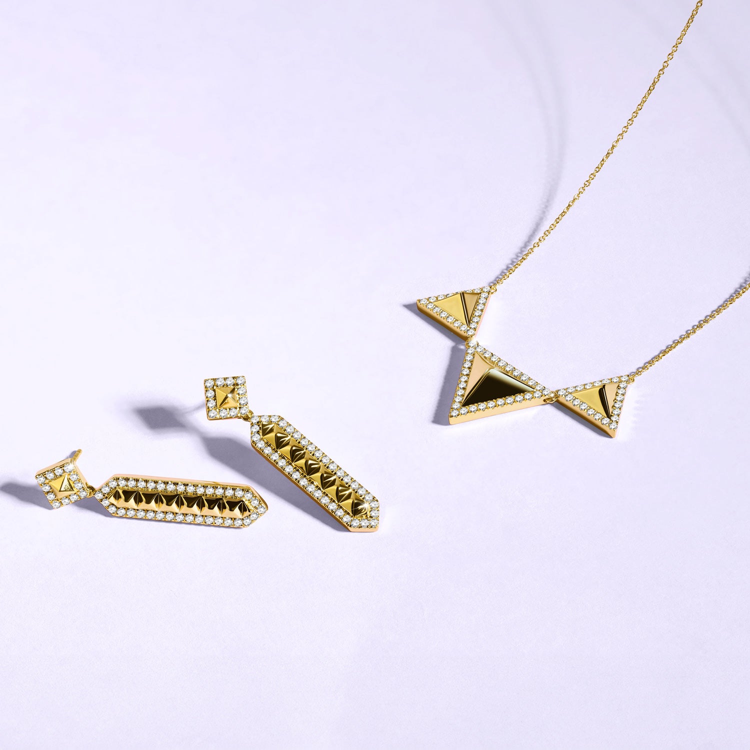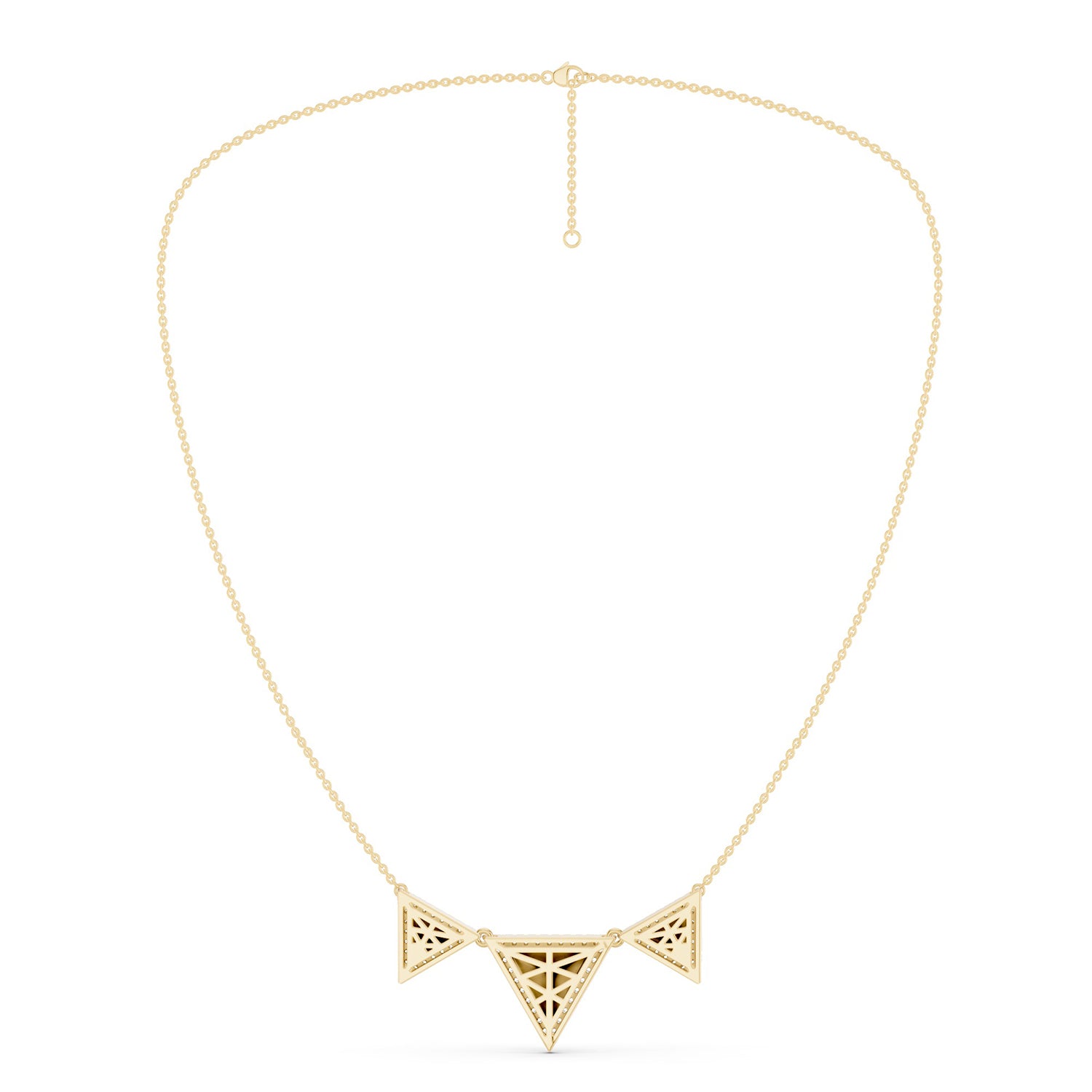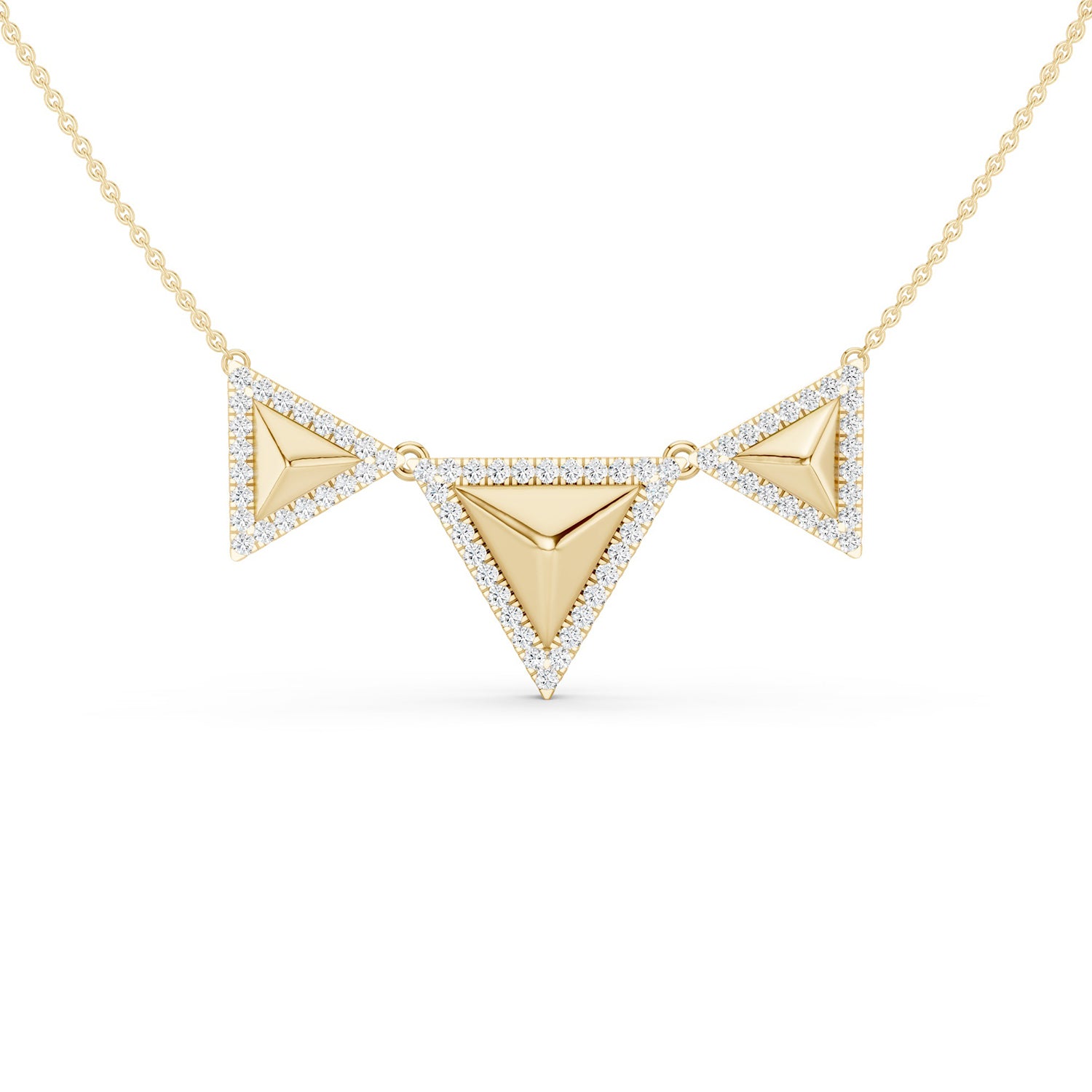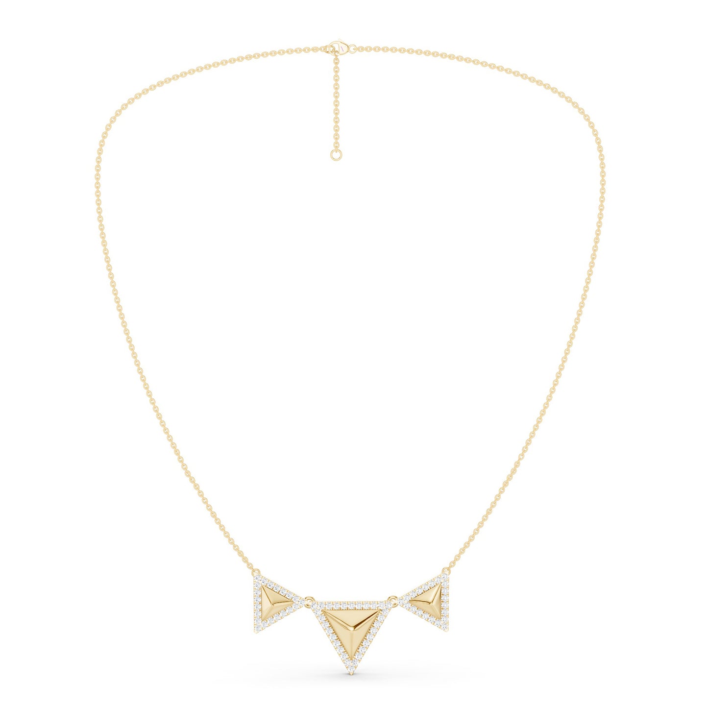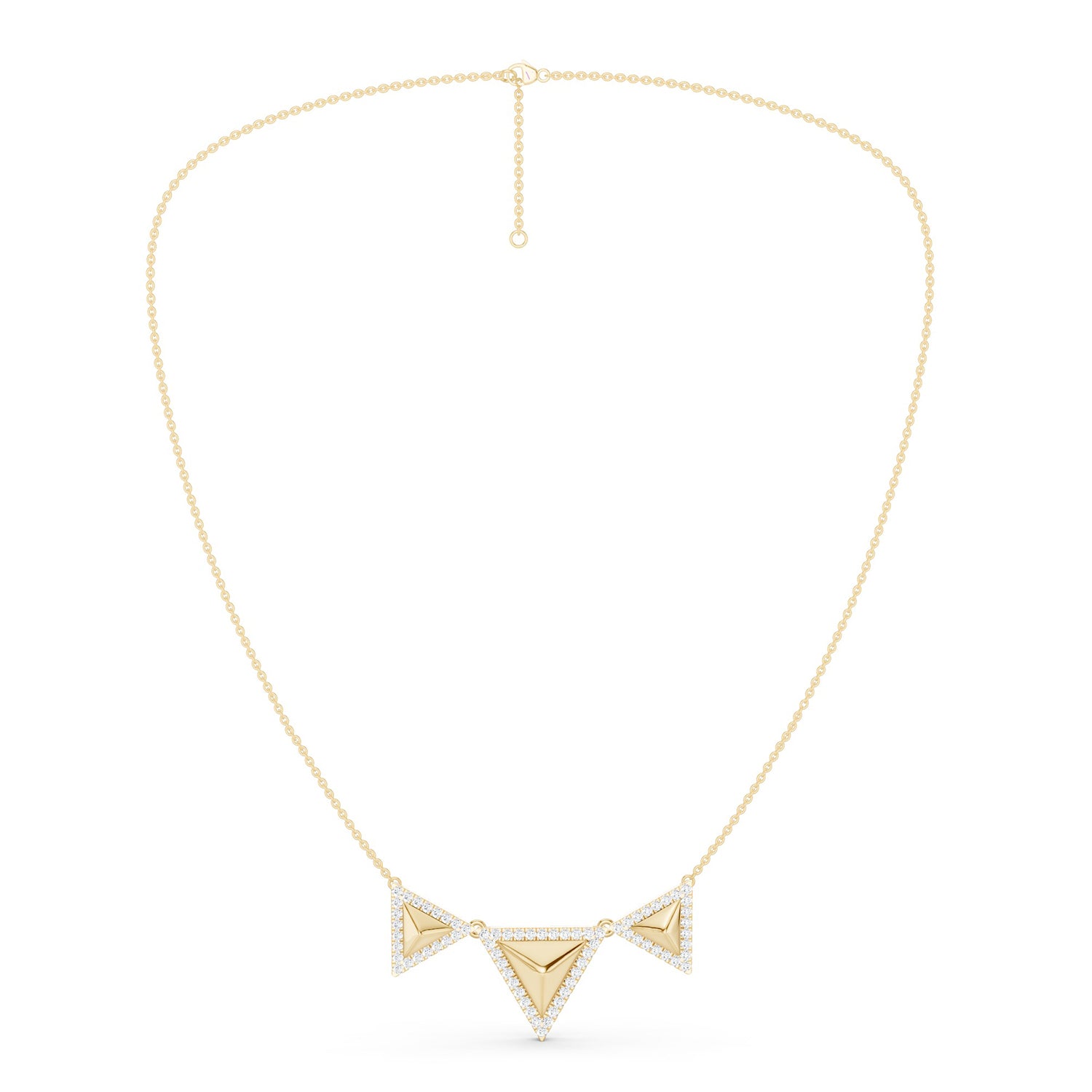 This Pyramid Trois Pendant Necklace features three pyramid motifs arranged in a horizontal line, creating a striking focal point. Each pyramid boasts an equilateral triangle base, connected at the base for a symmetrical and balanced appearance. The central pyramid is slightly larger than the two flanking it, enhancing the visual appeal and adding a sophisticated touch. Adorned along the edges with stunning lab-grown diamonds, this pendant radiates elegance and catches the light with every movement. Whether you're dressing up for a special occasion or adding a chic touch to your everyday outfit, this diamond pendant necklace is the ideal accessory to express your unique style.